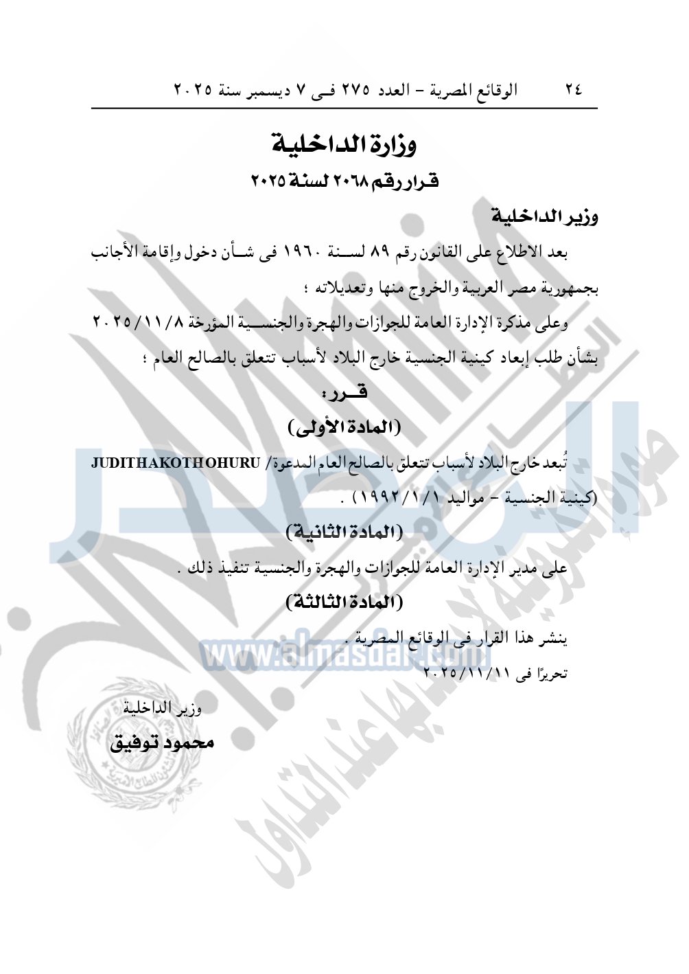 كما نشرت الوقائع المصرية في العدد 275، الصادر في 7 ديسمبر سنة 2025، قرار وزارة الداخلية، قرار رقم 2068 لسنة 2025، بشأن إبعاد كينية الجنسية خارج البلاد.