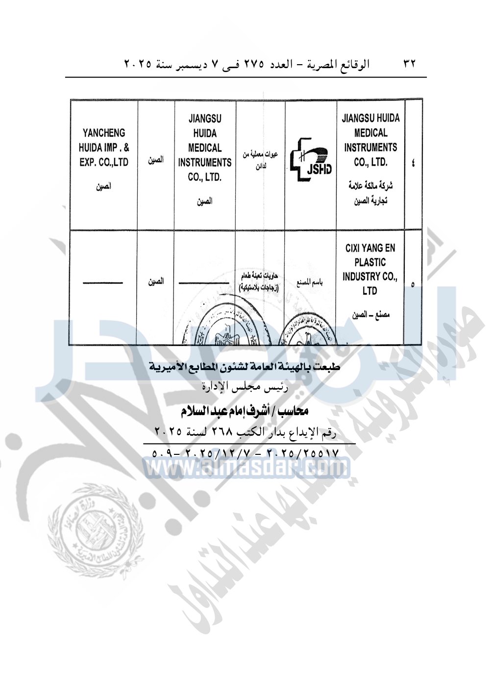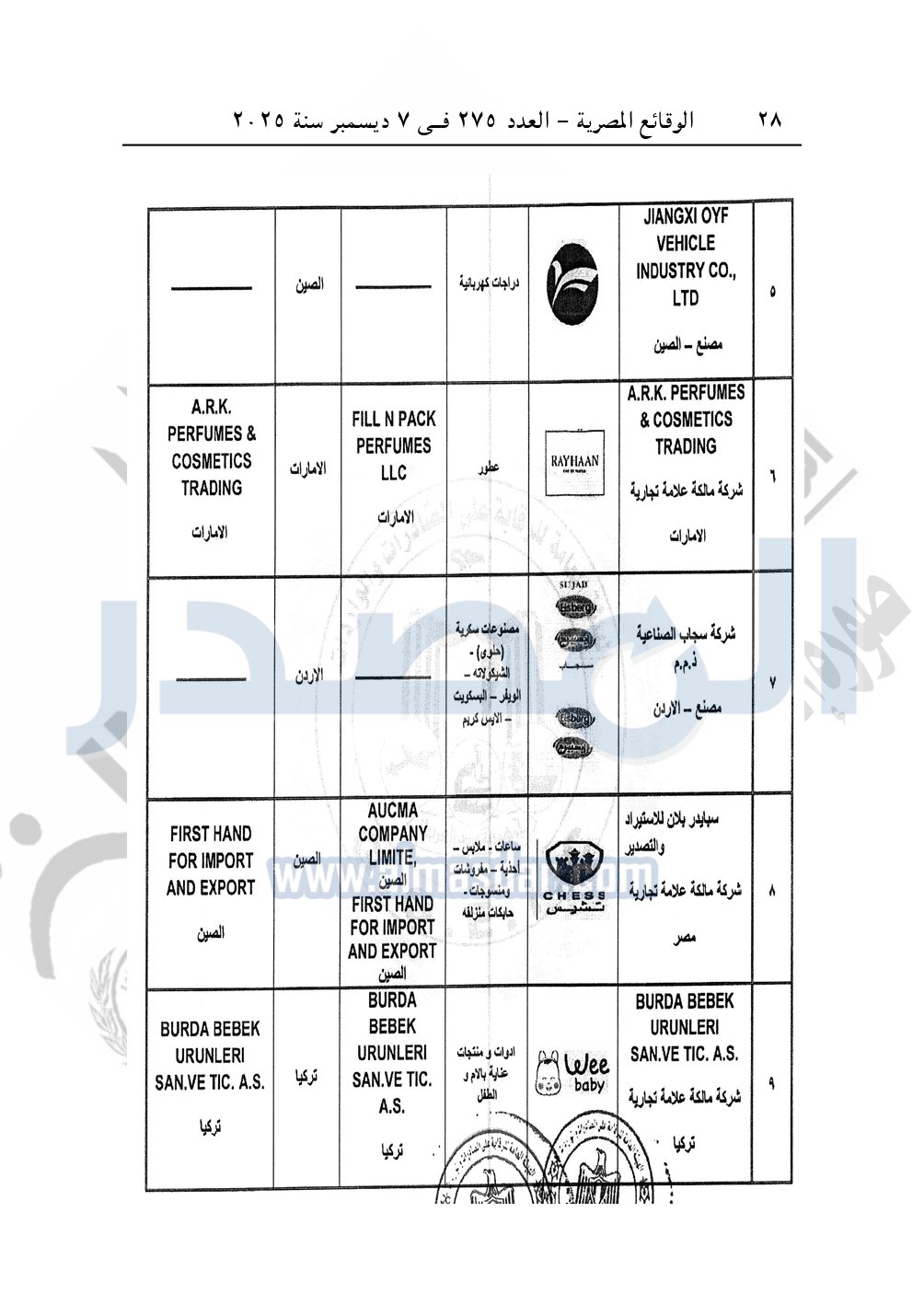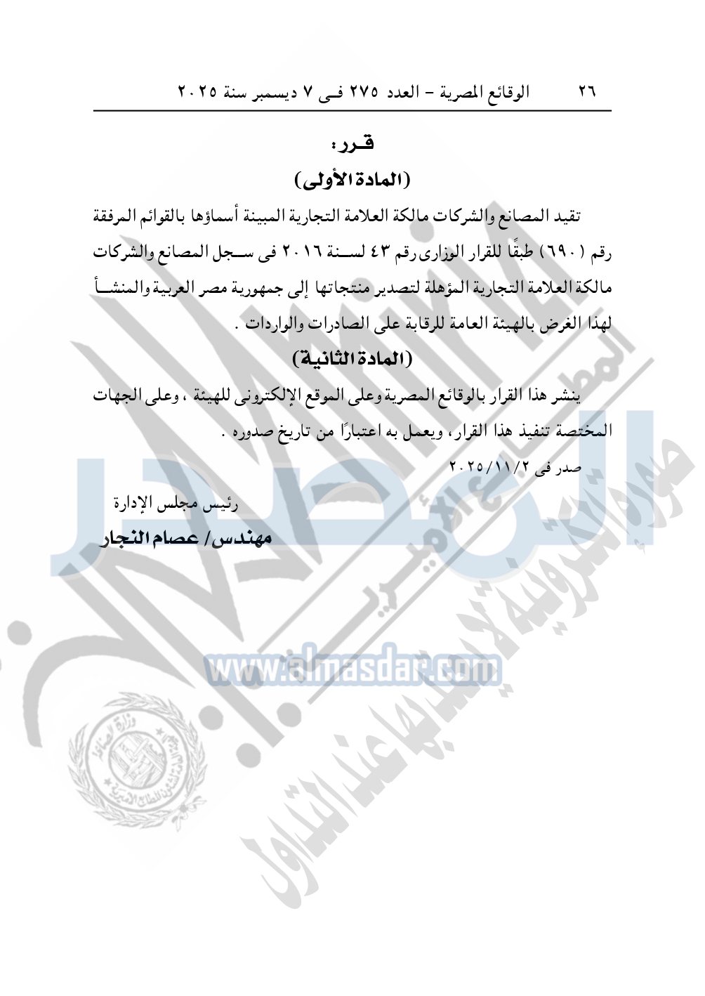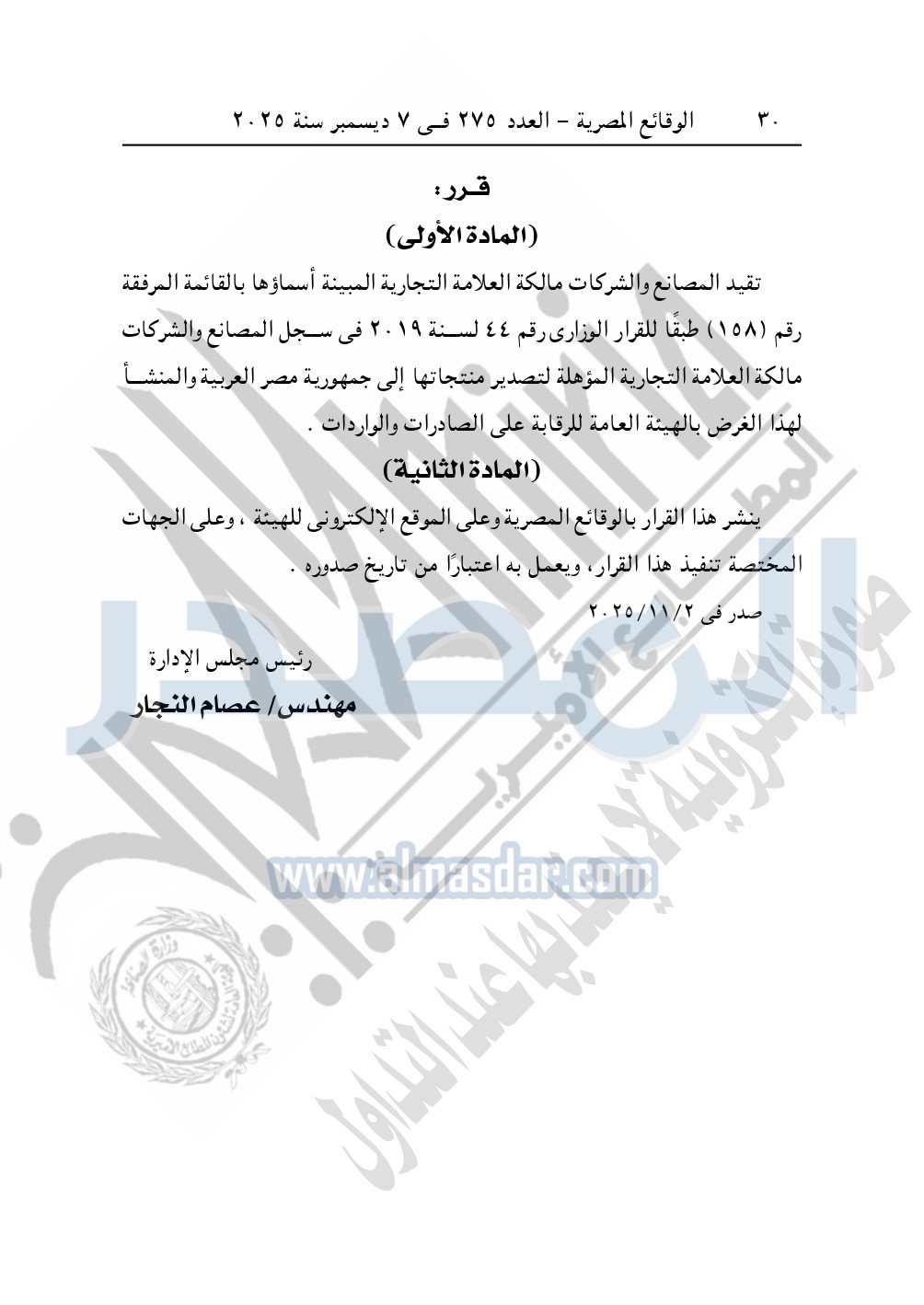 كما نشرت الوقائع المصرية في العدد 275، الصادر في 7 ديسمبر 2025، قرار الهيئة العامة للرقابة على الصادرات والواردات رقم 1324 لسنة 2025، بشأن قيد بعض المصانع والشركات مالكة العلامات التجارية المستوفاة لقواعد تسجيل المصانع المؤهلة لتصدير منتجاتها إلى جمهورية مصر العربية.