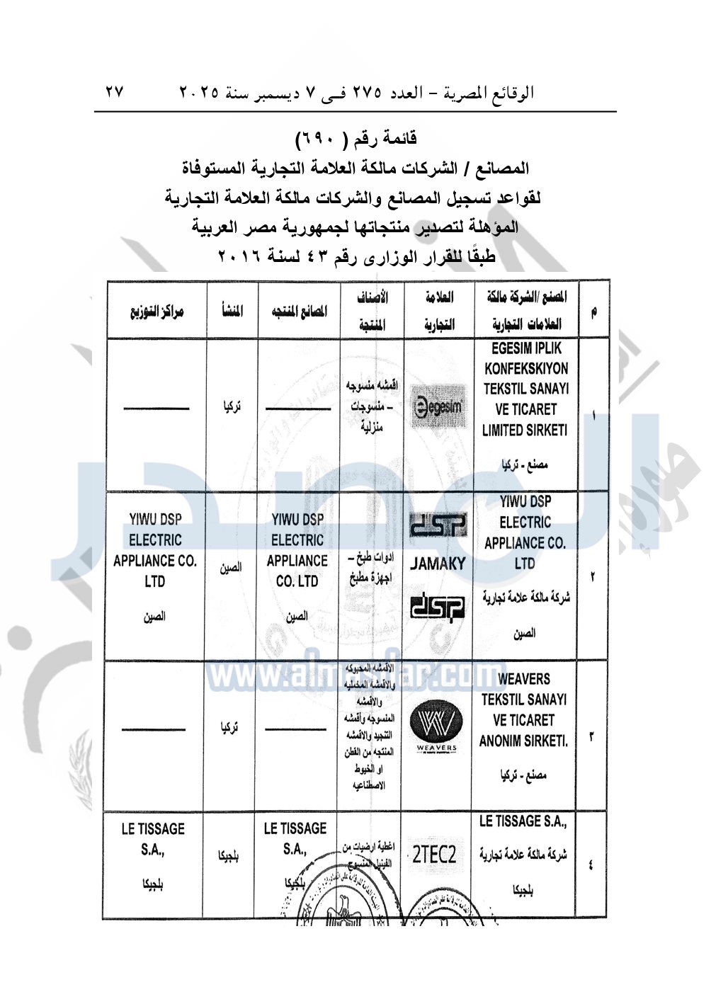 تقيد المصانع والشركات مالكة العلامة التجارية المبينة أسماؤها بالقوائم المرفقة رقم "690" طبقاً للقرار رقم 43 لسنة 2016 في سجل المصانع والشركات مالكة العلامة التجارية المؤهلة لتصدير منتجاتها إلى جمهورية مصر العربية والمنشأ لهذا الغرض بالهيئة العامة للرقابة على الصادرات والواردات.