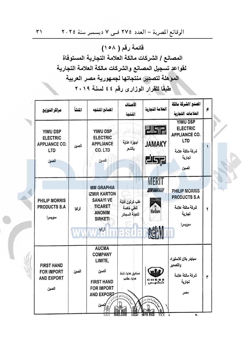 تقيد المصانع والشركات مالكة العلامة التجارية المبينة أسماؤها بالقوائم المرفقة رقم "158" طبقاً للقرار رقم 44 لسنة 2019 في سجل المصانع والشركات مالكة العلامة التجارية المؤهلة لتصدير منتجاتها إلى جمهورية مصر العربية والمنشأ لهذا الغرض بالهيئة العامة للرقابة على الصادرات والواردات.