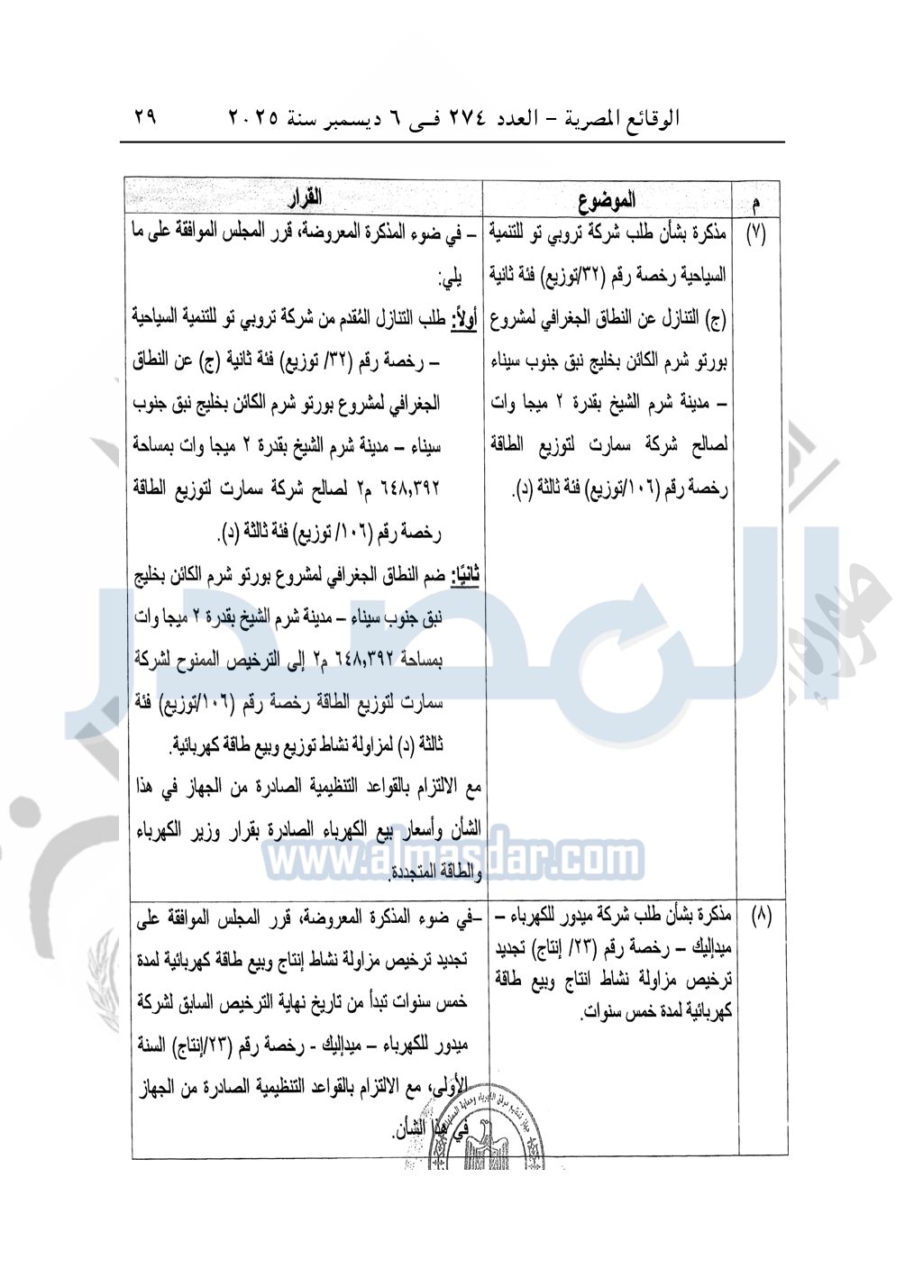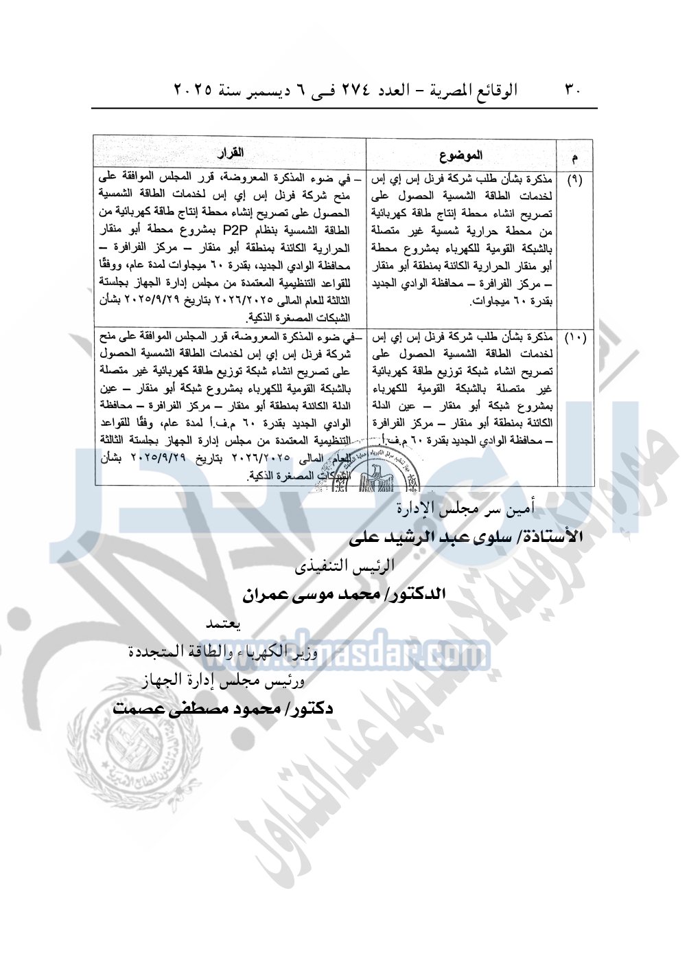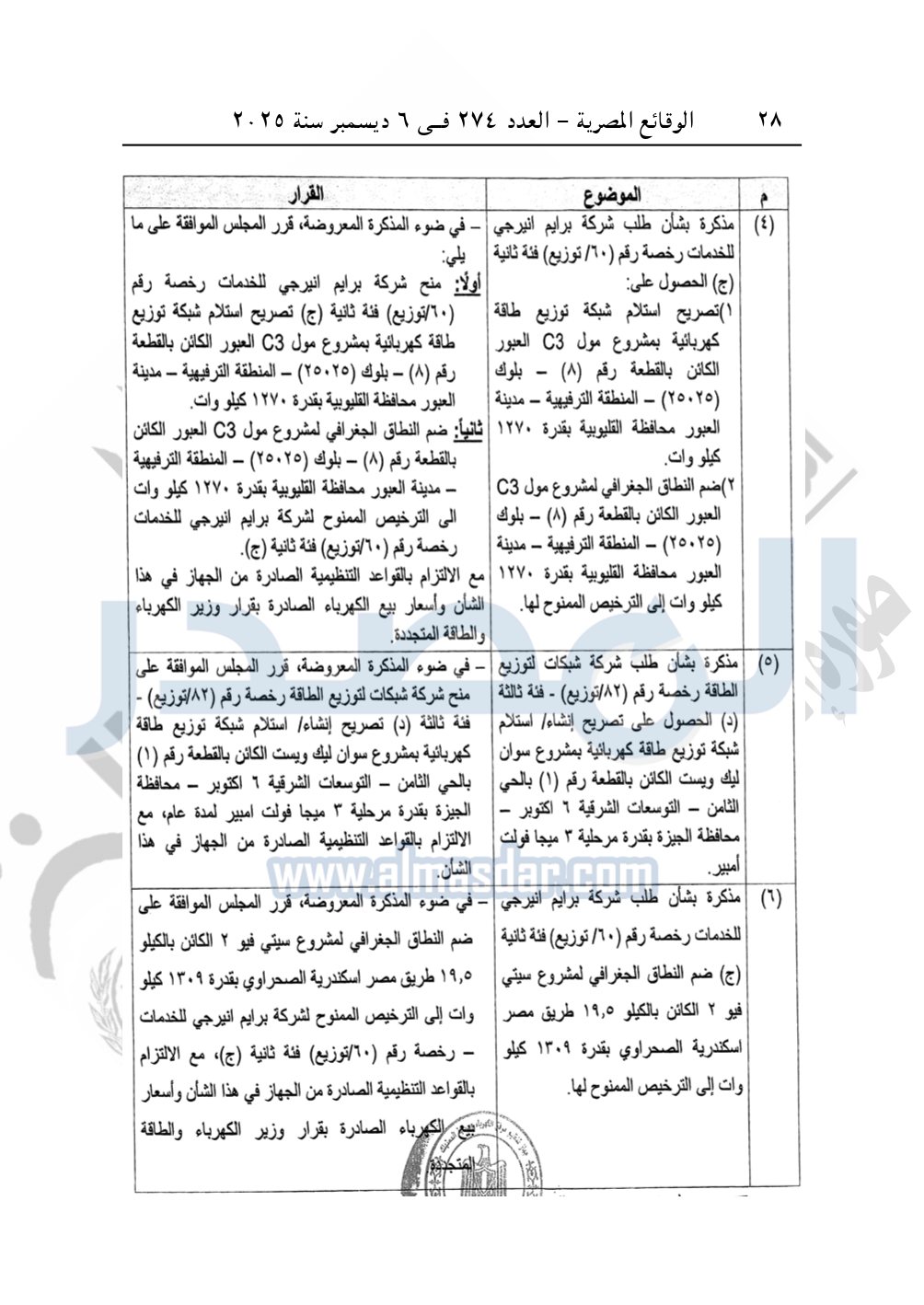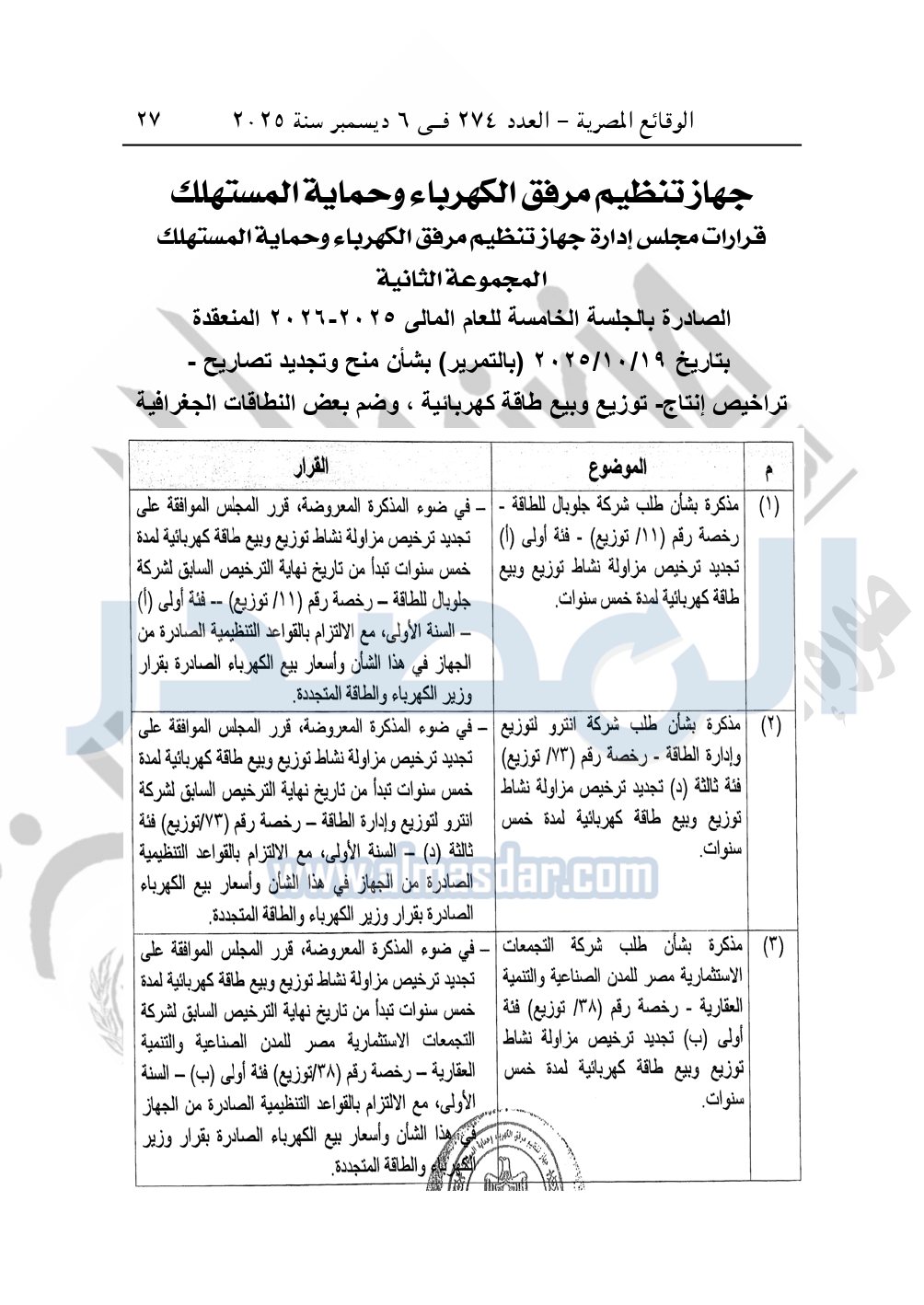 نشرت الوقائع المصرية في العدد 274، الصادر في 6 ديسمبر 2025، قرار جهاز تنظيم مرفق الكهرباء وحماية المستهلك، قرارات مجلس إدارة جهاز تنظيم مرفق الكهرباء وحماية المستهلك - المجموعة الثانية الصادرة بالجلسة الخامسة للعام المالي 2025-2026 المنعقدة بتاريخ 19-10-2025 "بالتمرير" بشأن منح وتجديد تصاريح - تراخيص إنتاج - توزيع وبيع طاقة كهربائية، وضم بعض النطاقات الجغرافية.