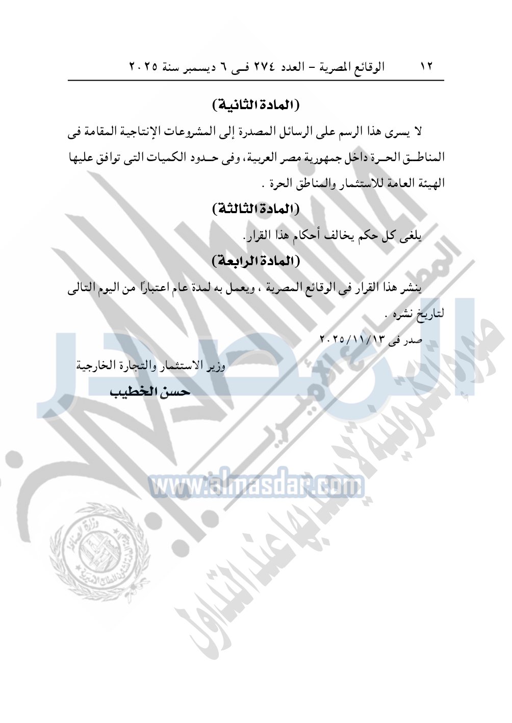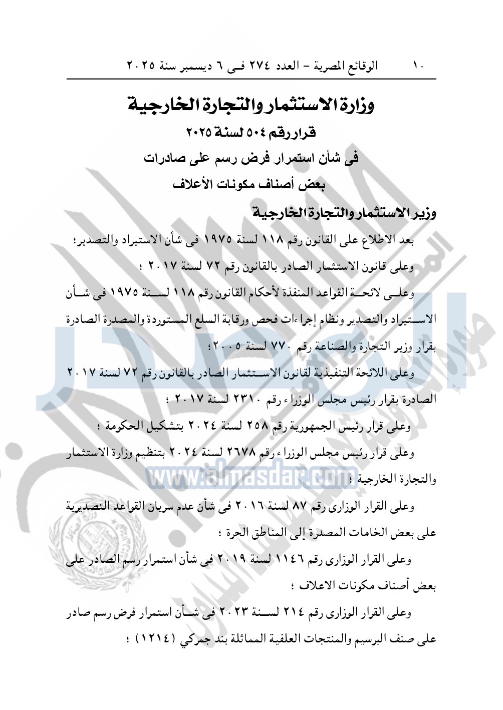 نشرت الوقائع المصرية في العدد 274، الصادر في 6 ديسمبر 2025، قرار وزارة الاستثمار والتجارة الخارجية، رقم 504 لسنة 2025، بشأن استمرار فرض رسم على صادرات بعض أصناف مكونات الأعلاف.