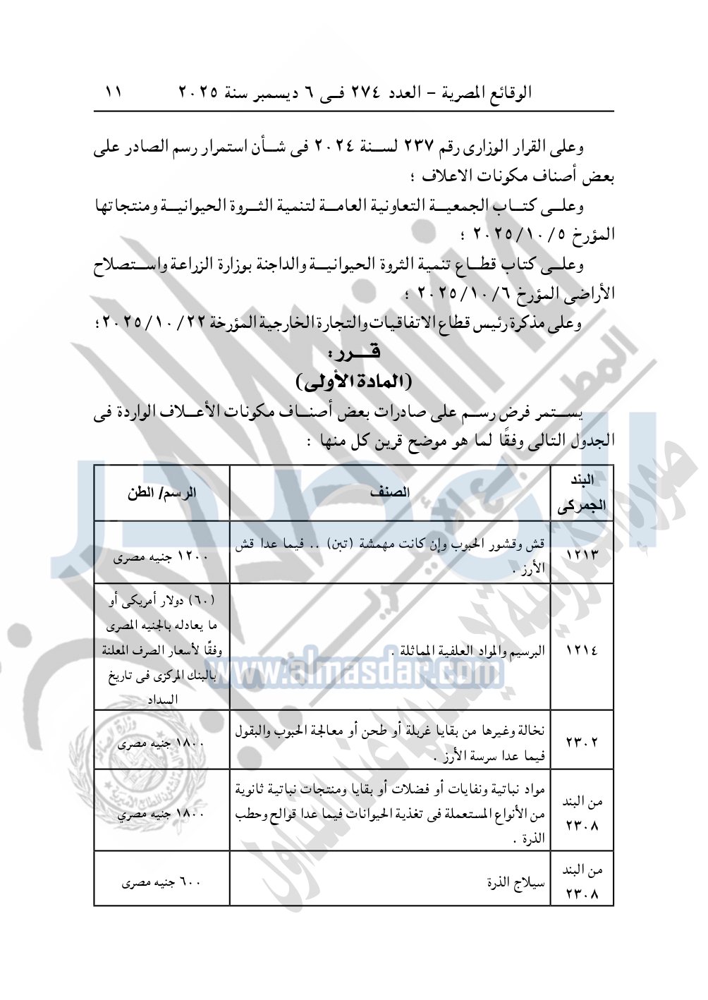 يستمر فرض رسم على صادرات بعض أصناف مكونات الأعلاف الواردة في وفقًا لما هو موضح قرين كل منها:
