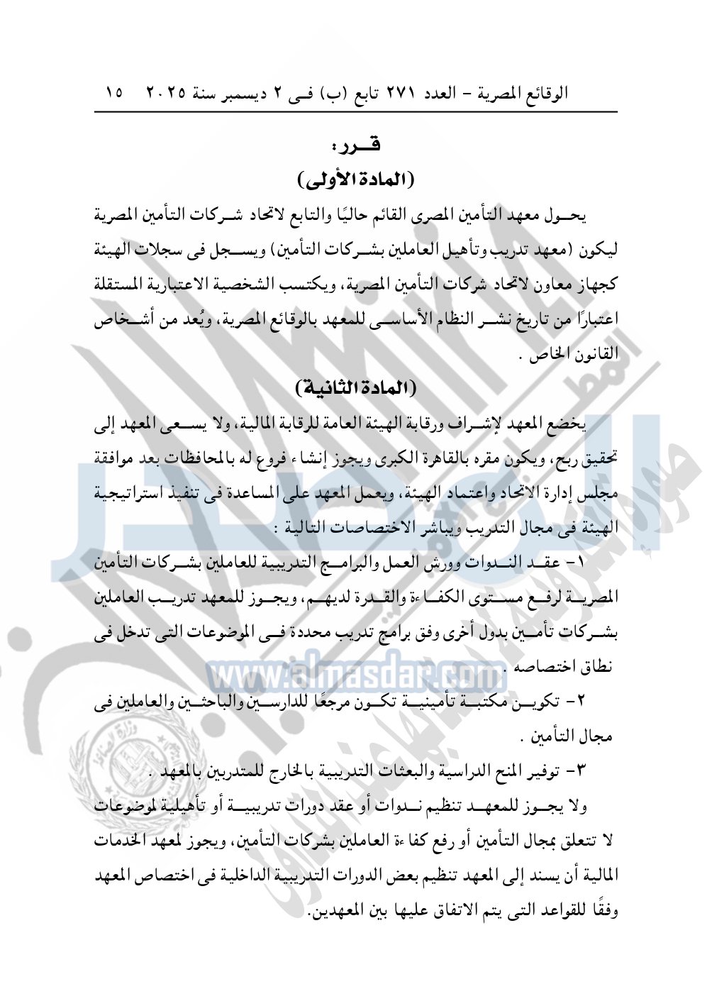 نشرت الوقائع المصرية في العدد 271 تابع "ب"، الصادر في 2 ديسمبر 2025، قرار الهيئة العامة للرقابة المالية، رقم 269 لسنة 2025 بشأن الضوابط والقواعد والإجراءات الخاصة بتحويل "معهد التأمين المصرى" ليكون "معهد تدريب وتأهيل العاملين بشركات التأمين".