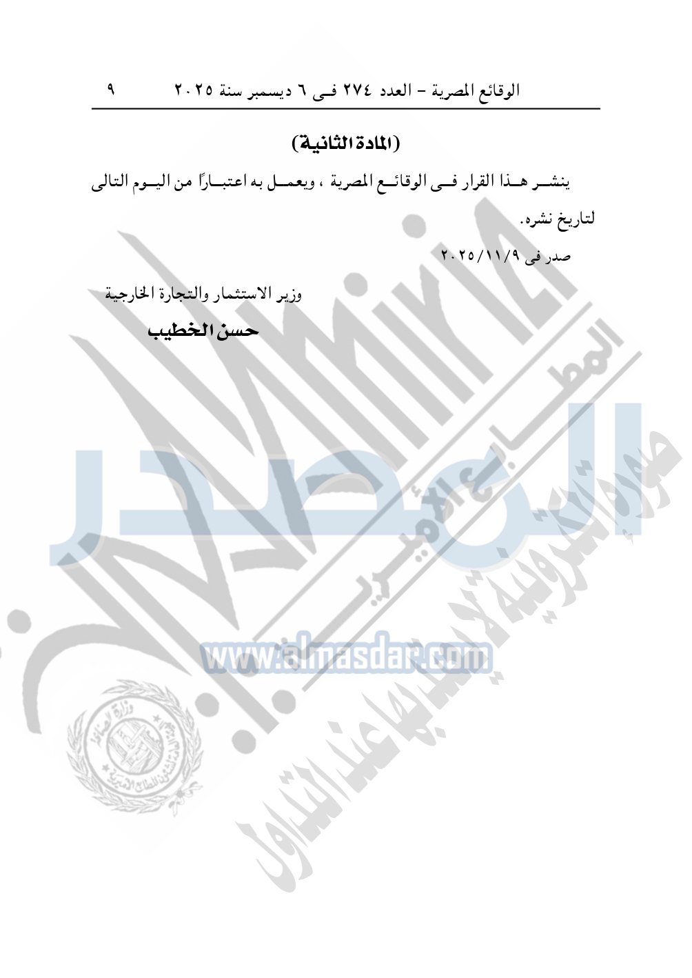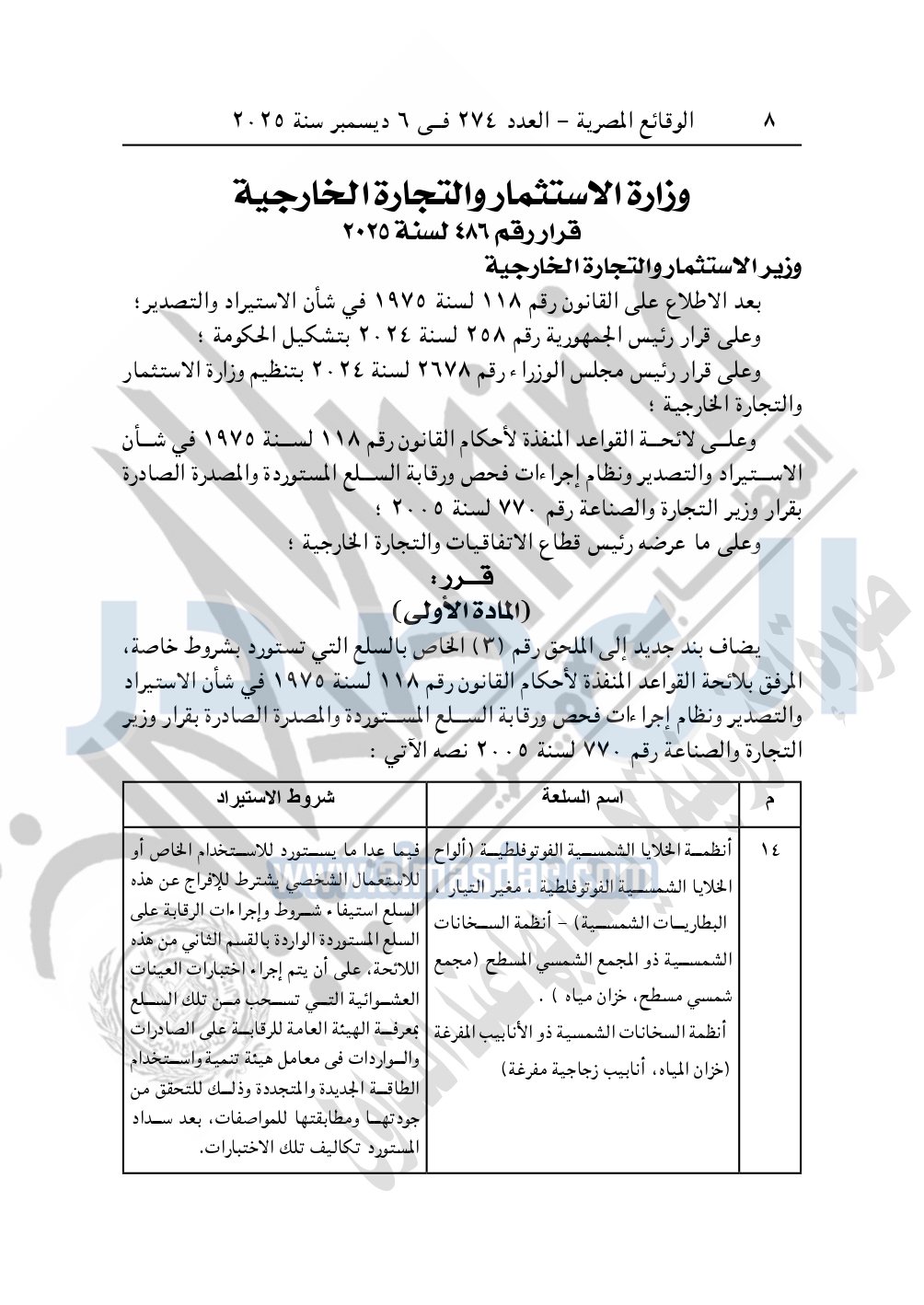 نشرت الوقائع المصرية في العدد 274، الصادر في 6 ديسمبر 2025، قرار وزارة الاستثمار والتجارة الخارجية، رقم 486 لسنة 2025، بشأن تعديل شروط استيراد أنظمة الخلايا الشمسية.