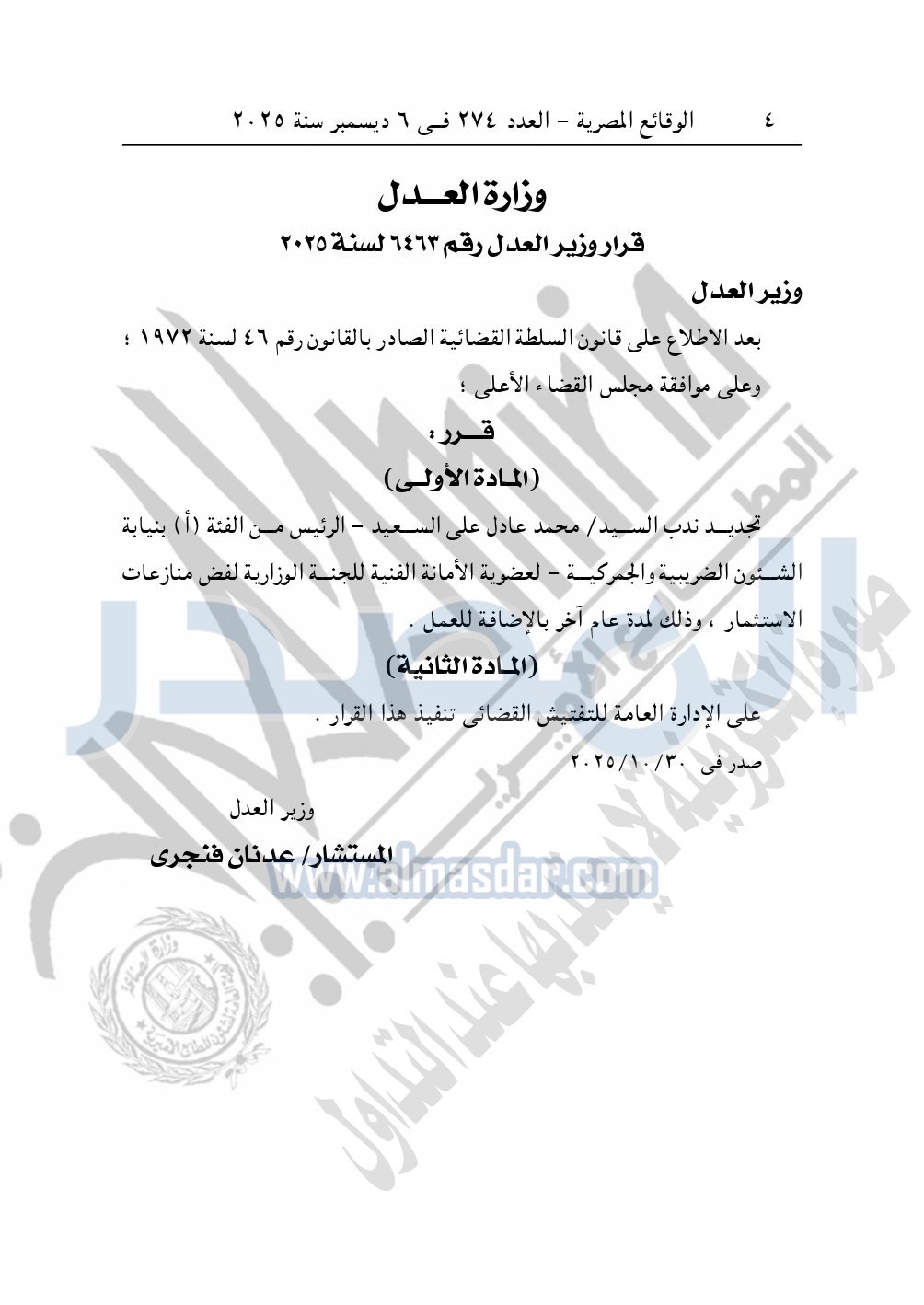 نشرت الوقائع المصرية، العدد 274، الصادر في 6 ديسمبر سنة 2025، قرار وزارة العدل، رقم 6463 لسنة 2025، بشأن تجديد ندب محمد عادل على السعيد.