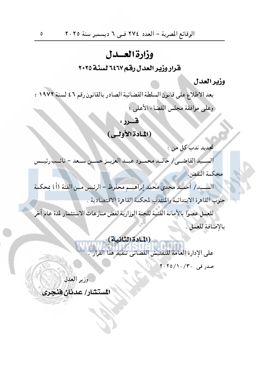 كما نشرت الوقائع المصرية، العدد 274، الصادر في 6 ديسمبر سنة 2025، قرار وزارة العدل، رقم 6467 لسنة 2025، بشأن تجديد ندب القاضي خالد محمود عبد العزيز حسن سعد وأحمد مجدى محمد إبراهيم محفوظ.