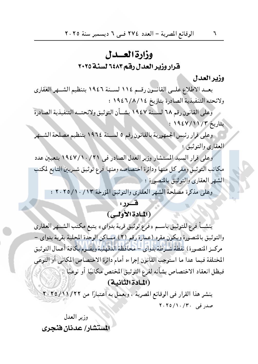 نشرت الوقائع المصرية، العدد 274، الصادر في 6 ديسمبر سنة 2025، قرار وزارة العدل، رقم 6483 لسنة 2025، بشأن إنشاء فرع للتوثيق باسم "فرع توثيق قرية بدواى".