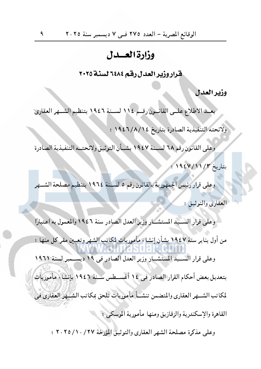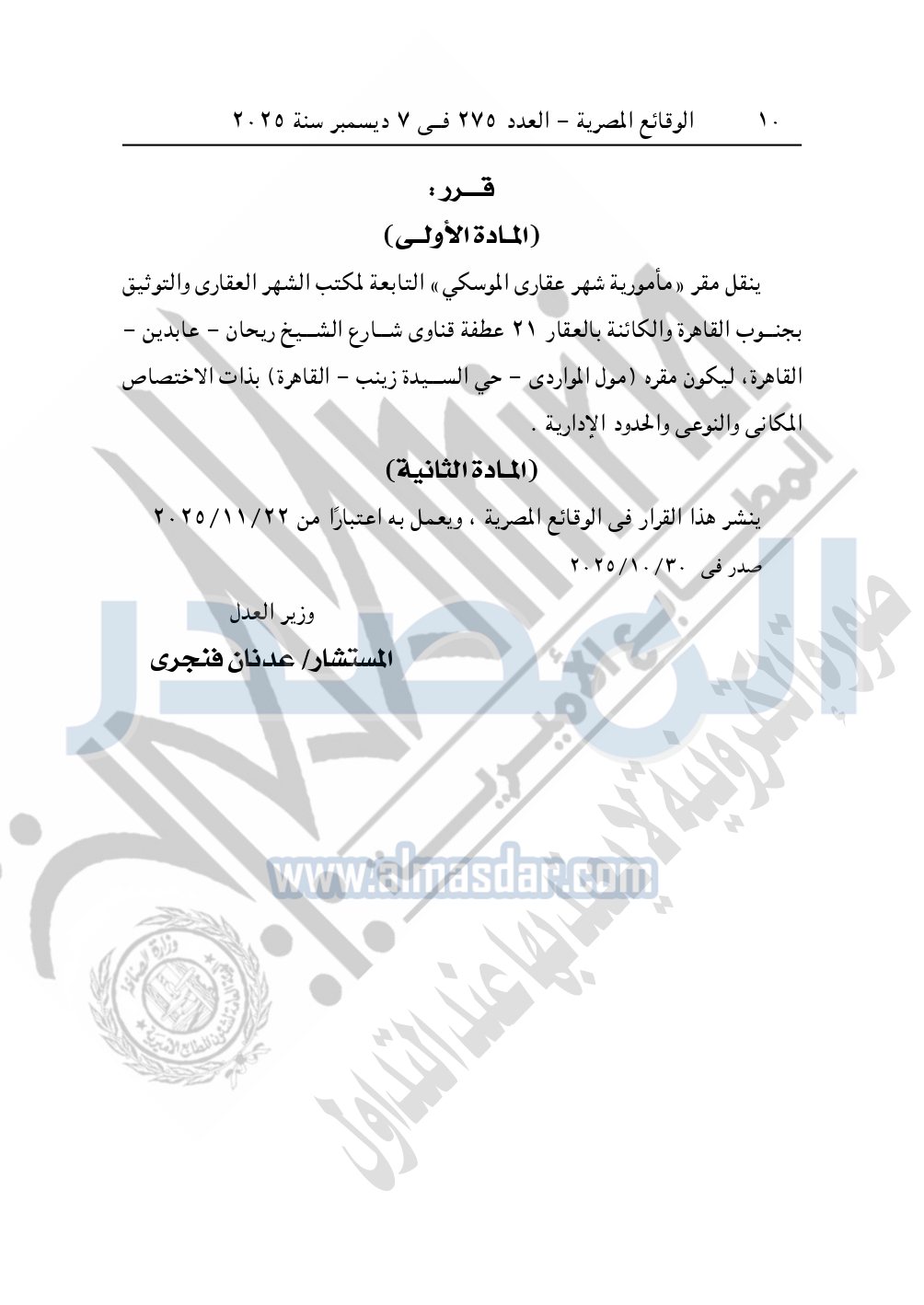 ونشرت الوقائع المصرية، العدد 275، الصادر في 7 ديسمبر سنة 2025، قرار وزارة العدل، رقم 6484 لسنة 2025، بشأن نقل مقر «مأمورية شهر عقارى الموسكي».