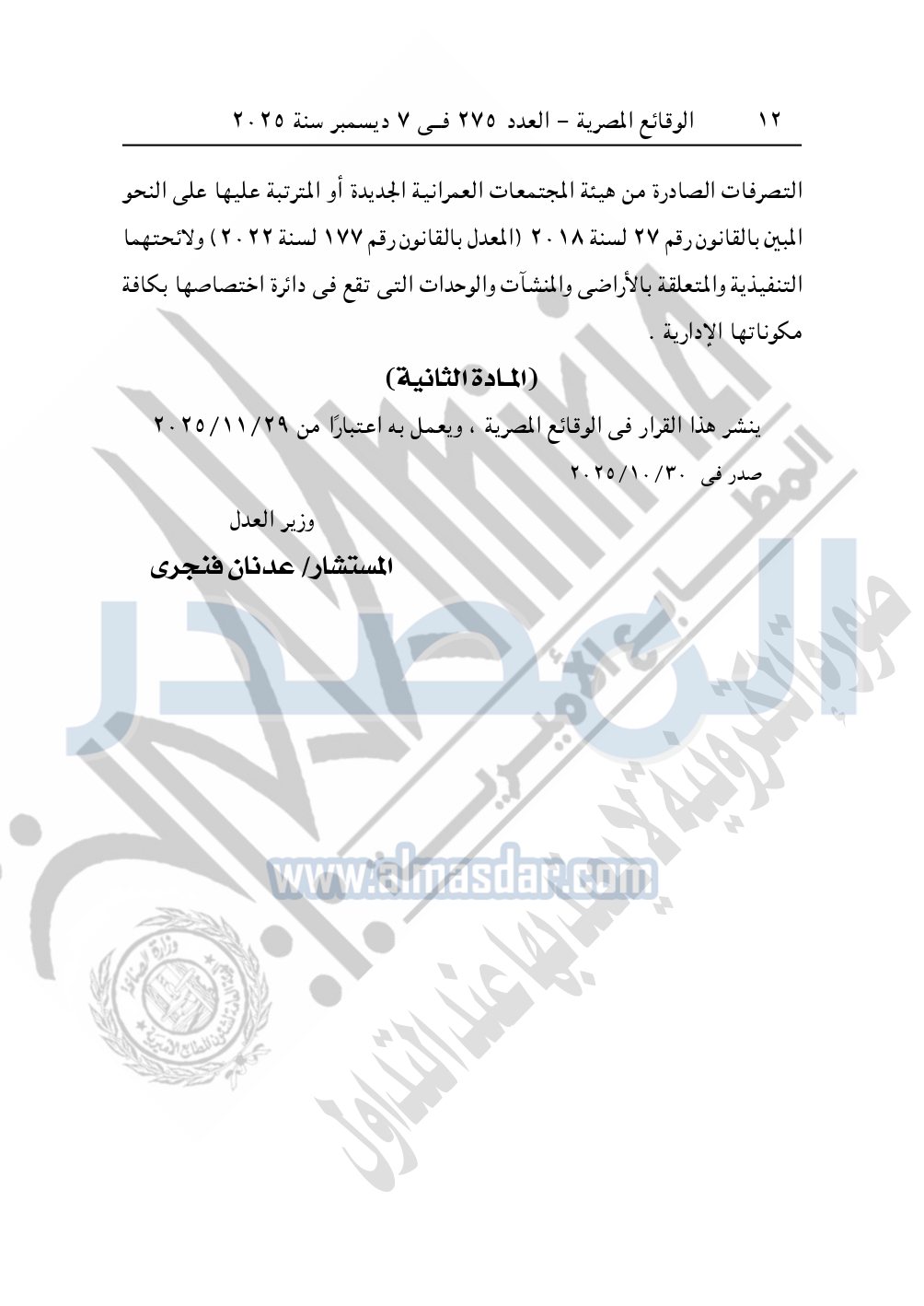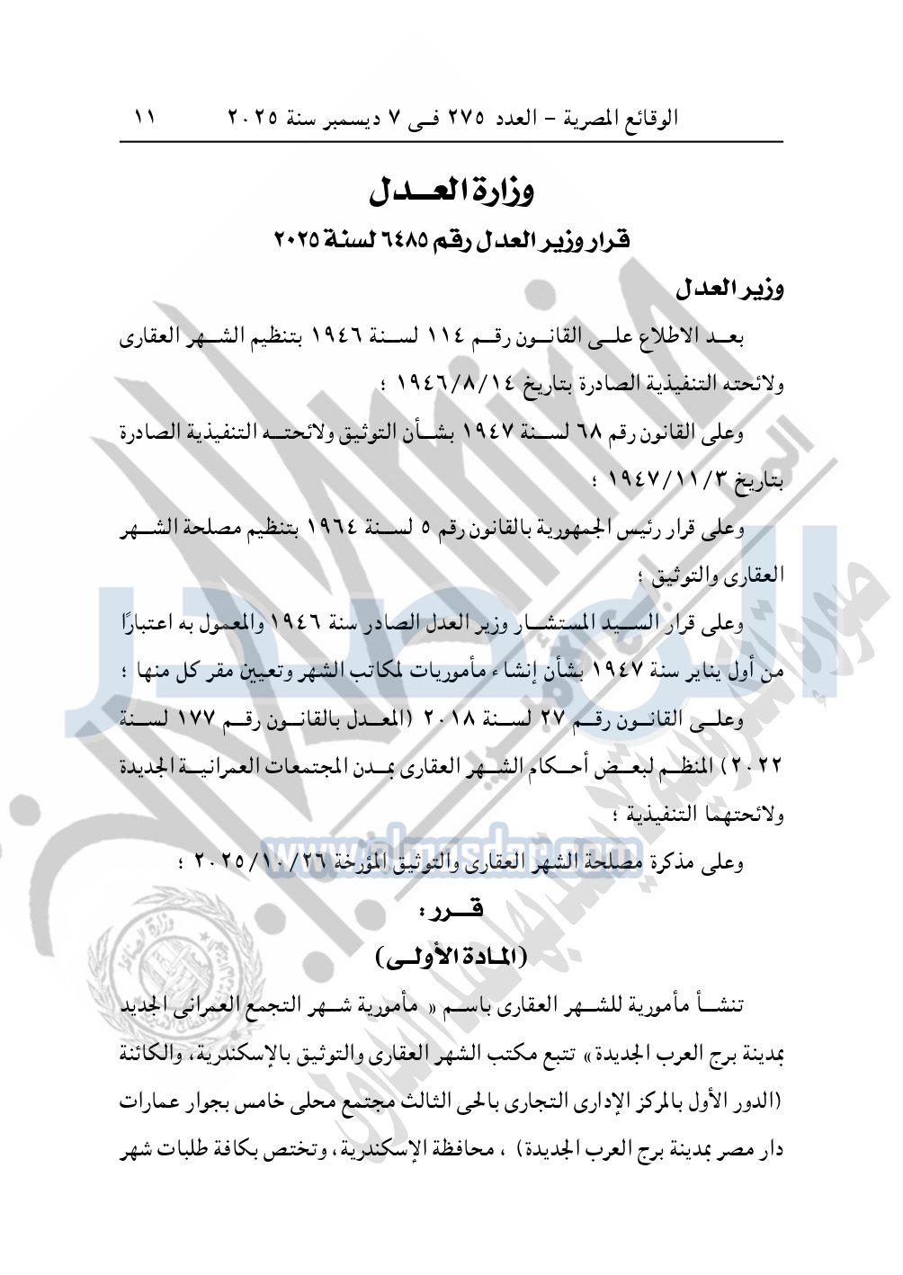كما نشرت الوقائع المصرية، العدد 275، الصادر في 7 ديسمبر سنة 2025، قرار وزارة العدل، رقم 6485 لسنة 2025، بشأن إنشاء مأمورية للشهر العقارى باسم «مأمورية شهر التجمع العمراني الجديد بمدينة برج العرب الجديدة».