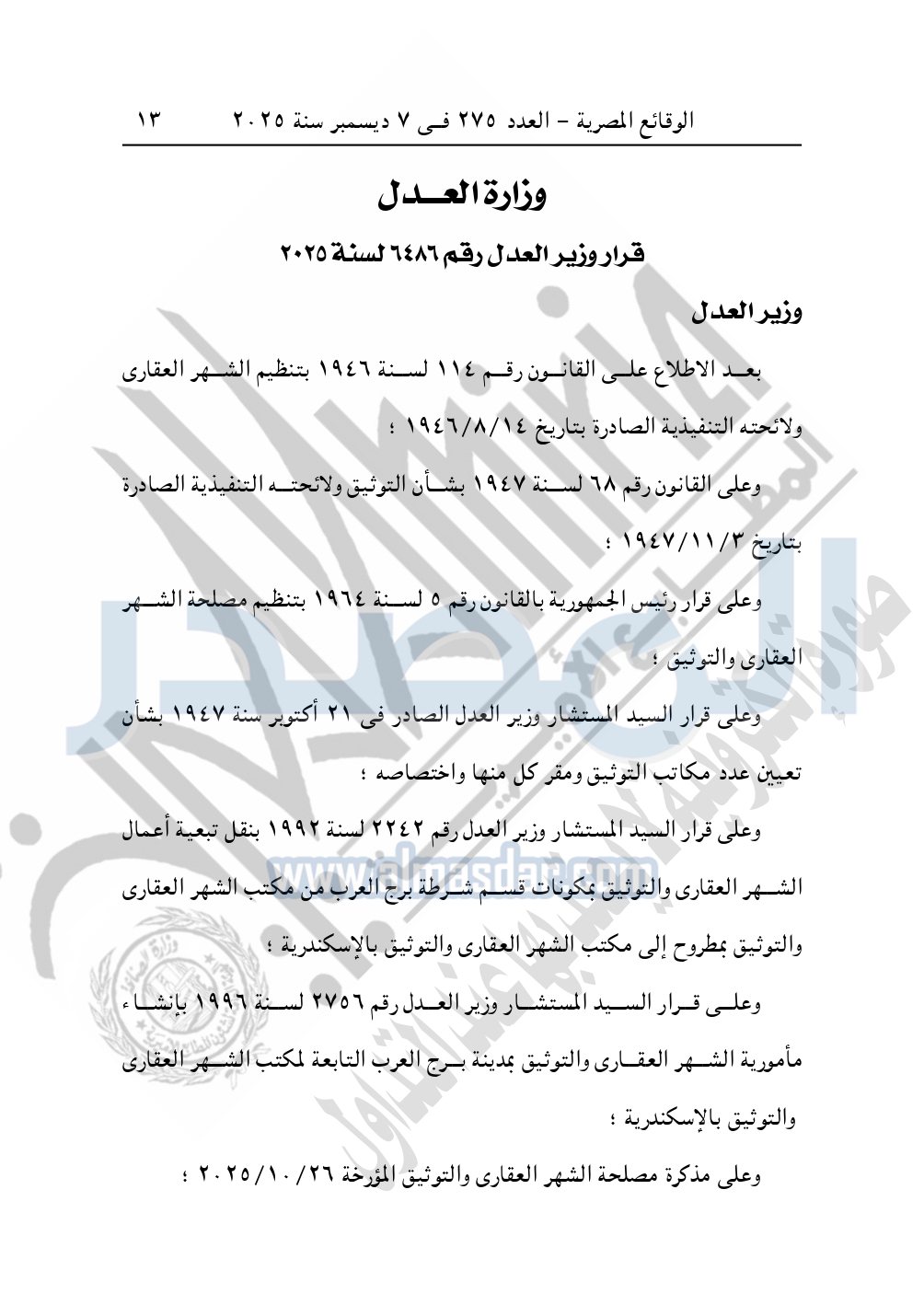 وأيضا نشرت الوقائع المصرية، العدد 275، الصادر في 7 ديسمبر سنة 2025، قرار وزارة العدل، رقم 6486 لسنة 2025، بشأن إنشاء فرع للتوثيق باسم «فرع توثيق برج العرب الجديدة المميز».