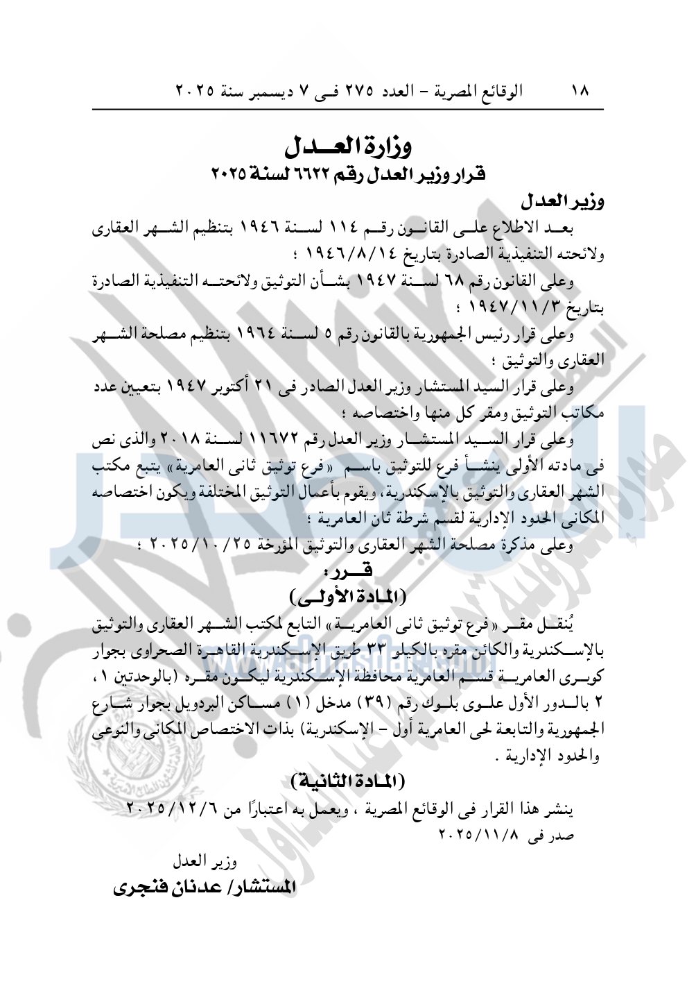 ونشرت الوقائع المصرية، العدد 275، الصادر في 7 ديسمبر سنة 2025، قرار وزارة العدل، رقم 6622 لسنة 2025، بشأن نقل مقر «فرع توثيق ثانى العامرية»