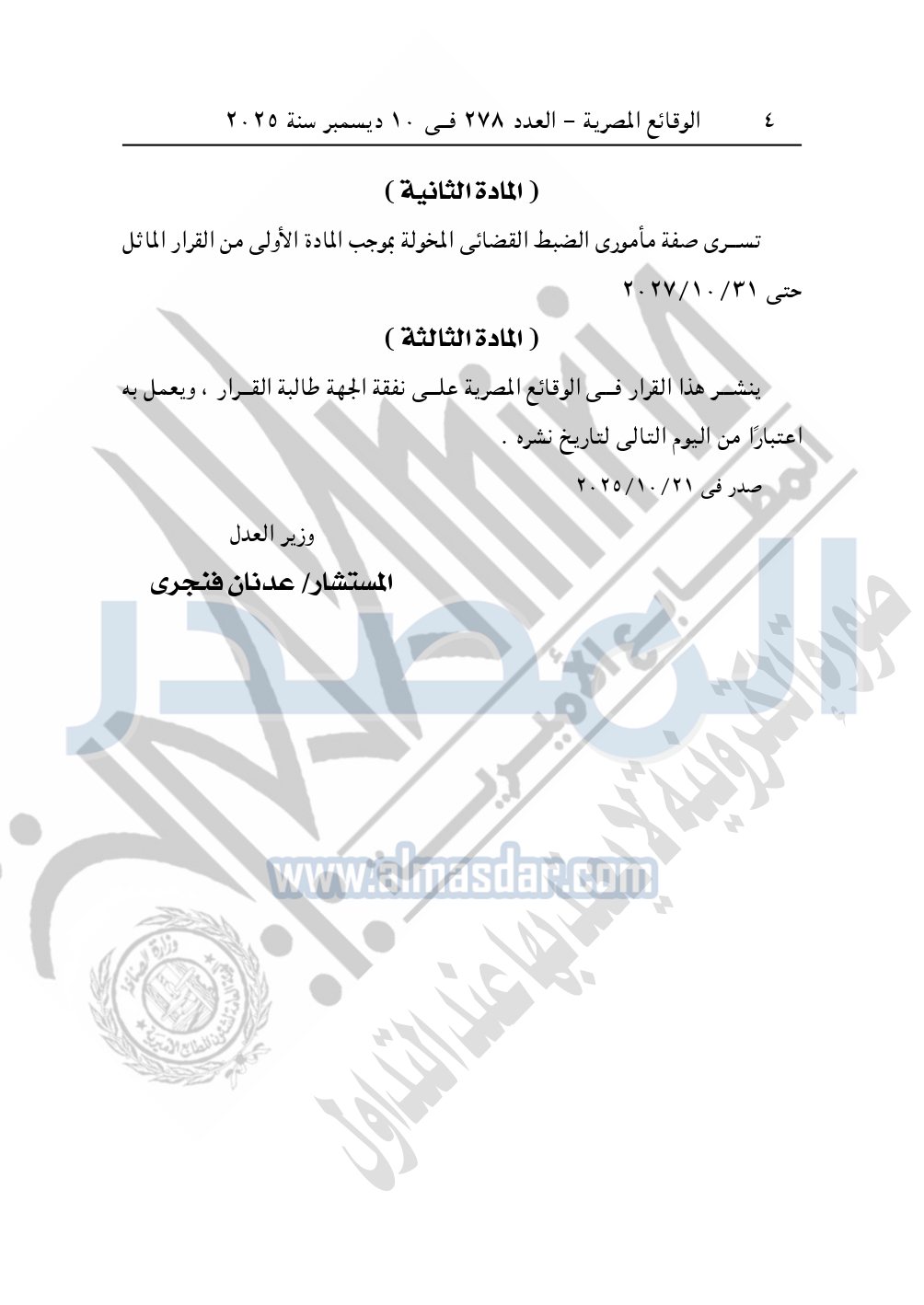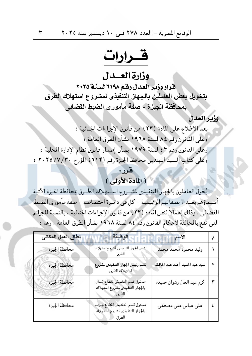 نشرت الوقائع المصرية، في العدد 278، الصادر في 10 ديسمبر سنة 2025، قرار وزارة العدل، رقم 6198 لسنة 2025، بشأن منح بعض العاملين بالجهاز التنفيذى لمشروع استهلاك الطرق بمحافظة الجيزة - صفة مأمورى الضبط القضائي.