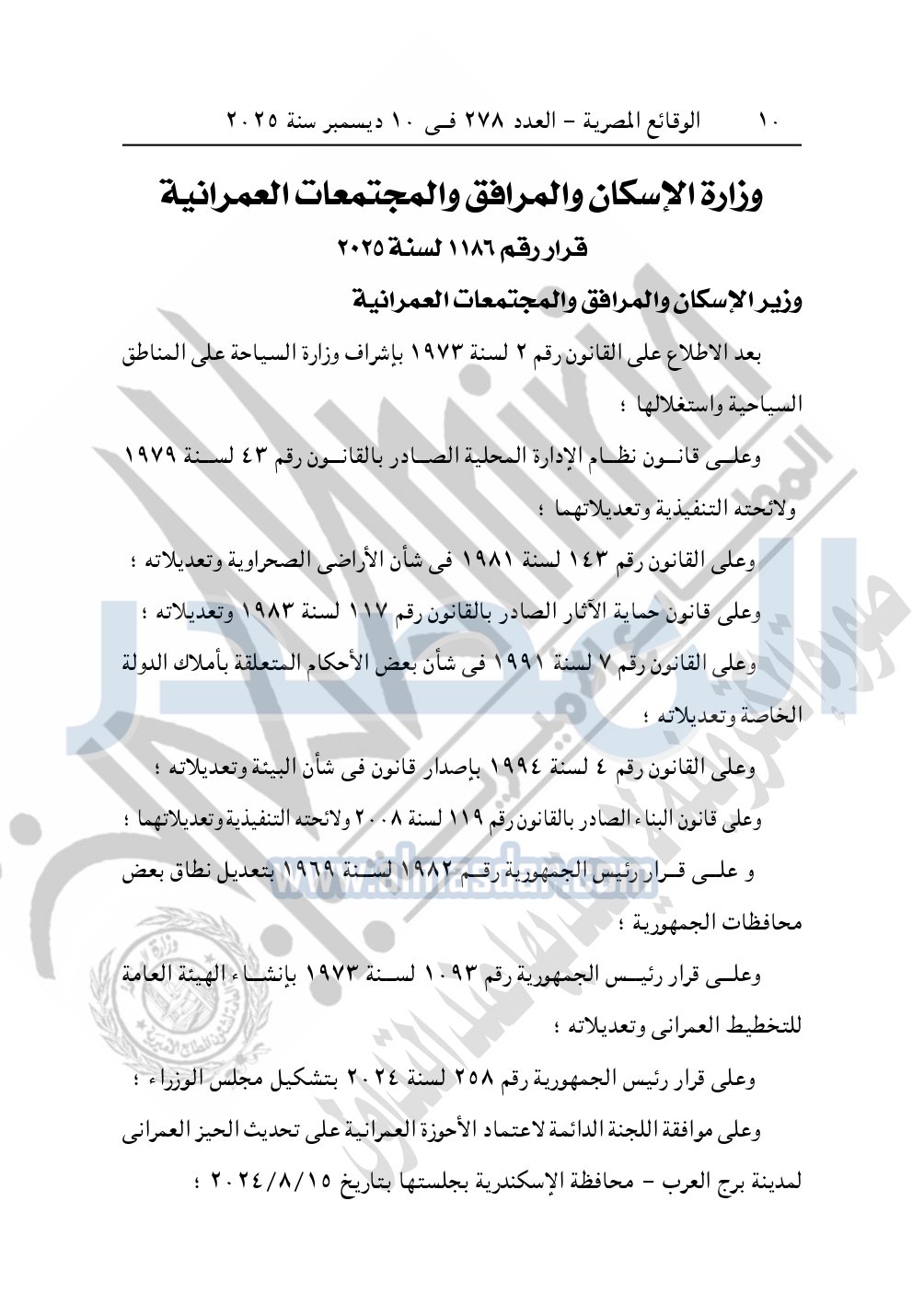 نشرت الوقائع المصرية في العدد 278، الصادر في 10 ديسمبر سنة 2025، وزارة الإسكان والمرافق والمجتمعات العمرانية، رقم 1186 لسنة 2025، بشأن إعتماد المخطط الاستراتيجى العام لمدينة برج العرب.