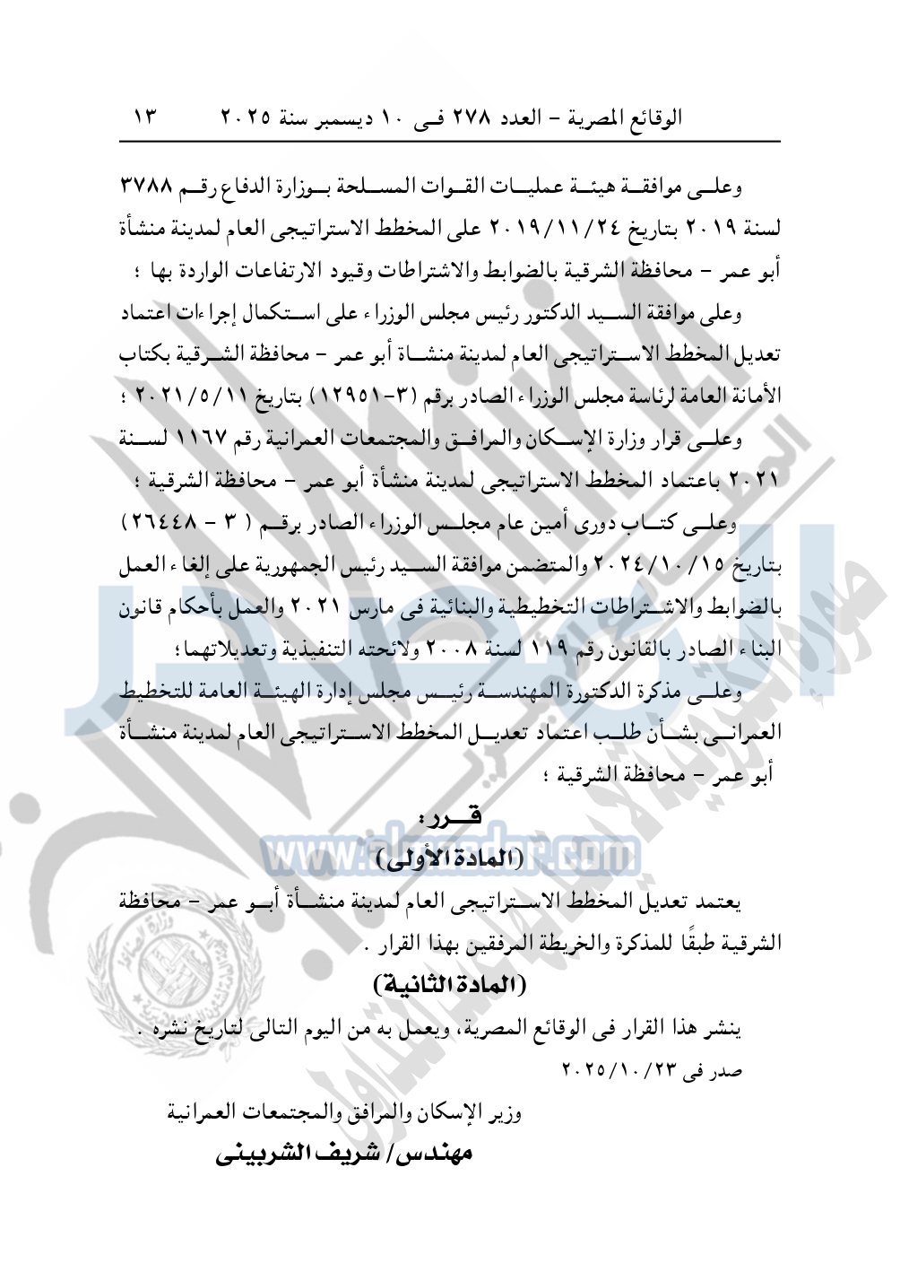 كما نشرت الوقائع المصرية في العدد 278، الصادر في 10 ديسمبر سنة 2025، وزارة الإسكان والمرافق والمجتمعات العمرانية، رقم 1187 لسنة 2025، بشأن إعتماد المخطط الاستراتيجى العام لمدينة منشأة أبو عمر.