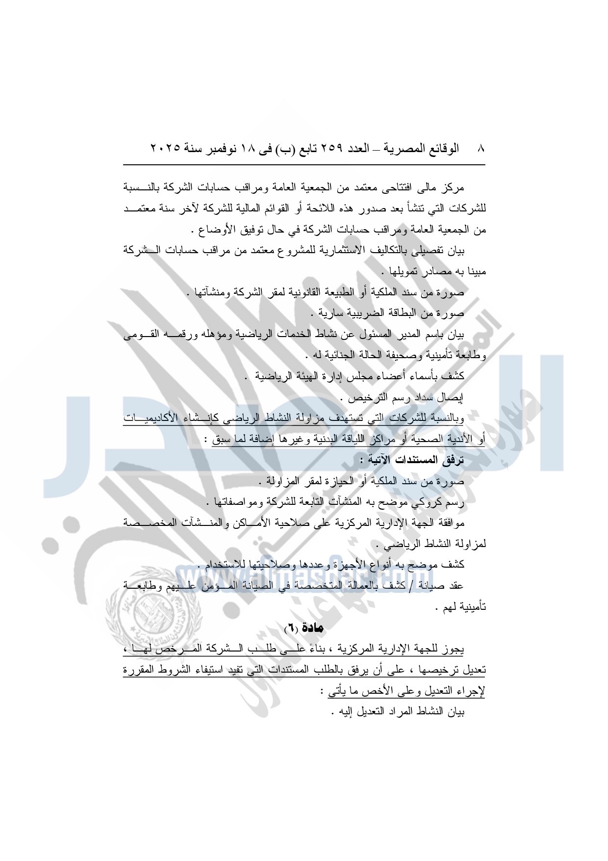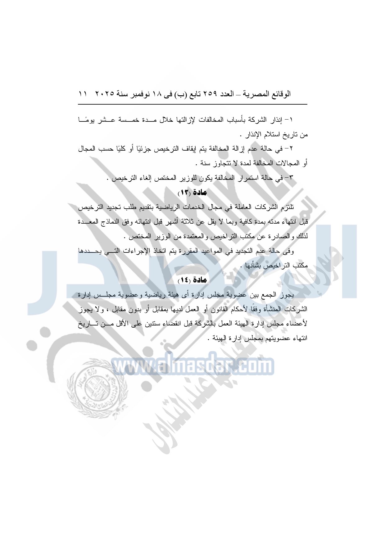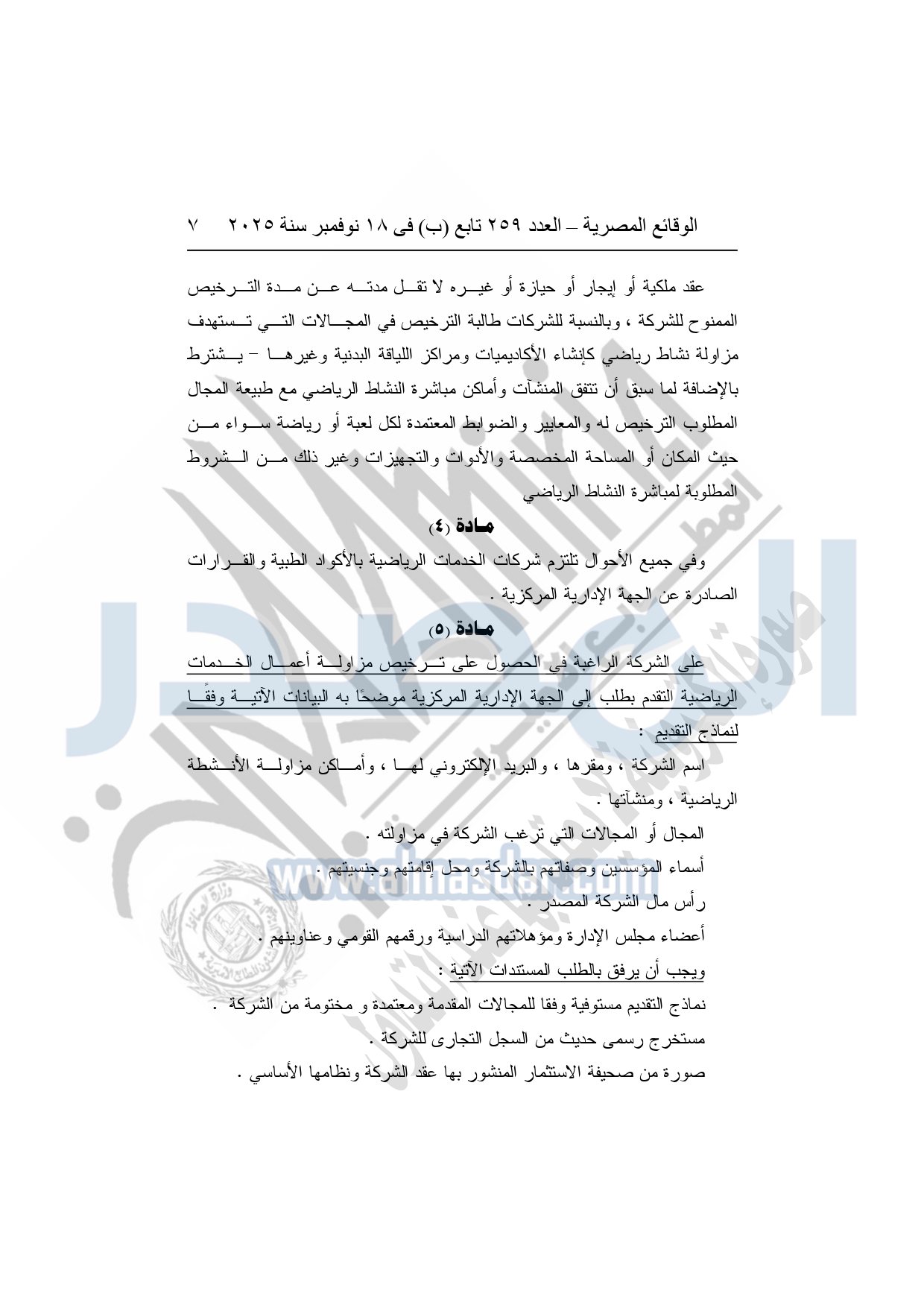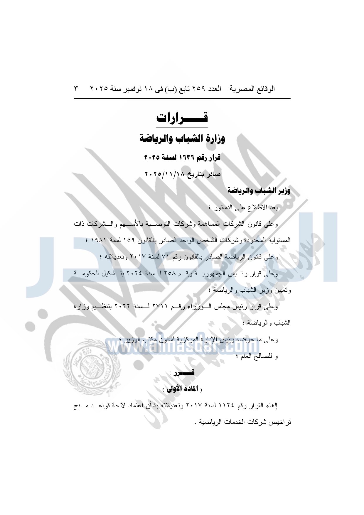 نشرت الوقائع المصرية، في العدد 259 تابع "ب" في 18 نوفمبر سنة 2025، قرار وزارة الشباب والرياضة، رقم 1636 لسنة 2025، صادر بتاريخ 18-11-2025، بشأن اعتماد لائحة قواعد منح تراخيص شركات الخدمات الرياضية.