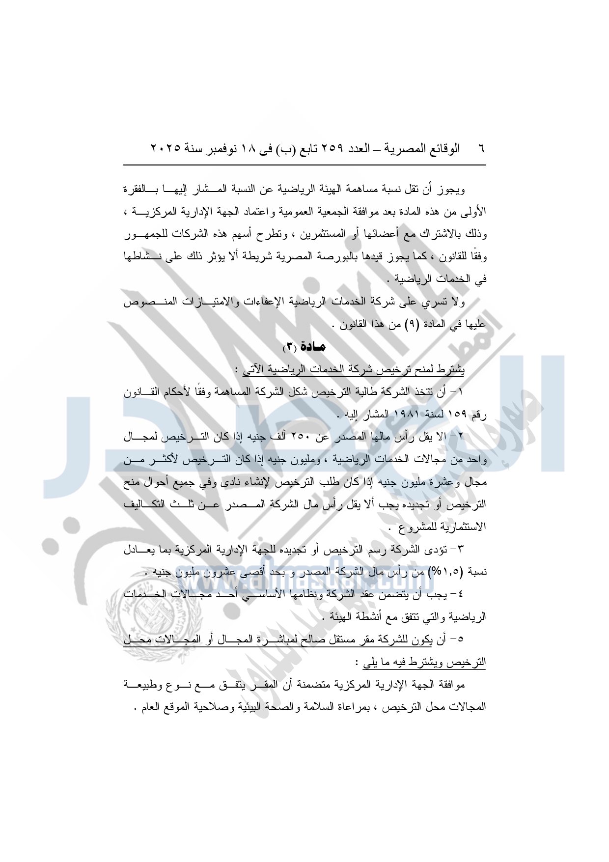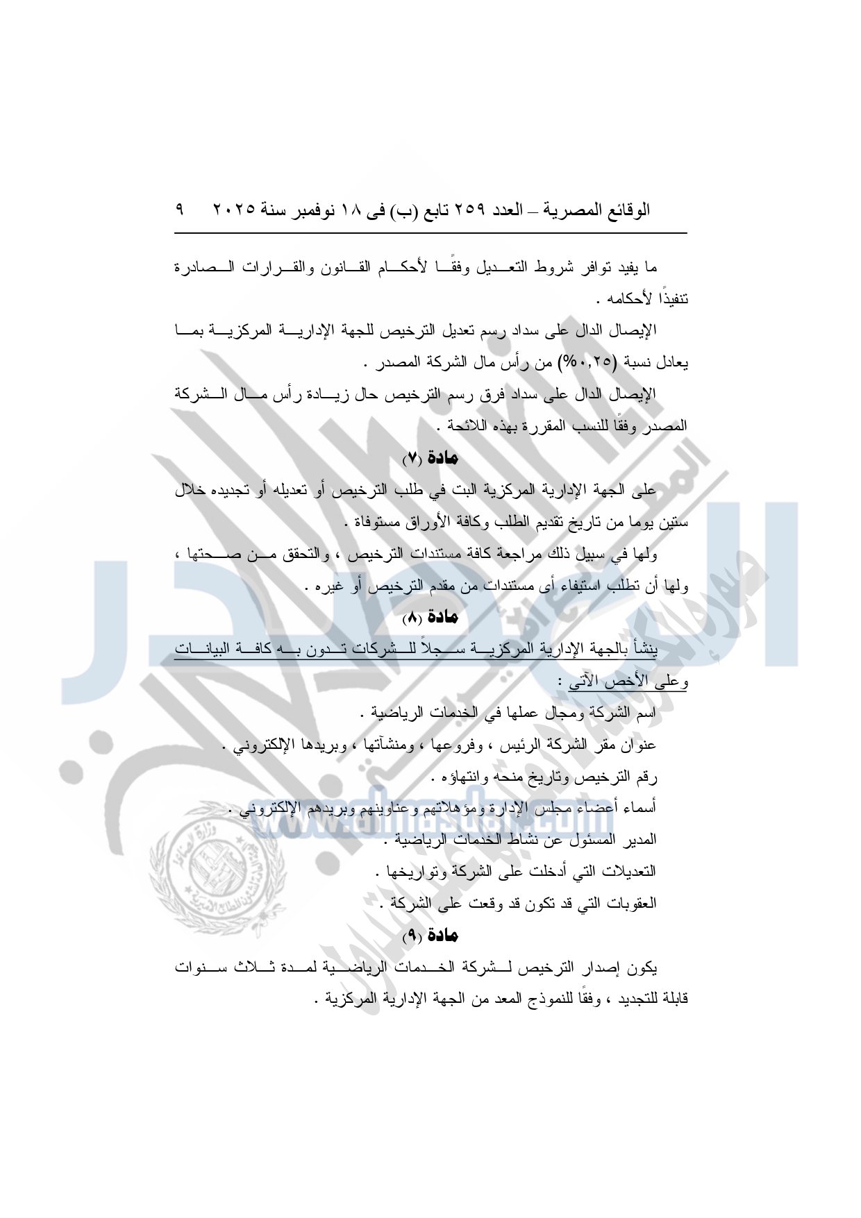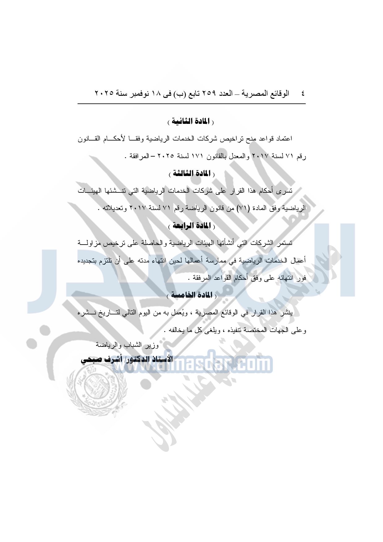 اعتماد قواعد منح تراخيص شركات الخدمات الرياضية وفقا لأحكام القـانون رقم 71 لسنة 2017 والمعدل بالقانون 171 لسنة 2025 – المرافقة.