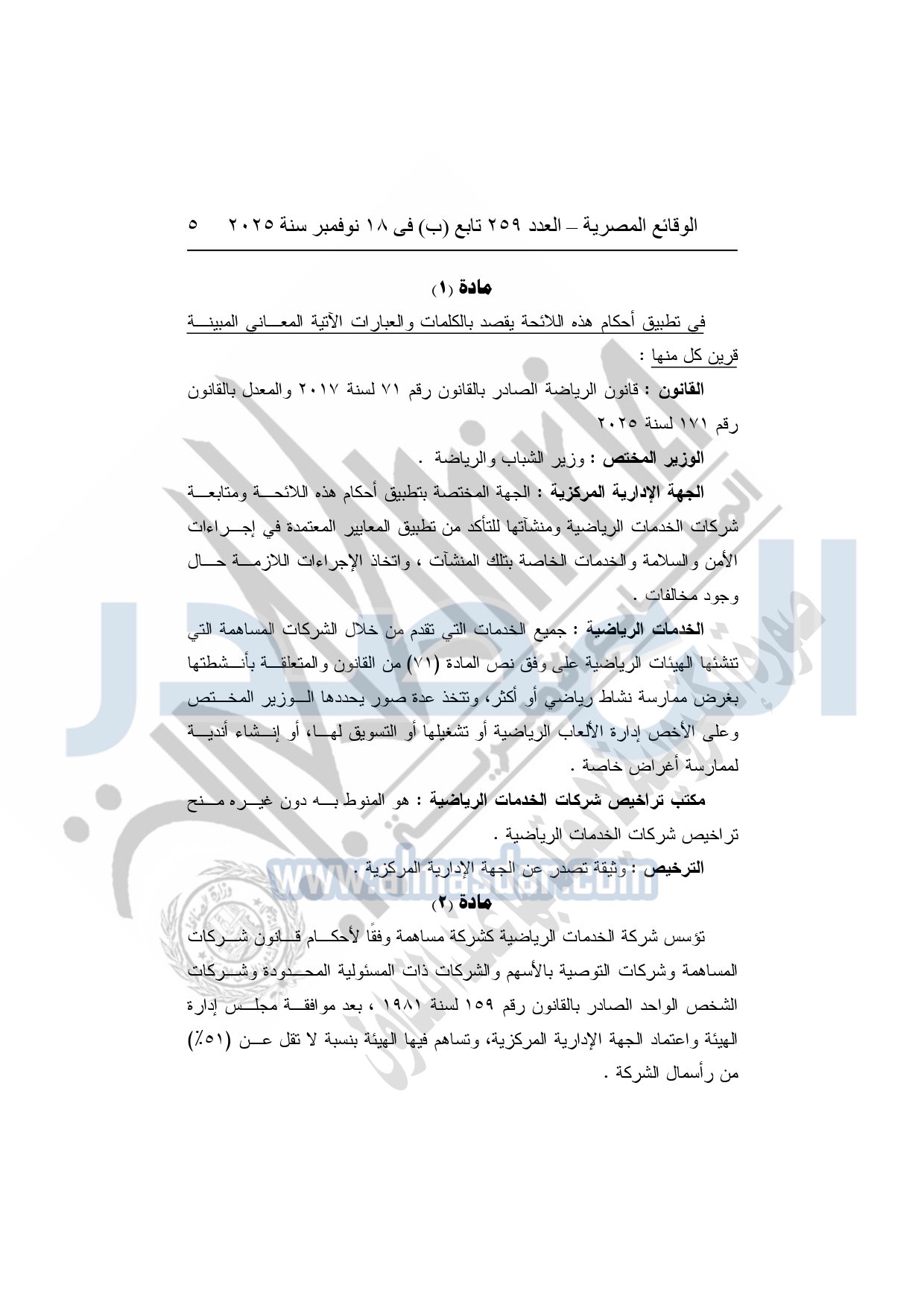 تسرى أحكام هذا القرار على شركات الخدمات الرياضية التي تنشئها الهيئات الرياضية وفق المادة "71" من قانون الرياضة رقم 71 لسنة 2017 وتعديلاته.
