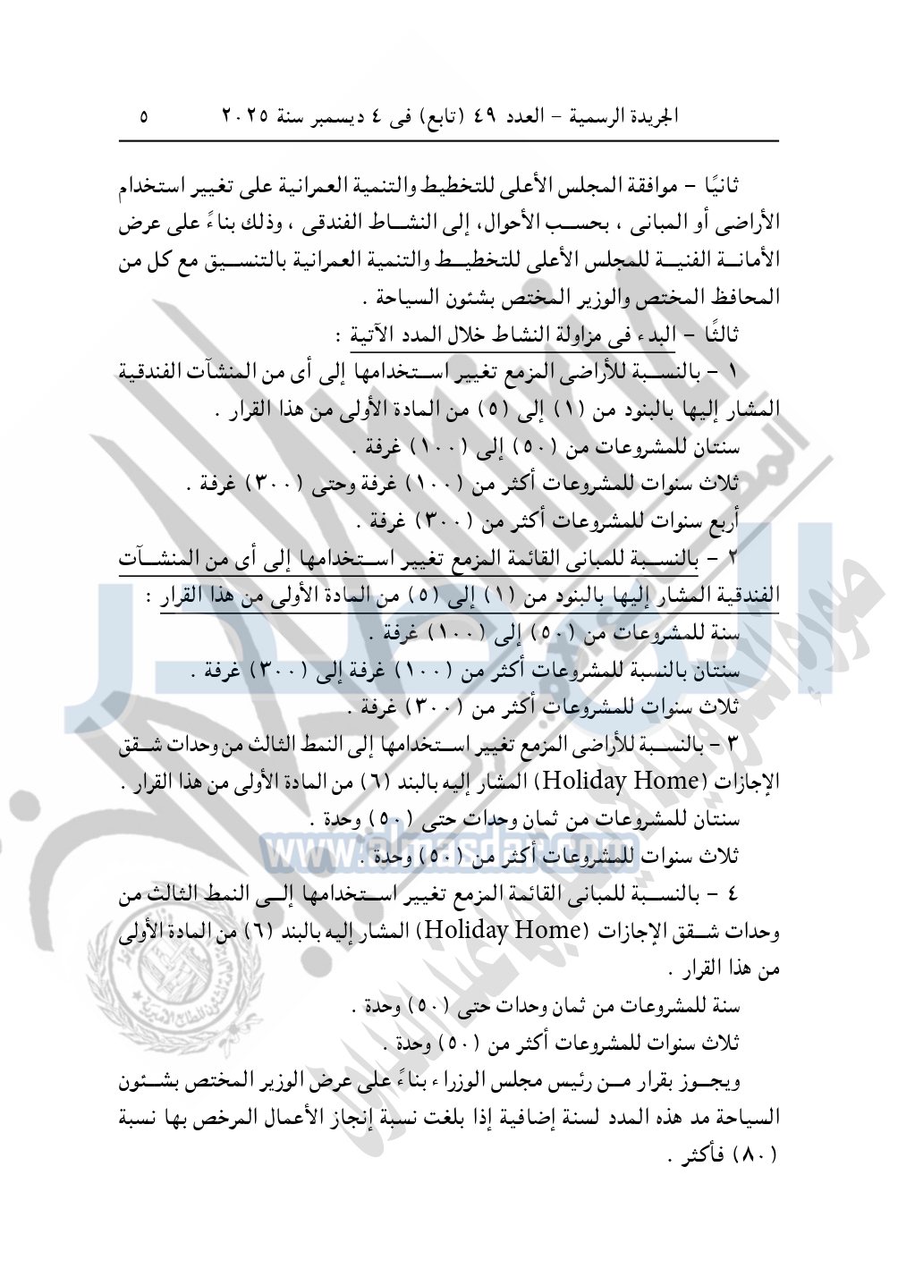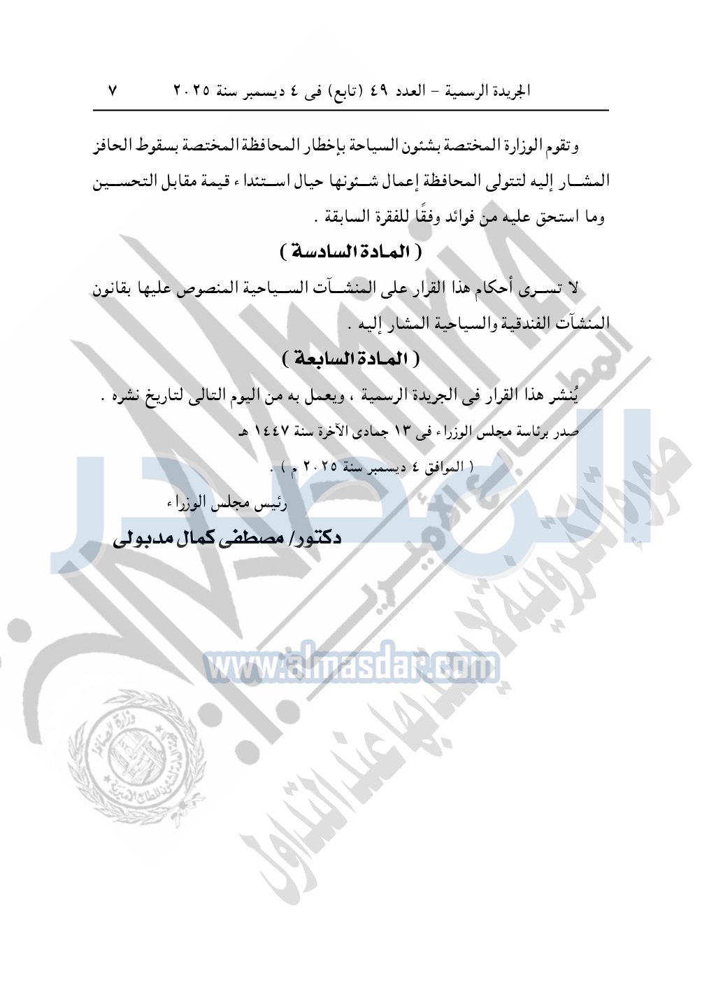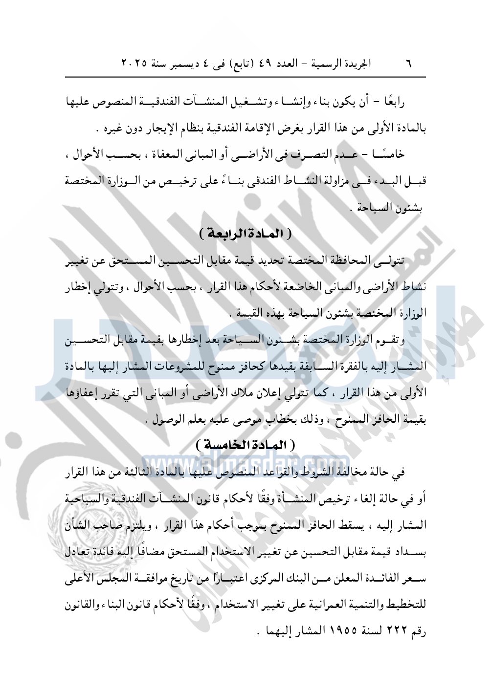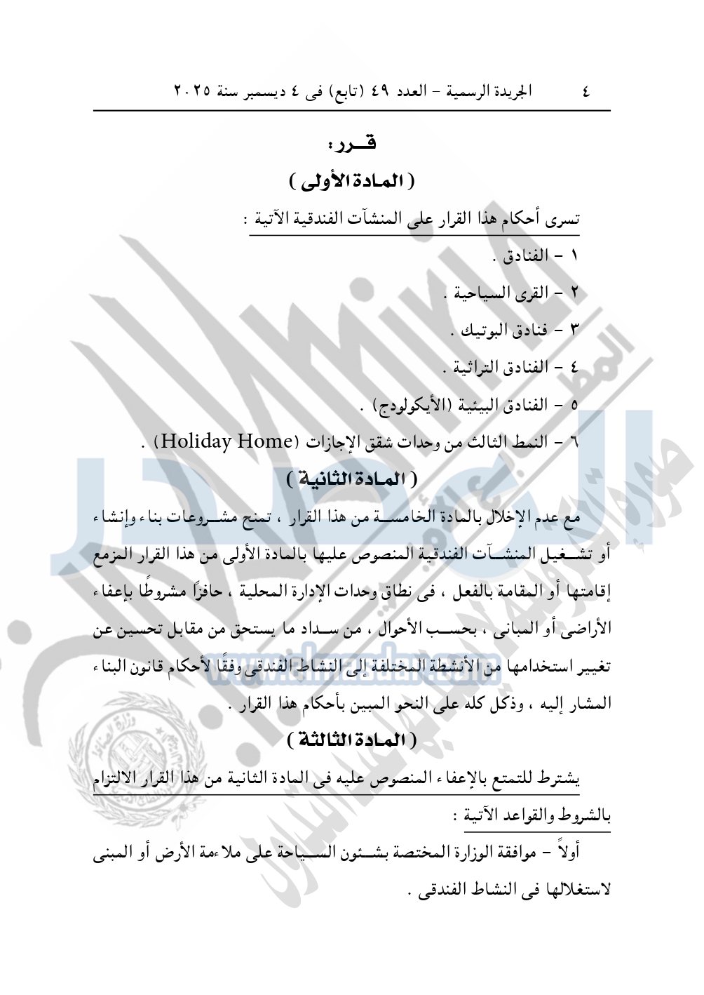 نشرت الجريدة الرسمية، في العدد 49 "تابع"، الصادر في 4 ديسمبر سنة 2025، قرار رئيس مجلس الوزراء، رقم 80 لسنة 2025، بشأن تقرير حافز لتشجيع عملية بناء وإنشاء أو تشغيل بعض المنشآت الفندقية في نطاق وحدات الإدارة المحلية.