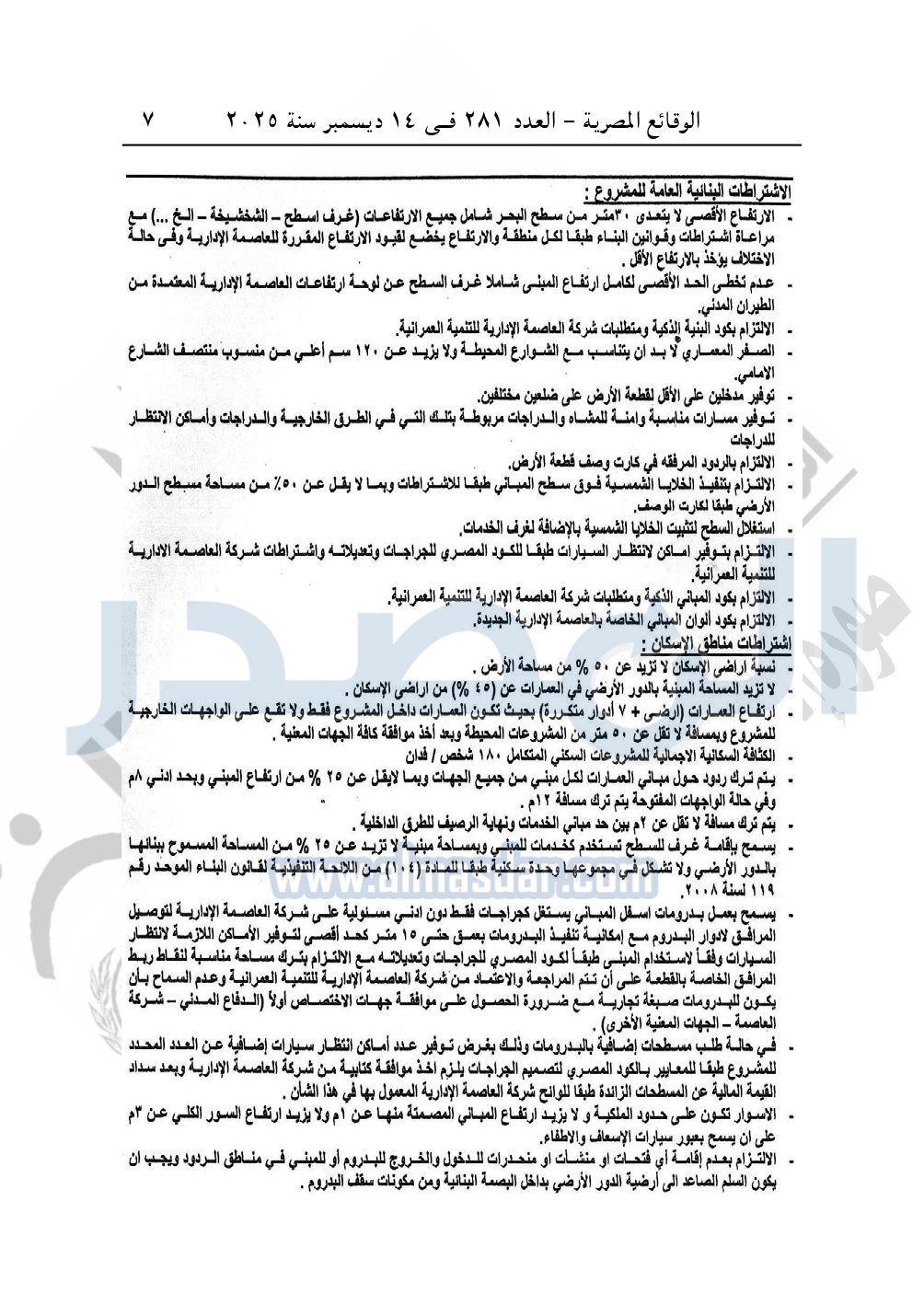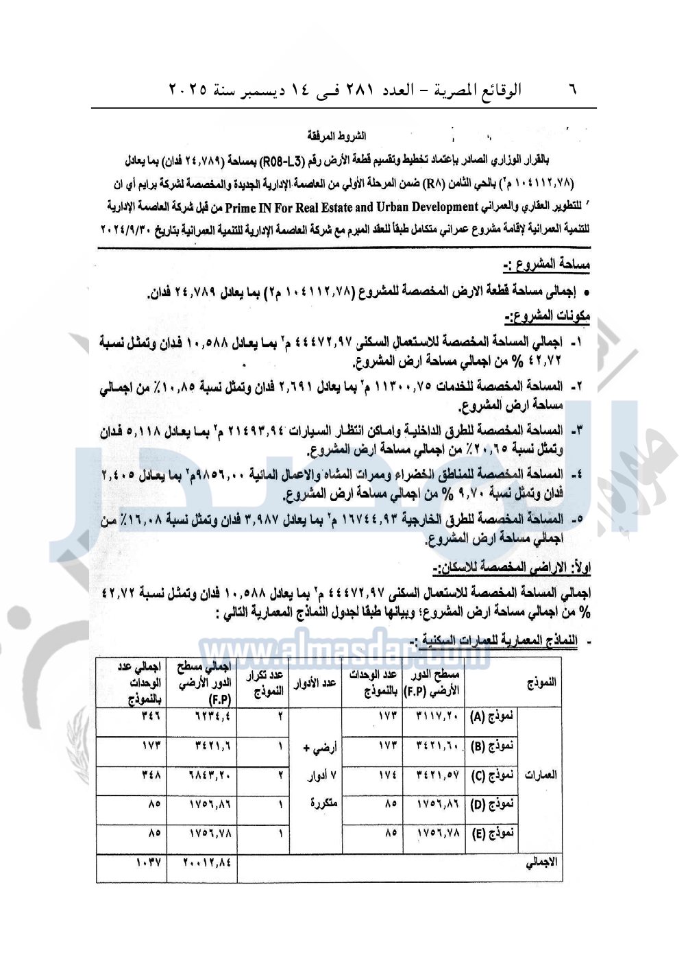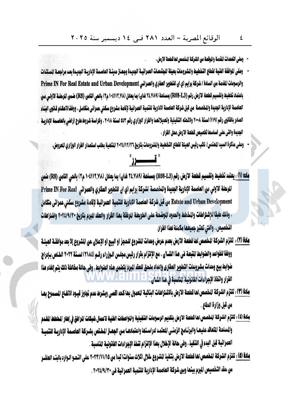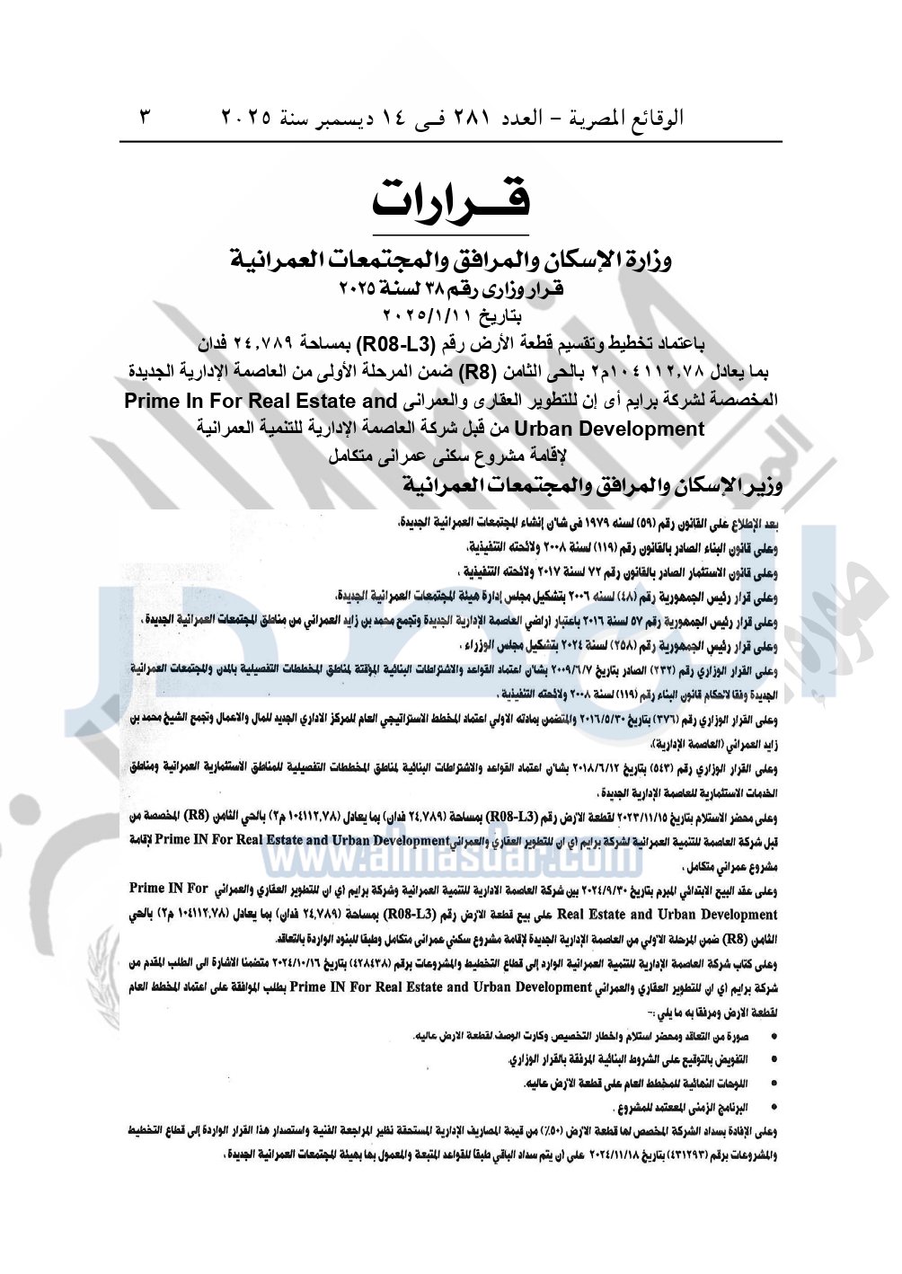نشرت الوقائع المصرية، في العدد 281، الصادر في 14 ديسمبر سنة 2025، قرار وزارة الإسكان والمرافق والمجتمعات العمرانية، رقم 38 لسنة 2025 بتاريخ 11-1-2025، بشأن اعتماد تخطيط وتقسيم قطعة الأرض رقم "R08-L3" بمساحة 24.789 فدان بما يعادل 104112.78م2 بالحى الثامن "R8" ضمن المرحلة الأولى من العاصمة الإدارية الجديدة المخصصة لشركة برايم أى إن للتطوير العقاري والعمراني Prime In For Real Estate and Urban Development من قبل شركة العاصمة الإدارية للتنمية العمرانية لإقامة مشروع سكني عمراني متكامل.