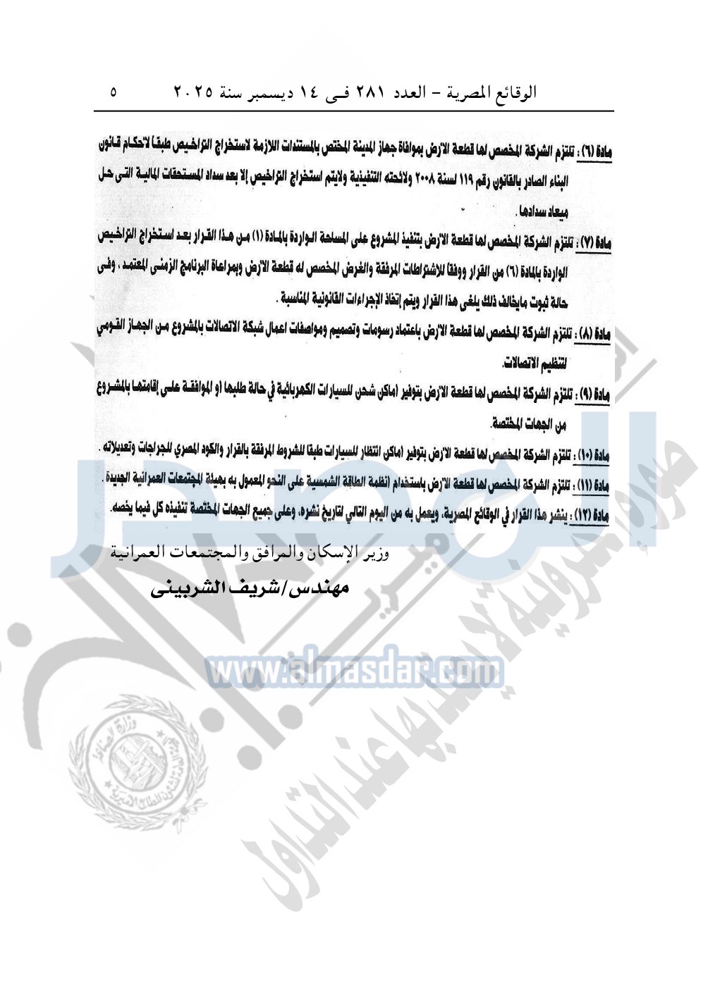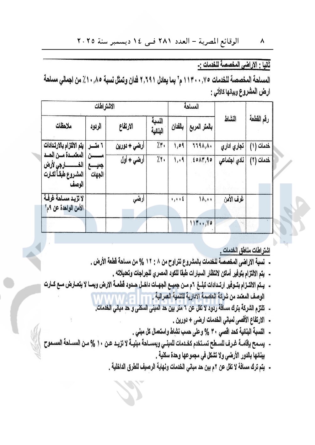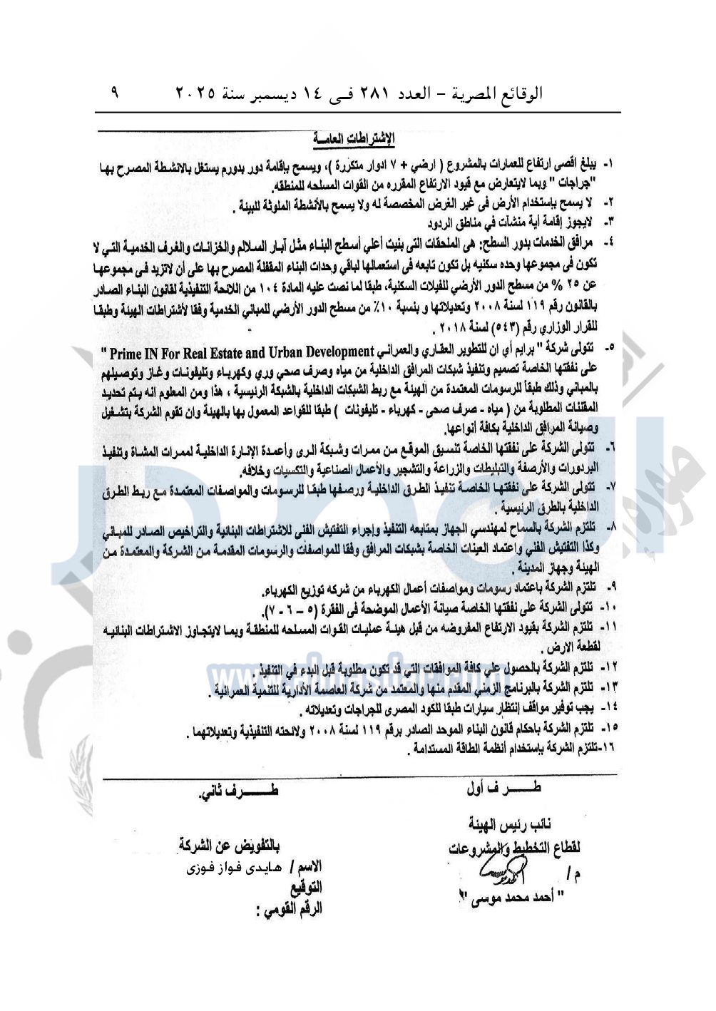 تلتزم الشركة المخصص لها قطعة الأرض بالاشتراطات البنائية المعمول بها كحد أقصى وبشرط عدم تجاوز قيود الاتفاع المسموح بها من قبل وزارة الدفاع.