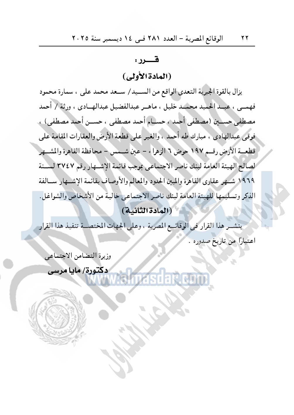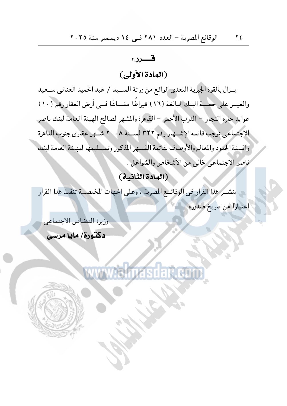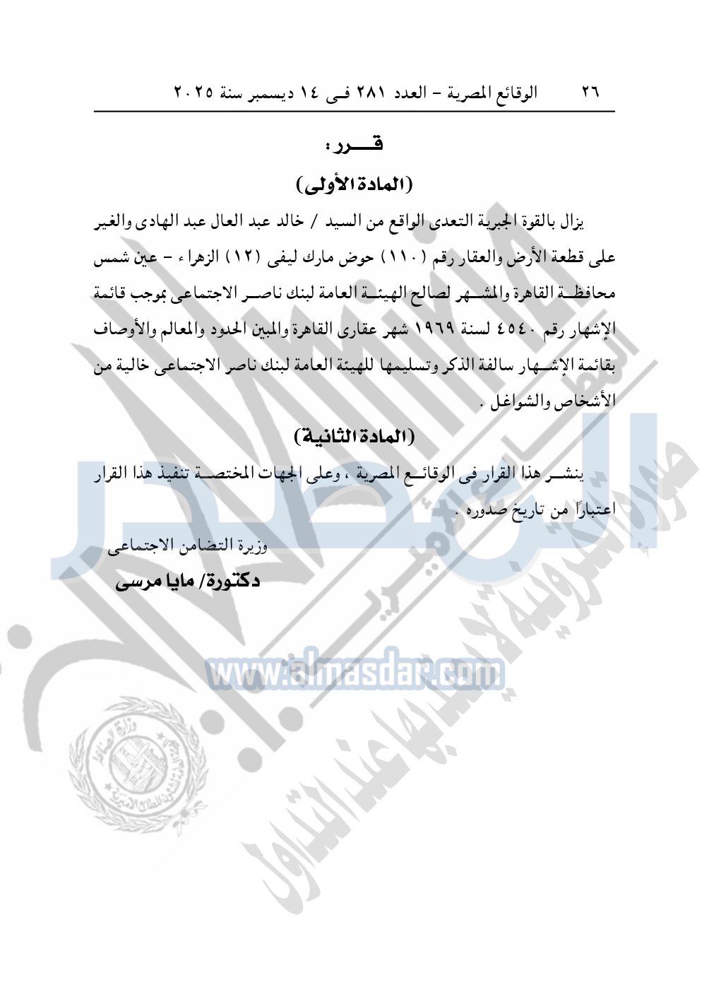 كما نشرت الوقائع المصرية، في العدد 281، الصادر في 14 ديسمبر سنة 2025، قرار وزارة التضامن الاجتماعى، رقم 992 لسنة 2025، بتاريخ 16-11-2025، بشأن إزالة بالقوة الجبرية التعدى الواقع على العقار رقم "10" عوايد حارة النجار - الدرب الأحمر - القاهرة.