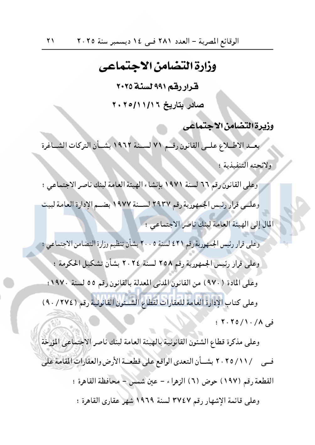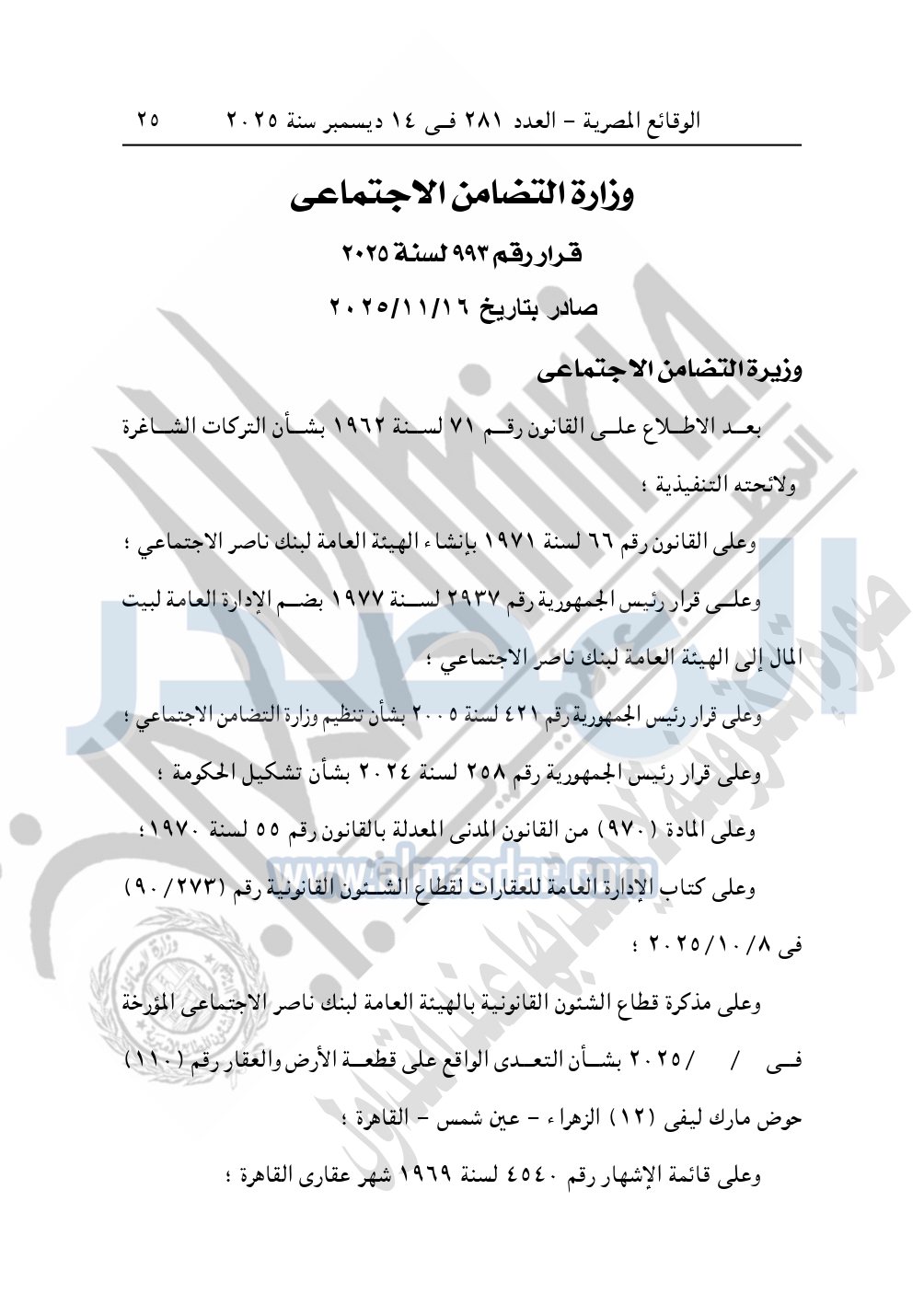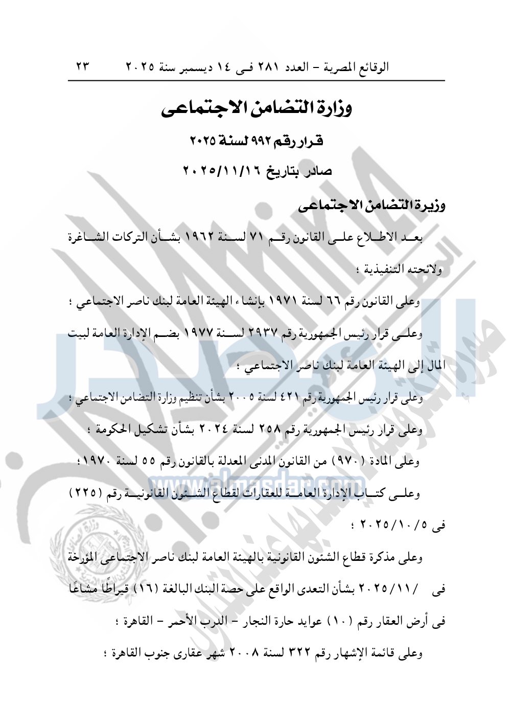 كما نشرت الوقائع المصرية، في العدد 281، الصادر في 14 ديسمبر سنة 2025، قرار وزارة التضامن الاجتماعى، رقم 992 لسنة 2025، بتاريخ 16-11-2025، بشأن إزالة بالقوة الجبرية التعدى الواقع على العقار رقم "10" عوايد حارة النجار - الدرب الأحمر - القاهرة.