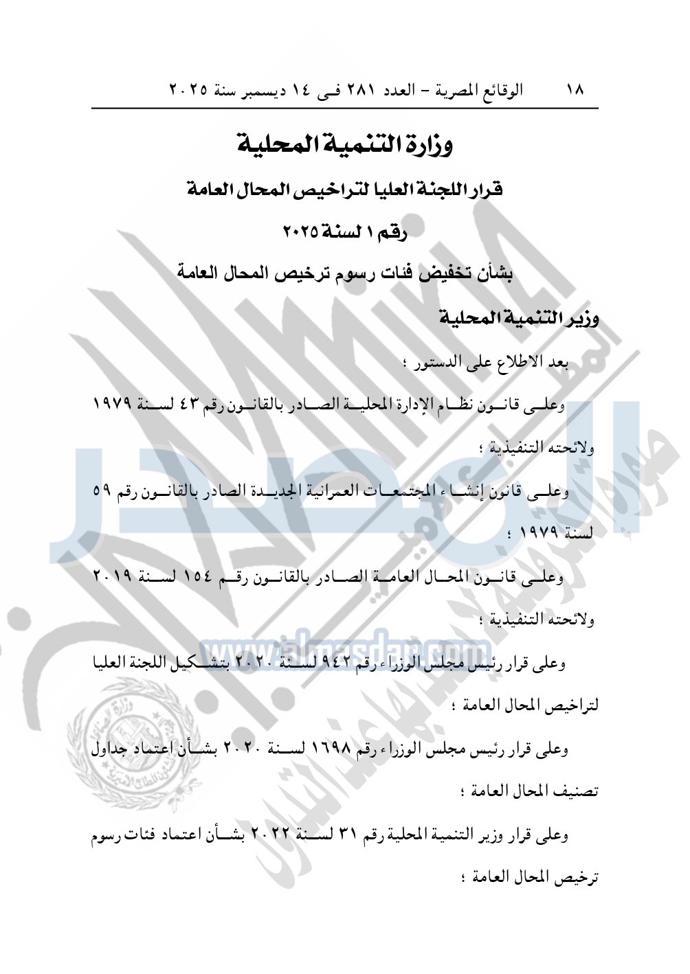 نشرت الوقائع المصرية في العدد 281، بتاريخ 14 ديسمبر 2025، قرار وزارة التنمية المحلية، رقم 1 لسنة 2025، بشأن تخفيض فئات رسوم ترخيص المحال العامة.