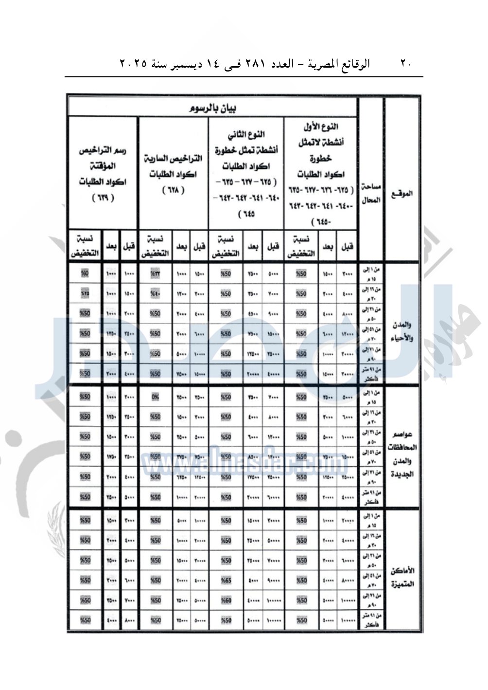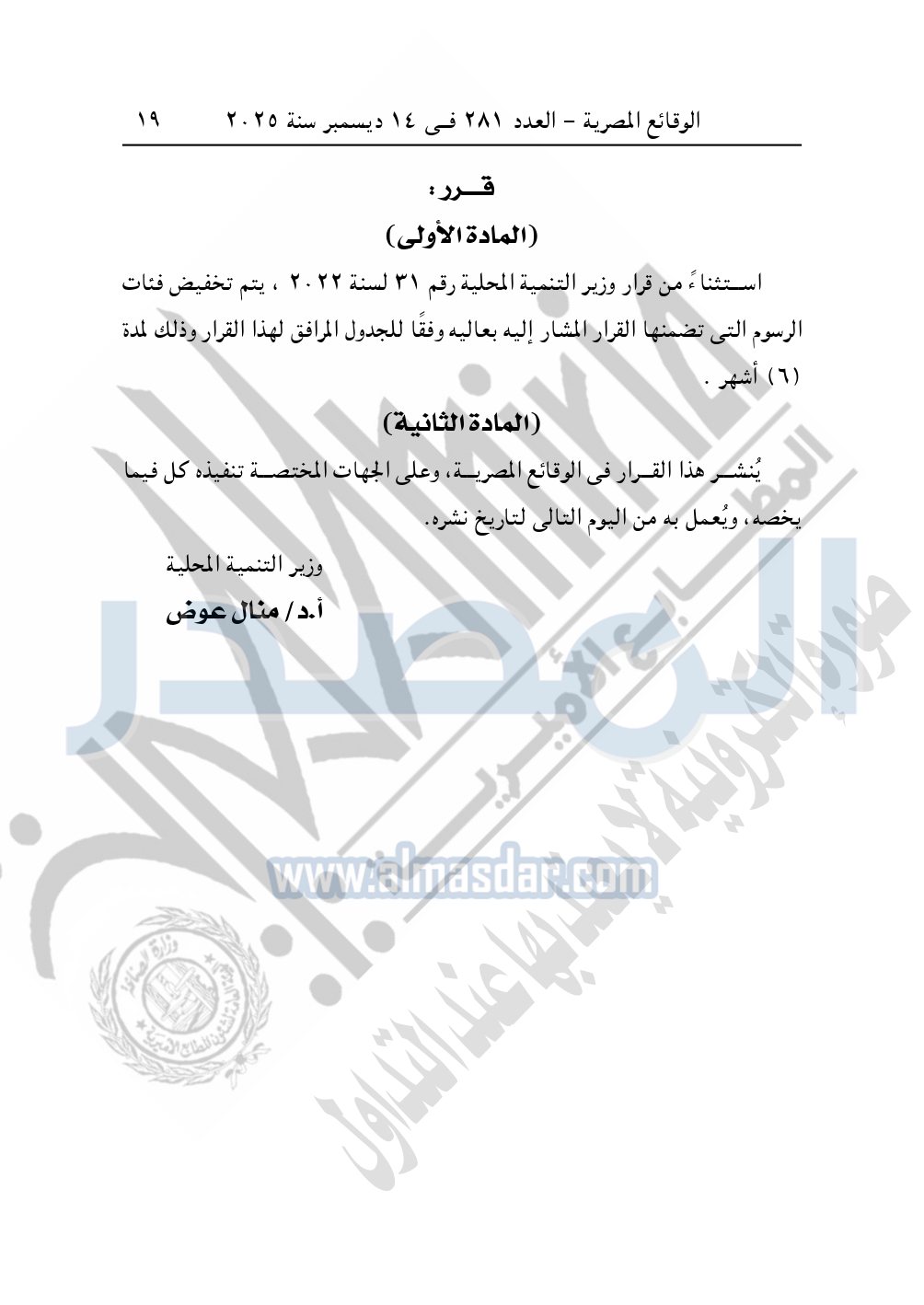 استثناء من قرار وزير التنمية المحلية رقم 31 لسنة 2022، يتم تخفيض فئات الرسوم التي تضمنها القرار المشار إليه بعاليه وفقًا للجدول المرافق لهذا القرار وذلك لمدة "6" أشهر.