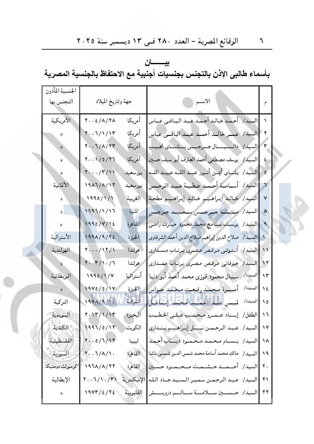 وأيضا نشرت الوقائع المصرية في العدد 280 الصادر في 13 ديسمبر سنة 2025، قرار وزارة الداخلية، رقم 2063 لسنة 2025، بشأن الإذن للواحد والعشرين مواطن بالحصول على الجنسية الأجنبية مع احتفاظهم بالجنسية المصرية.