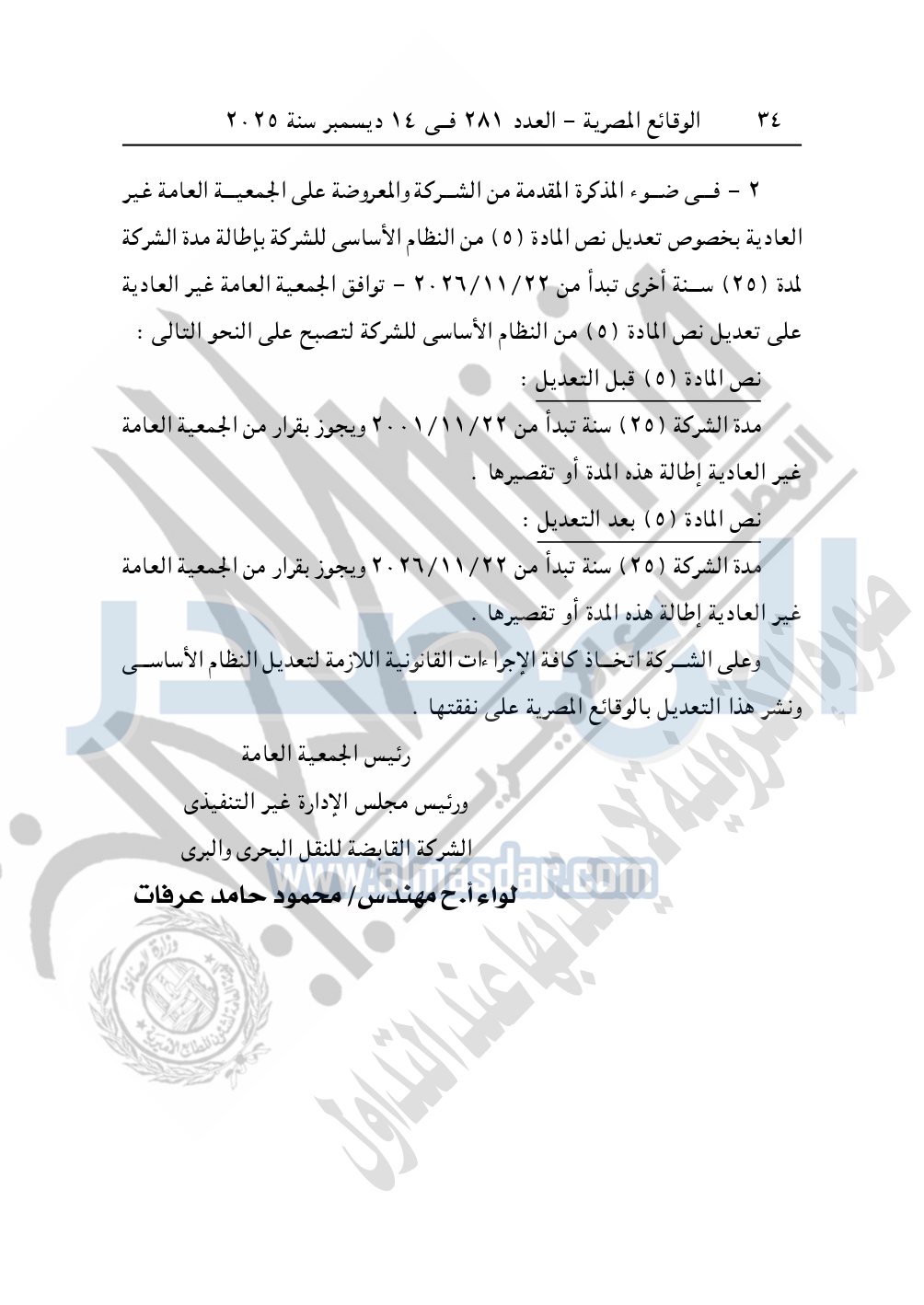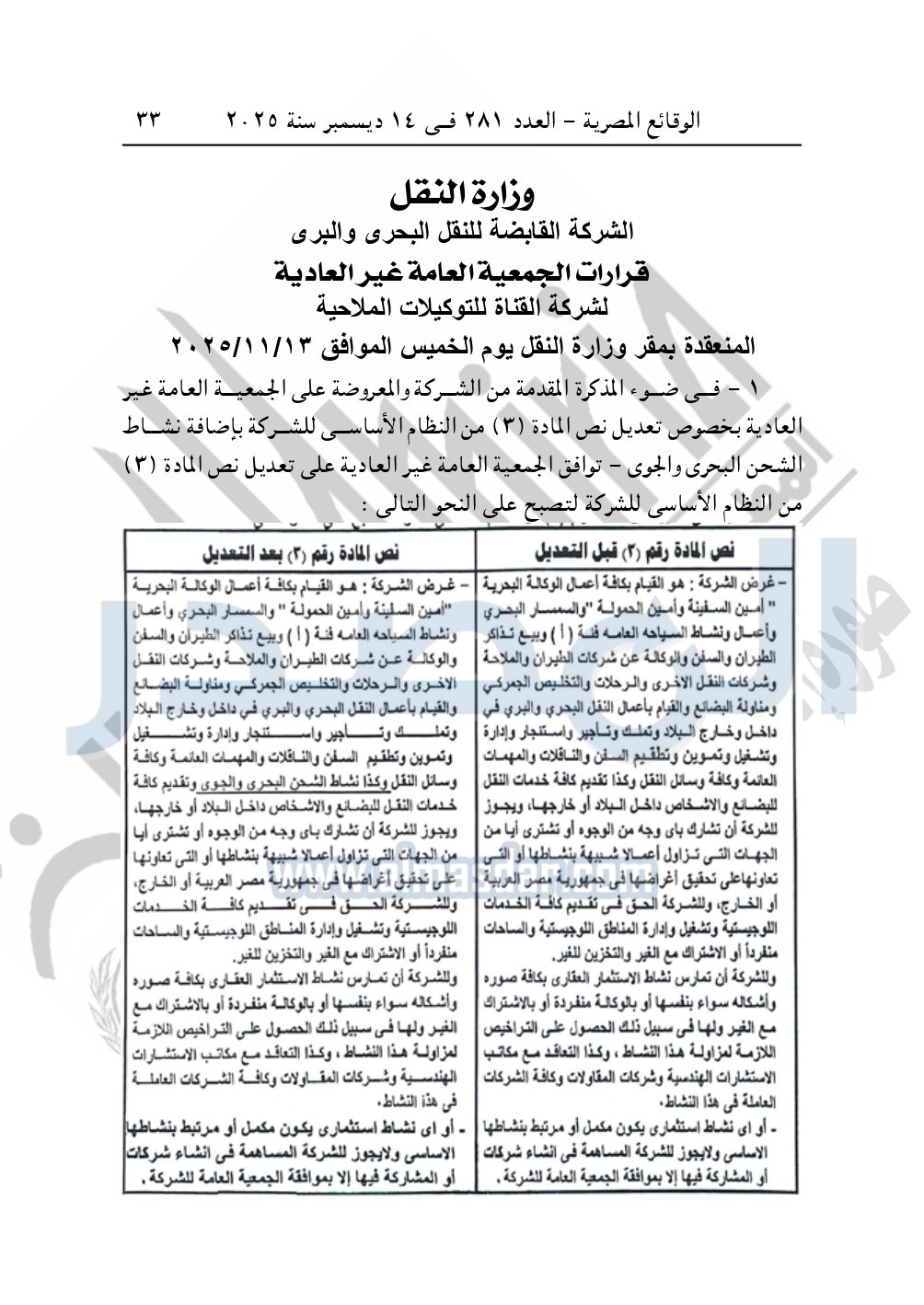 نشرت الوقائع المصرية في العدد 281 الصادر في 14 ديسمبر سنة 2025، قرار وزارة النقل، الشركة القابضة للنقل البحرى والبرى، قرارات الجمعية العامة غير العادية لشركة القناة للتوكيلات الملاحية، المنعقدة بمقر وزارة النقل يوم الخميس الموافق 13-11-2025.