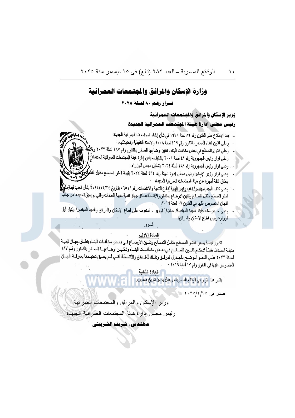 نشرت الوقائع المصرية في العدد 282 "تابع"، الصادر بتاريخ 15 ديسمبر 2025، قرار وزارة الإسكان والمرافق والمجتمعات العمرانية، رقم 80 لسنة 2025، بشأن تحديد مقابل التصالح في مخالفات البناء وتقنين الأوضاع بمدينة السادات.