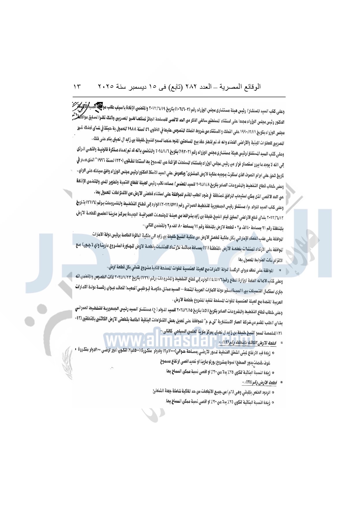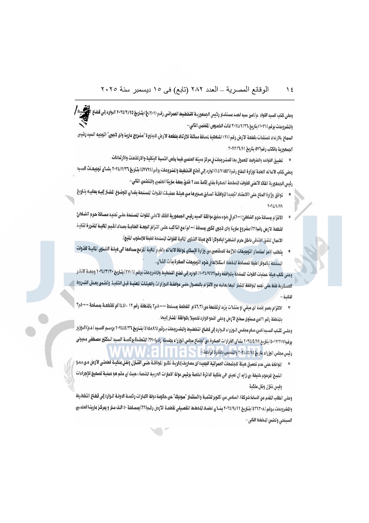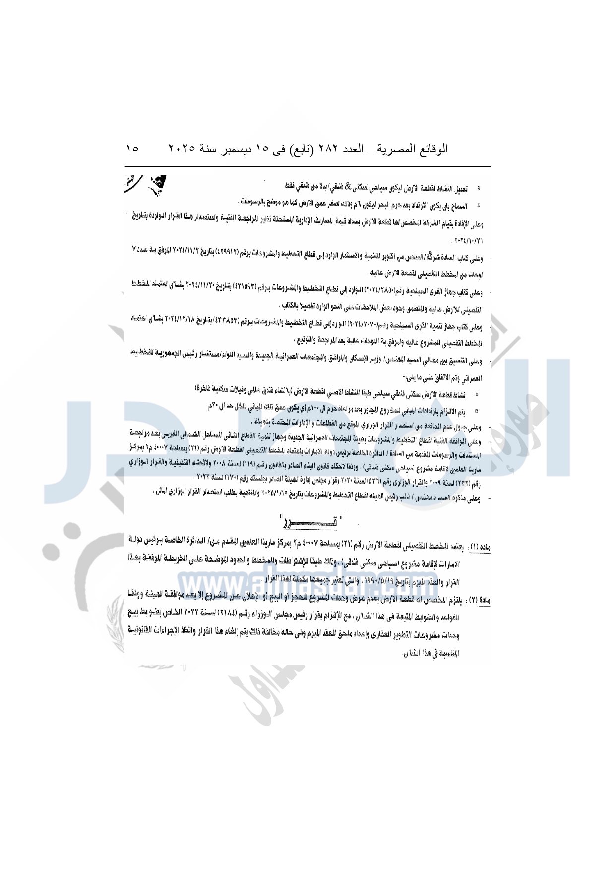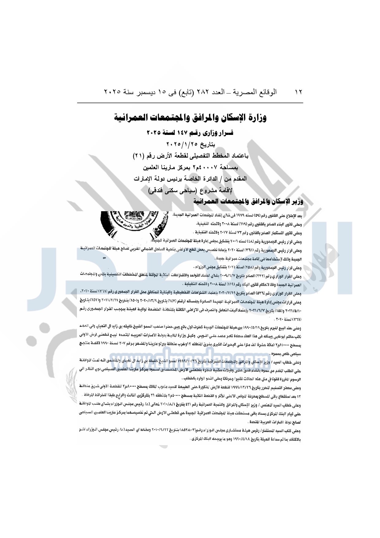 نشرت الوقائع المصرية في العدد 282 "تابع"، الصادر بتاريخ 15 ديسمبر 2025، قرار وزارة الإسكان والمرافق والمجتمعات العمرانية، رقم 147 لسنة 2025، بتاريخ 25-1-2025، بشأن اعتماد المخطط التفصيلى لقطعة الأرض رقم "21" بمساحة 40007م2 بمركز مارينا العلمين المقدم من الدائرة الخاصة برئيس دولة الإمارات لإقامة مشروع "سياحى سكنى فندقي".