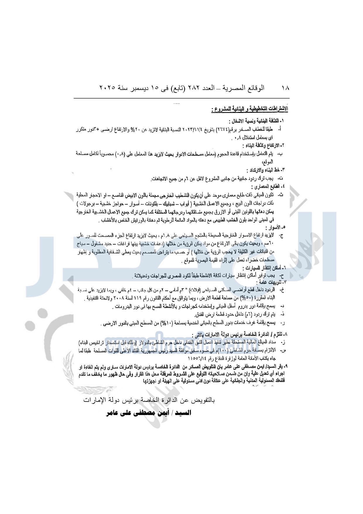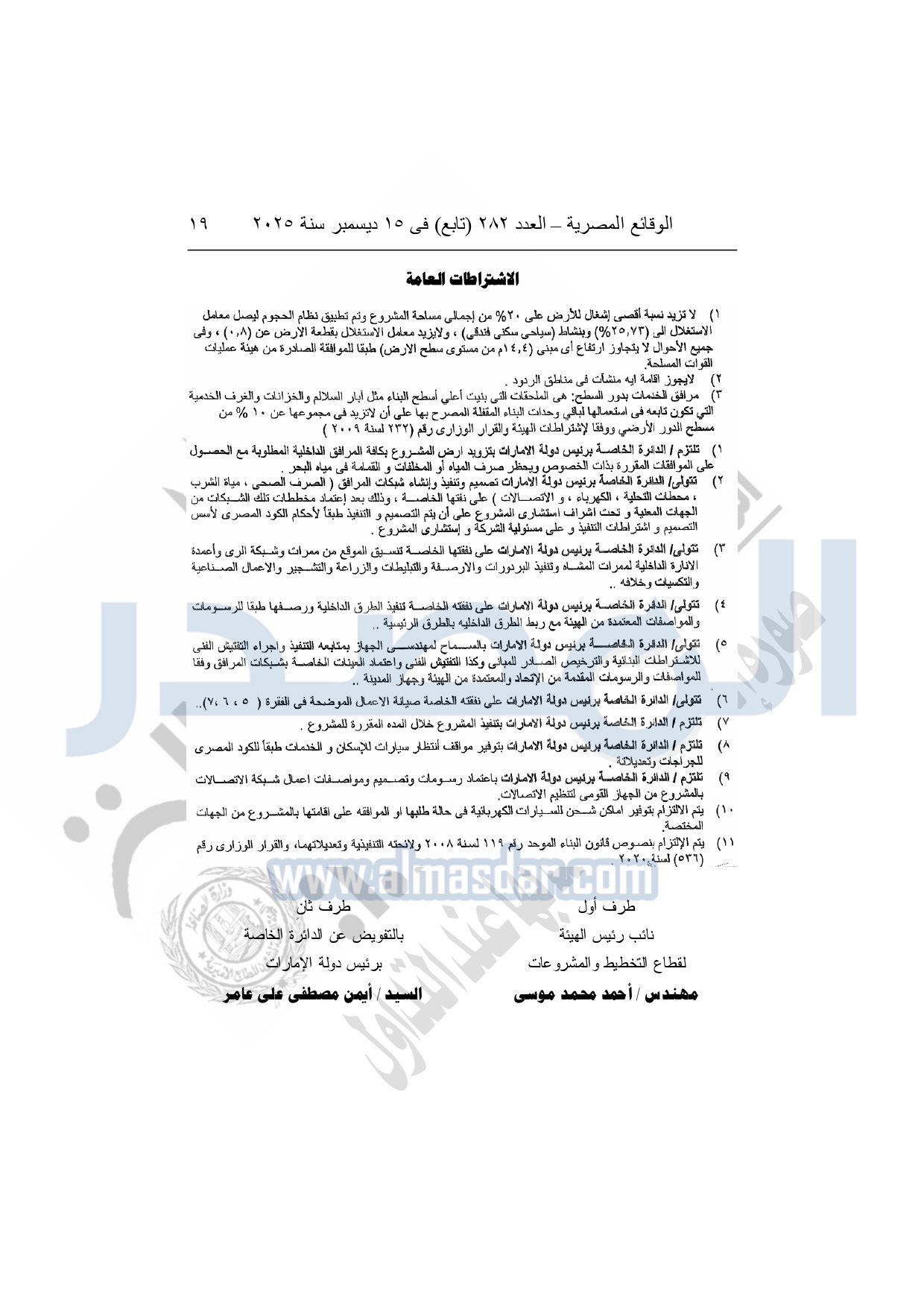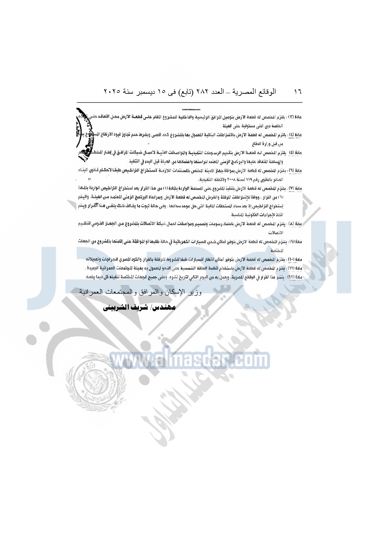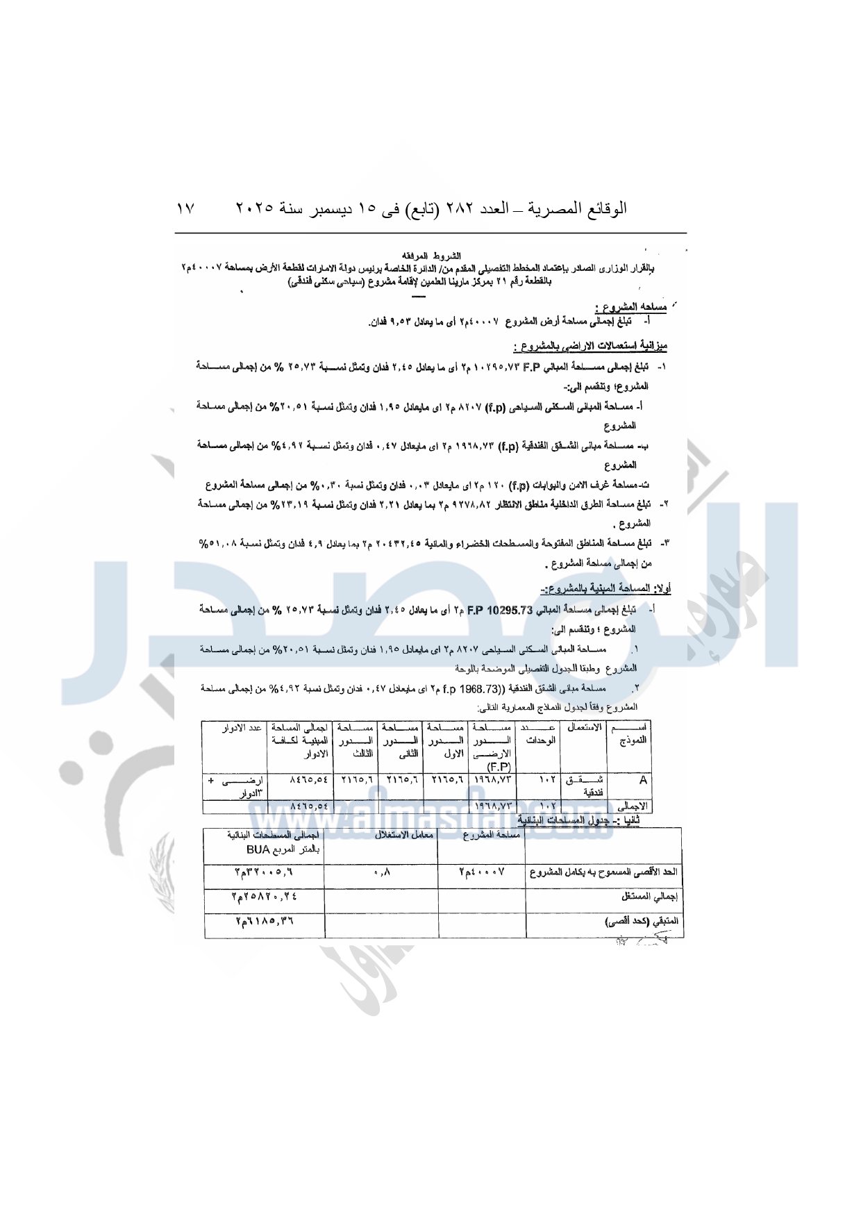 نشرت الوقائع المصرية في العدد 282 "تابع"، الصادر بتاريخ 15 ديسمبر 2025، قرار وزارة الإسكان والمرافق والمجتمعات العمرانية، رقم 147 لسنة 2025، بتاريخ 25-1-2025، بشأن اعتماد المخطط التفصيلى لقطعة الأرض رقم "21" بمساحة 40007م2 بمركز مارينا العلمين المقدم من الدائرة الخاصة برئيس دولة الإمارات لإقامة مشروع "سياحى سكنى فندقي".
