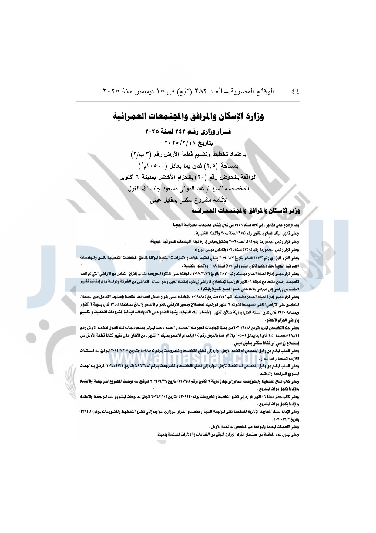 نشرت الوقائع المصرية في العدد 282 "تابع"، الصادر بتاريخ 15 ديسمبر 2025، قرار وزارة الإسكان والمرافق والمجتمعات العمرانية، رقم 242 لسنة 2025، بتاريخ 18-2-2025، بشأن اعتماد تخطيط وتقسيم قطعة الأرض رقم "3ب / 2" بمساحة "2.5" فدان بما يعادل "10500م2" الواقعة بالحوض رقم "20" بالحزام الأخضر بمدينة 6 أكتوبر المخصصة لعبد المولى مسعود جاب الله الغول لإقامة مشروع سكنى بمقابل عيني.