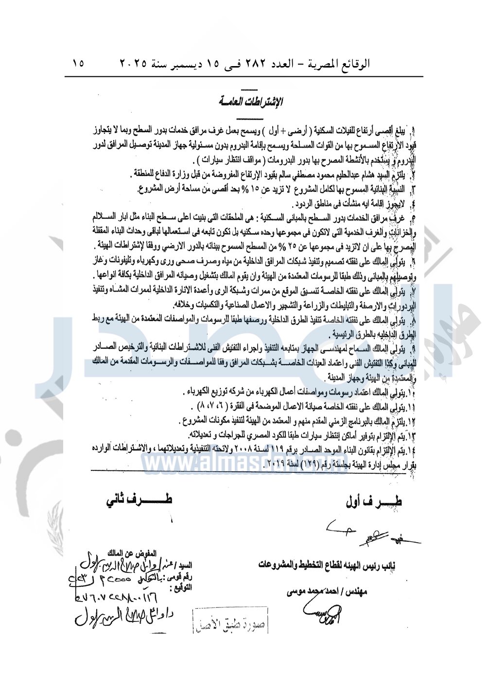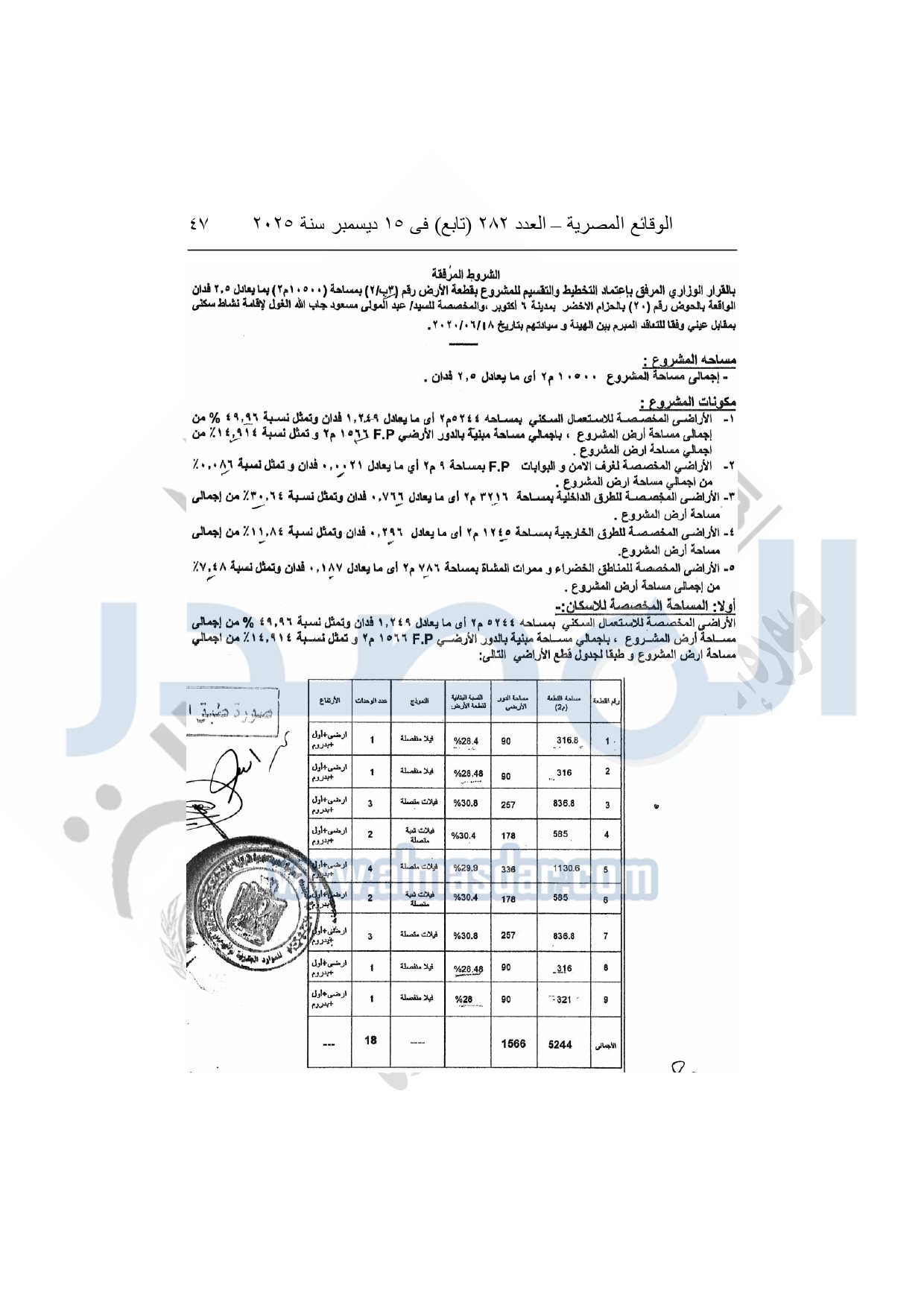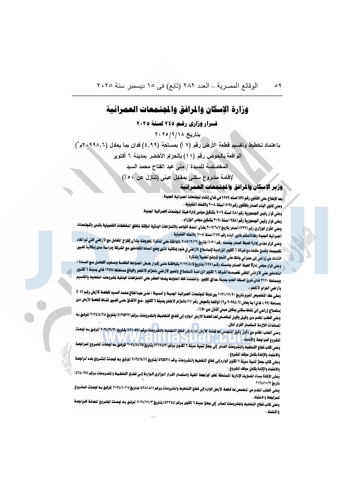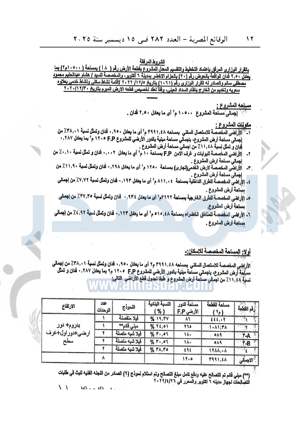كما نشرت الوقائع المصرية في العدد 282 "تابع"، الصادر بتاريخ 15 ديسمبر 2025، قرار وزارة الإسكان والمرافق والمجتمعات العمرانية، رقم 245 لسنة 2025، بتاريخ 18-2-2025، بشأن اعتماد تخطيط وتقسيم قطعة الأرض رقم "7 أ" بمساحة "4.99" فدان بما يعادل "20998.6م2" الواقعة بالحوض رقم "11" بالحزام الأخضر بمدينة 6 أكتوبر المخصصة لمنى عبد الفتاح محمد السيد لإقامة مشروع سكنى بمقابل عينى "تنازل عن 50%".