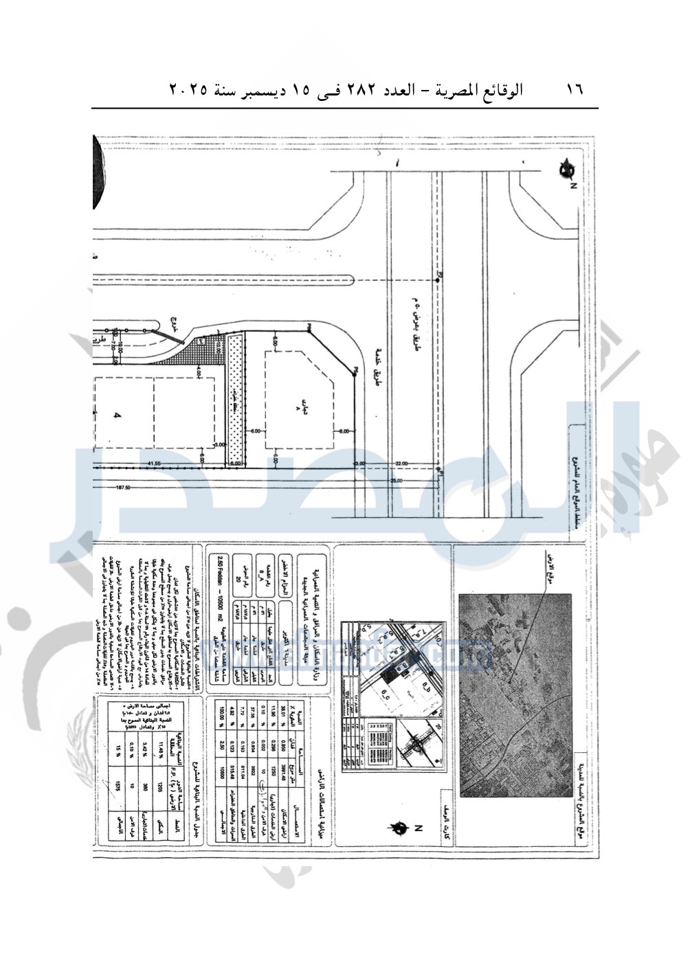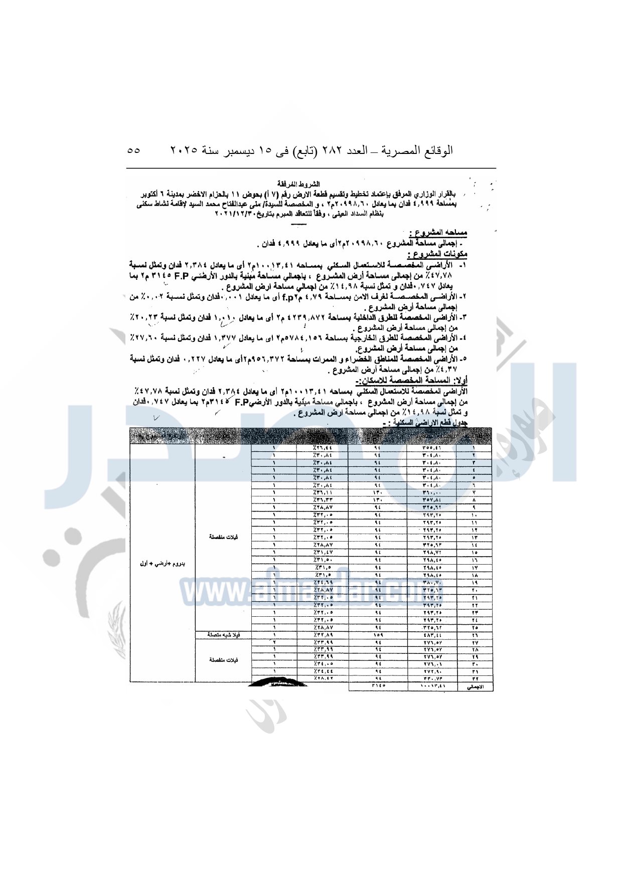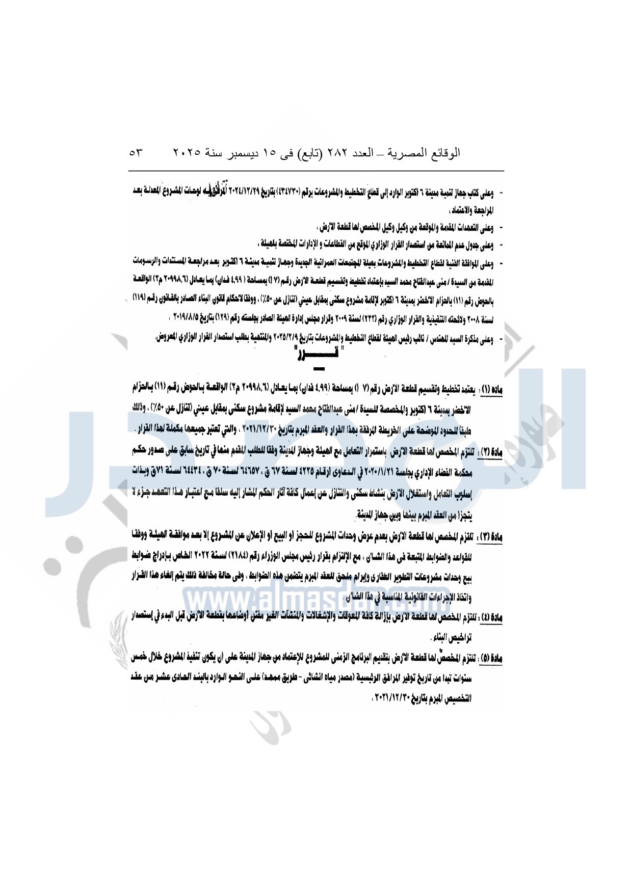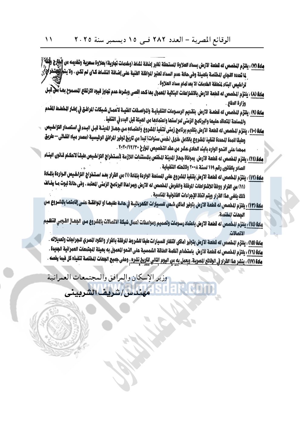 كما نشرت الوقائع المصرية في العدد 282 "تابع"، الصادر بتاريخ 15 ديسمبر 2025، قرار وزارة الإسكان والمرافق والمجتمعات العمرانية، رقم 245 لسنة 2025، بتاريخ 18-2-2025، بشأن اعتماد تخطيط وتقسيم قطعة الأرض رقم "7 أ" بمساحة "4.99" فدان بما يعادل "20998.6م2" الواقعة بالحوض رقم "11" بالحزام الأخضر بمدينة 6 أكتوبر المخصصة لمنى عبد الفتاح محمد السيد لإقامة مشروع سكنى بمقابل عينى "تنازل عن 50%".