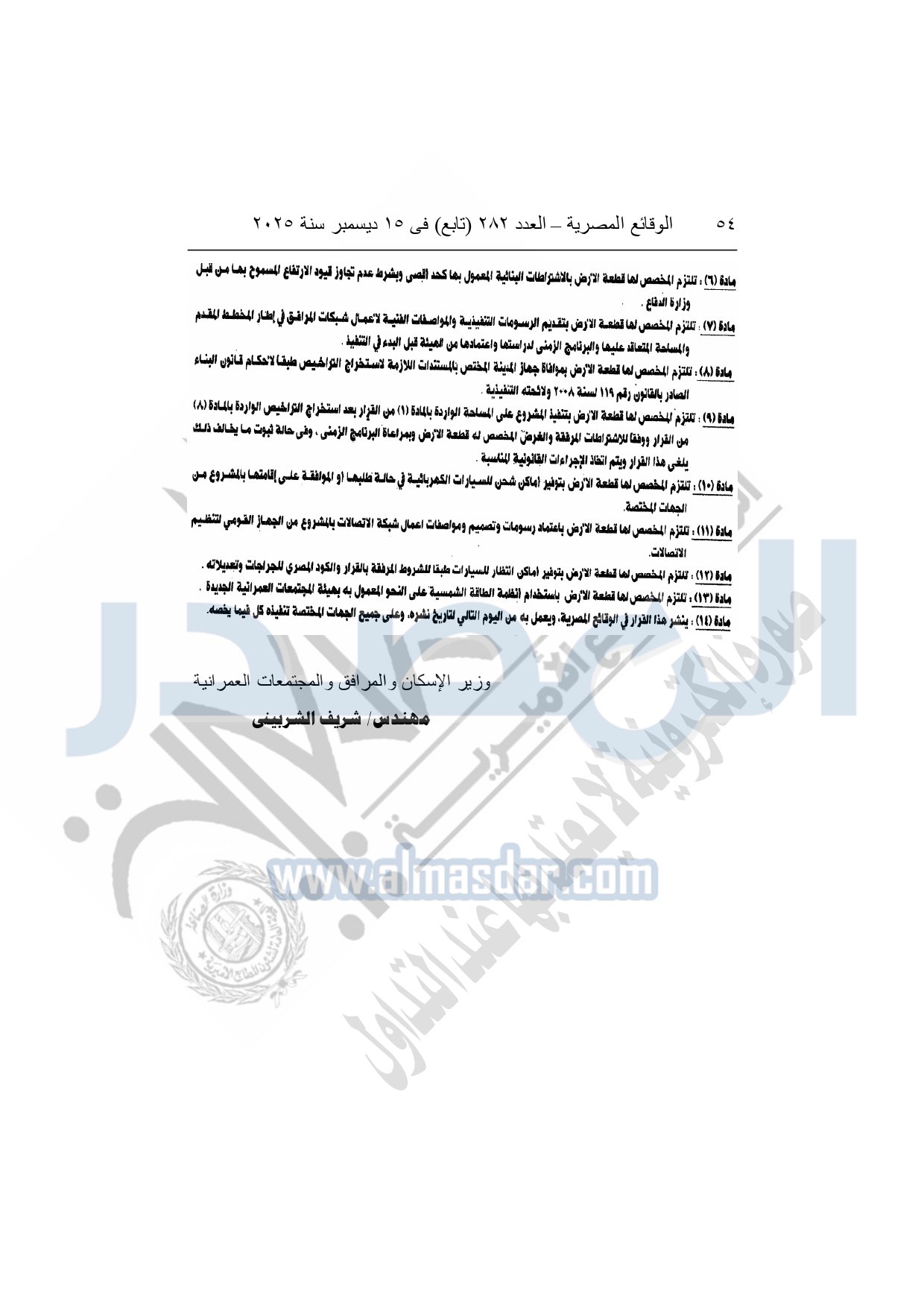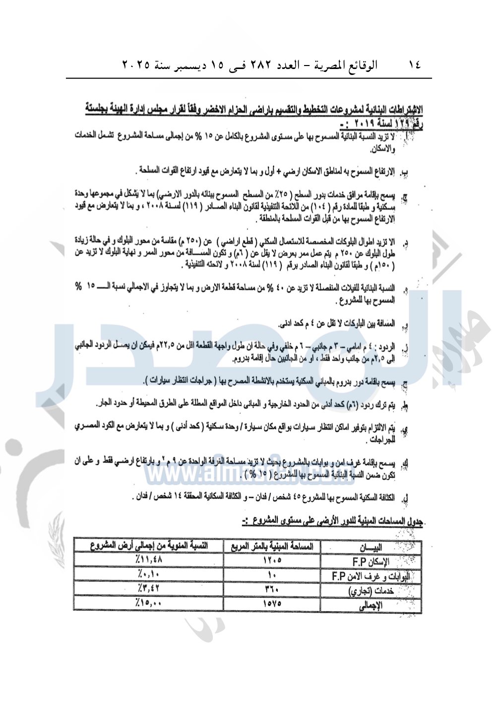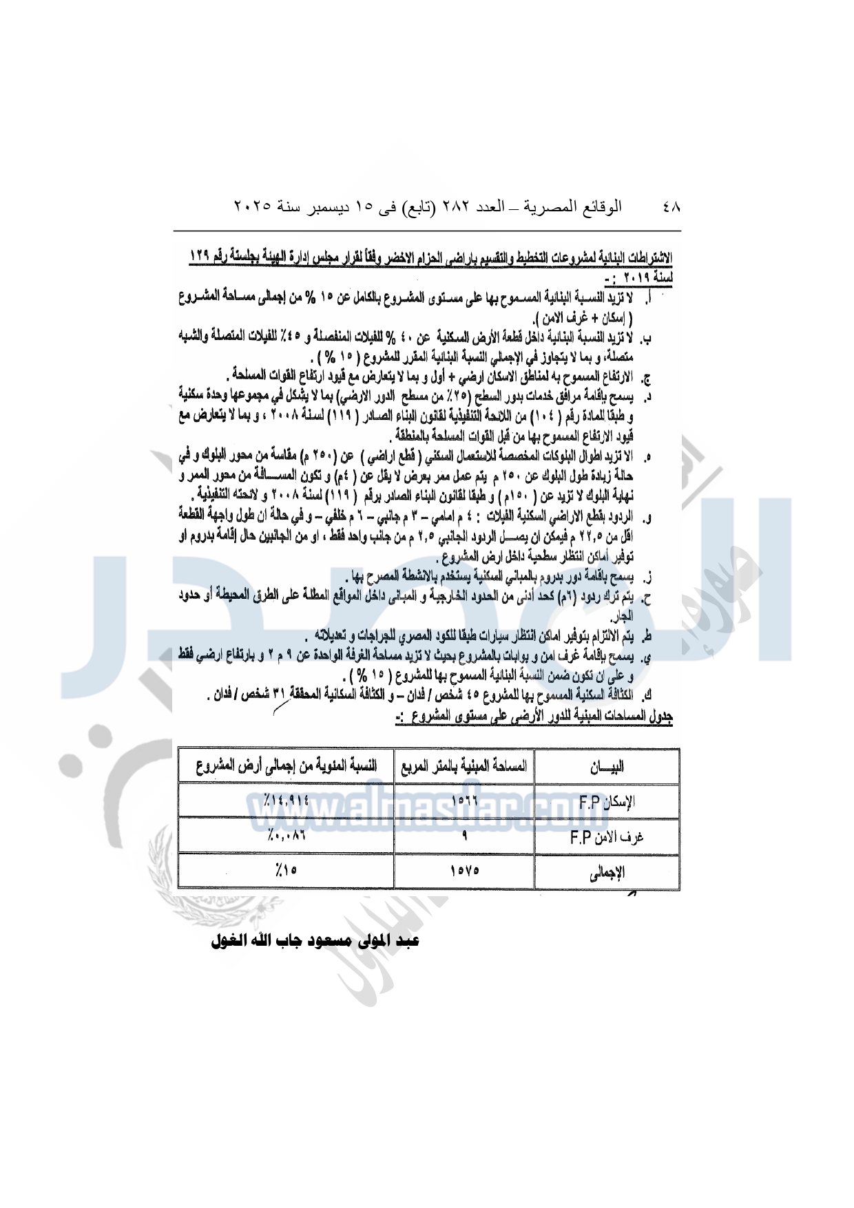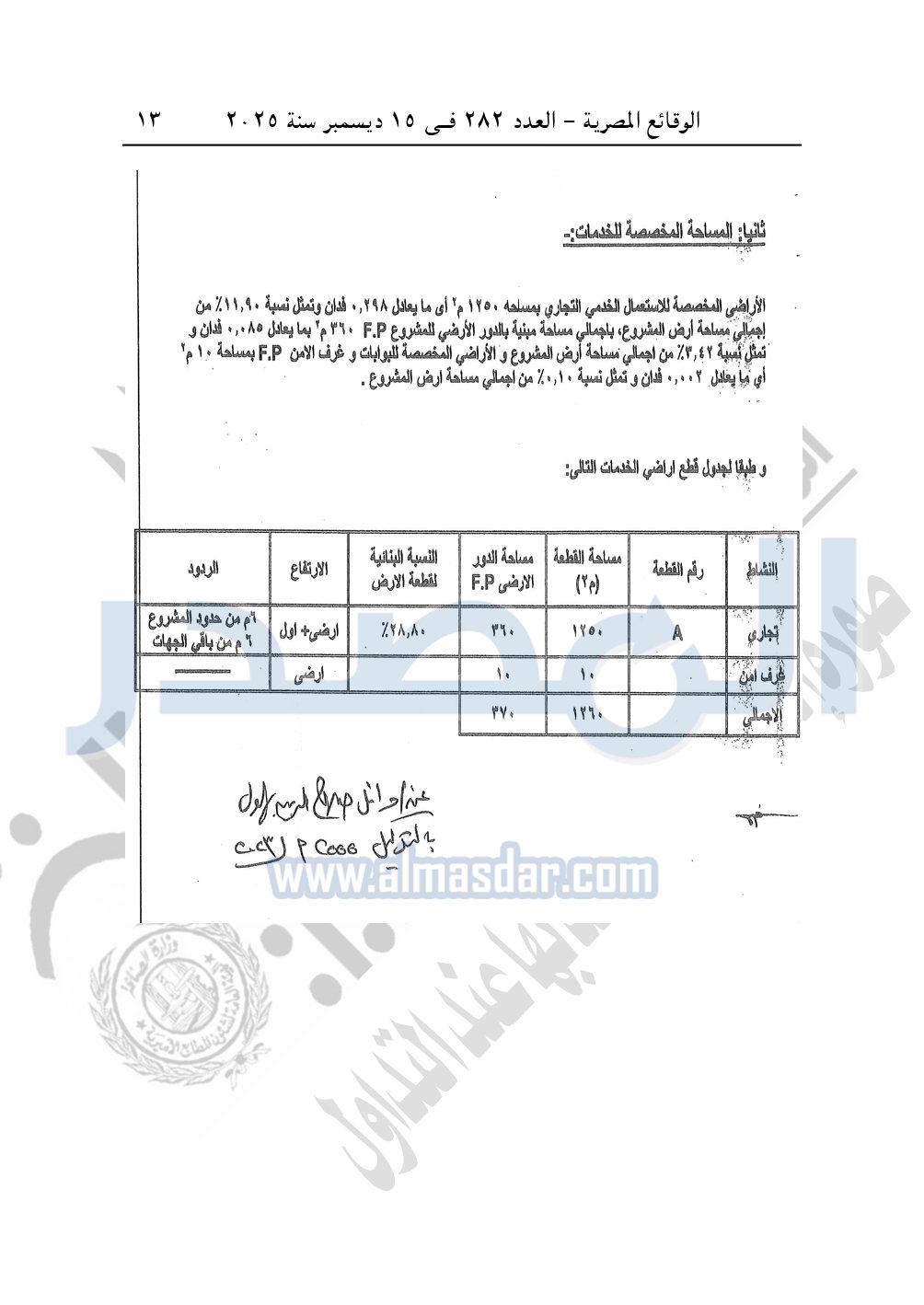 كما نشرت الوقائع المصرية في العدد 282 "تابع"، الصادر بتاريخ 15 ديسمبر 2025، قرار وزارة الإسكان والمرافق والمجتمعات العمرانية، رقم 245 لسنة 2025، بتاريخ 18-2-2025، بشأن اعتماد تخطيط وتقسيم قطعة الأرض رقم "7 أ" بمساحة "4.99" فدان بما يعادل "20998.6م2" الواقعة بالحوض رقم "11" بالحزام الأخضر بمدينة 6 أكتوبر المخصصة لمنى عبد الفتاح محمد السيد لإقامة مشروع سكنى بمقابل عينى "تنازل عن 50%".