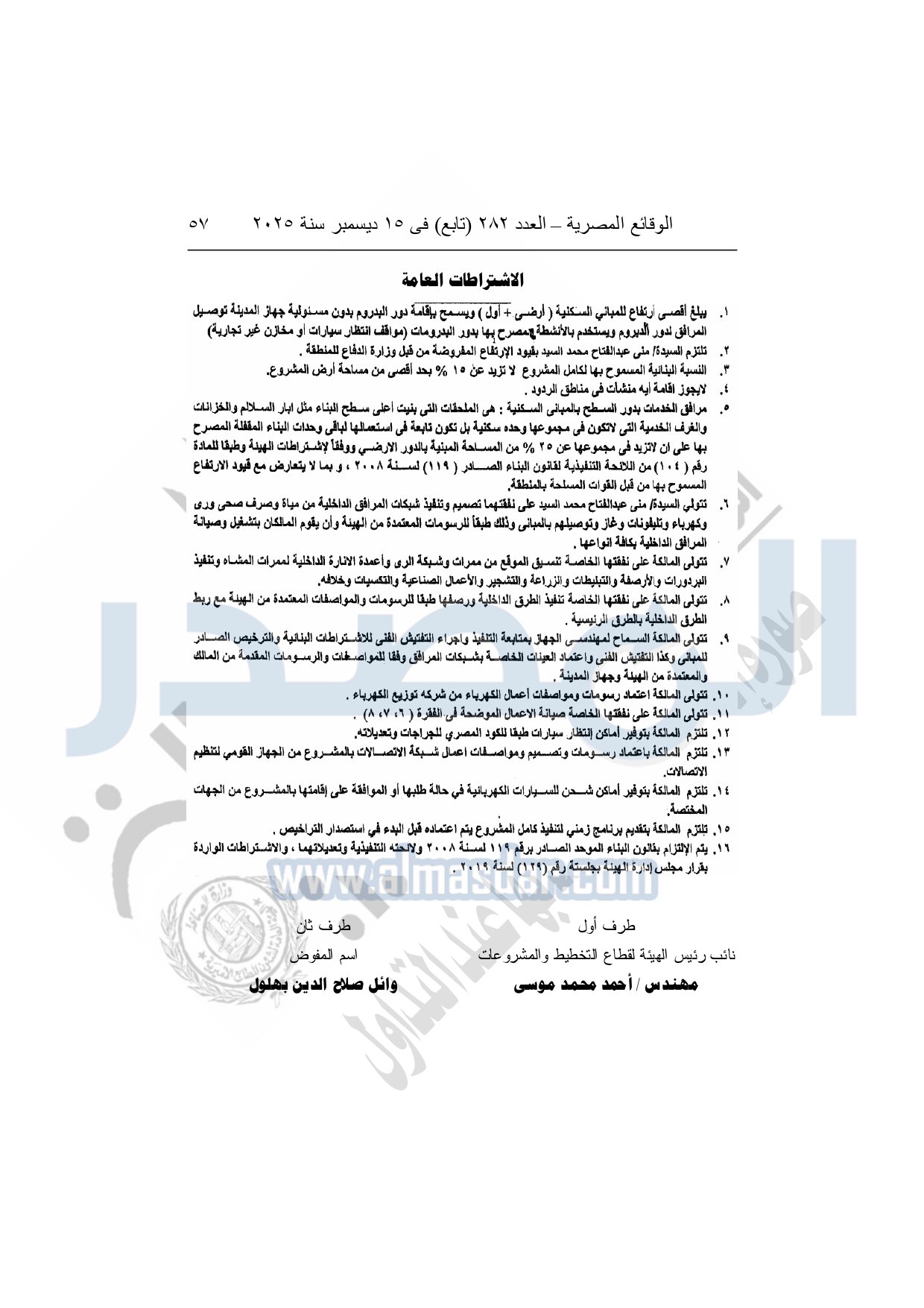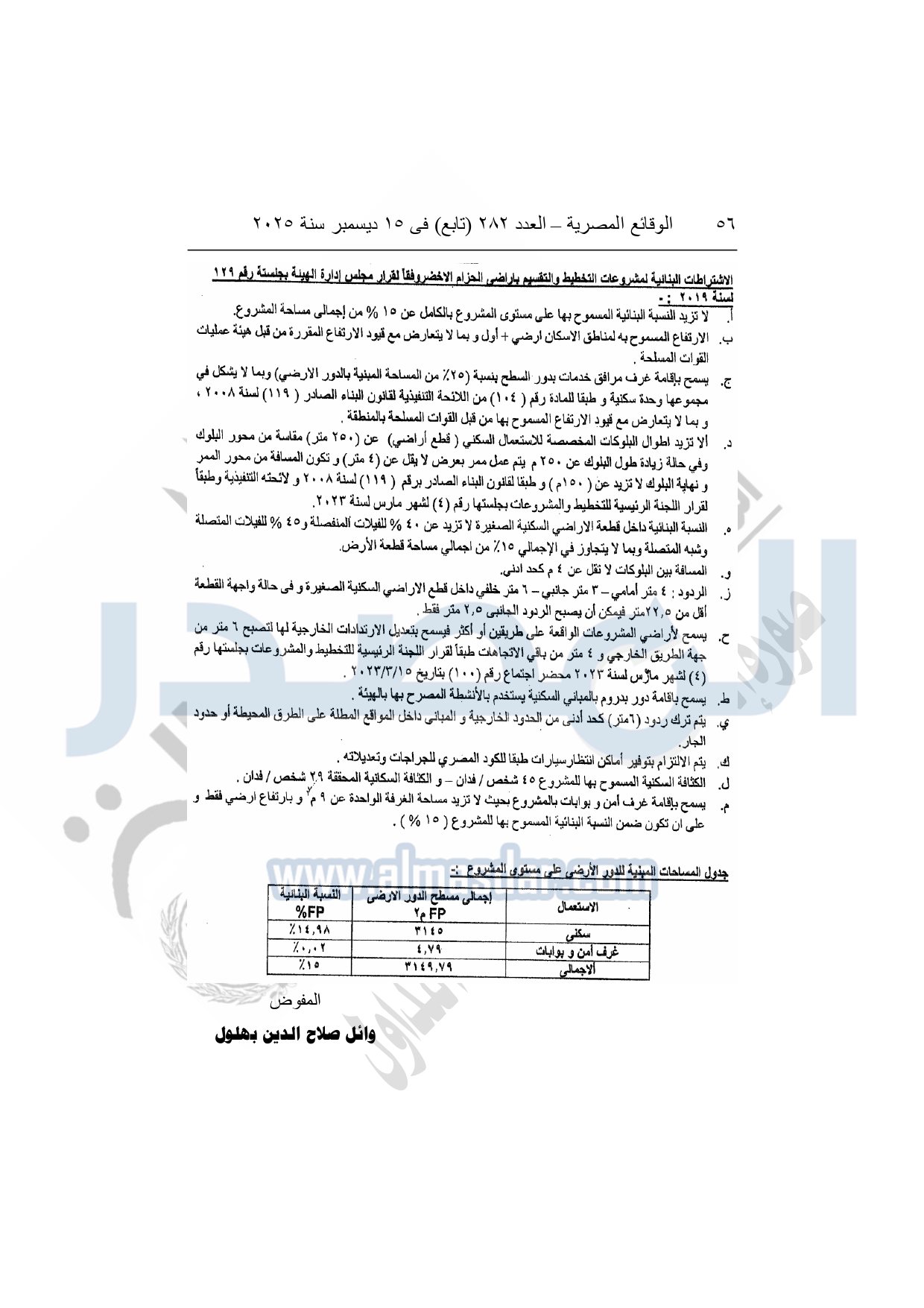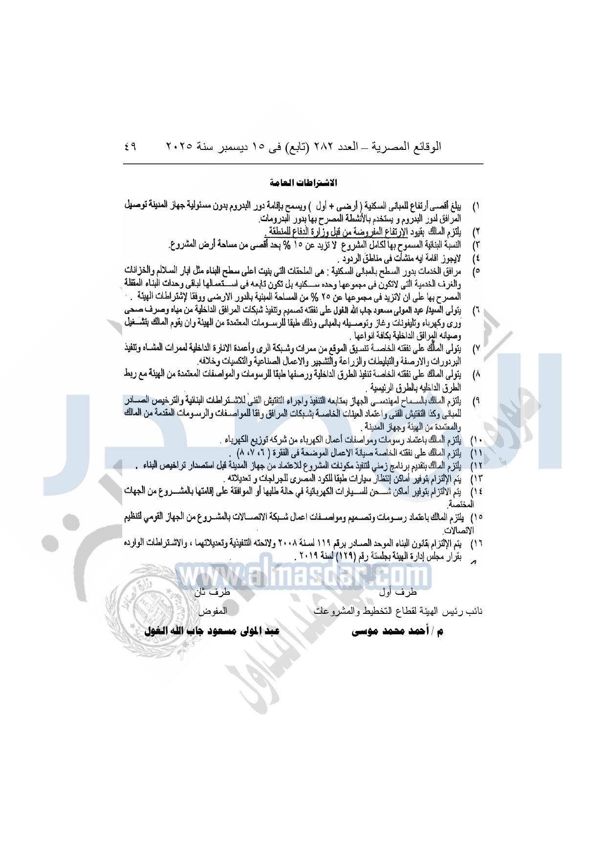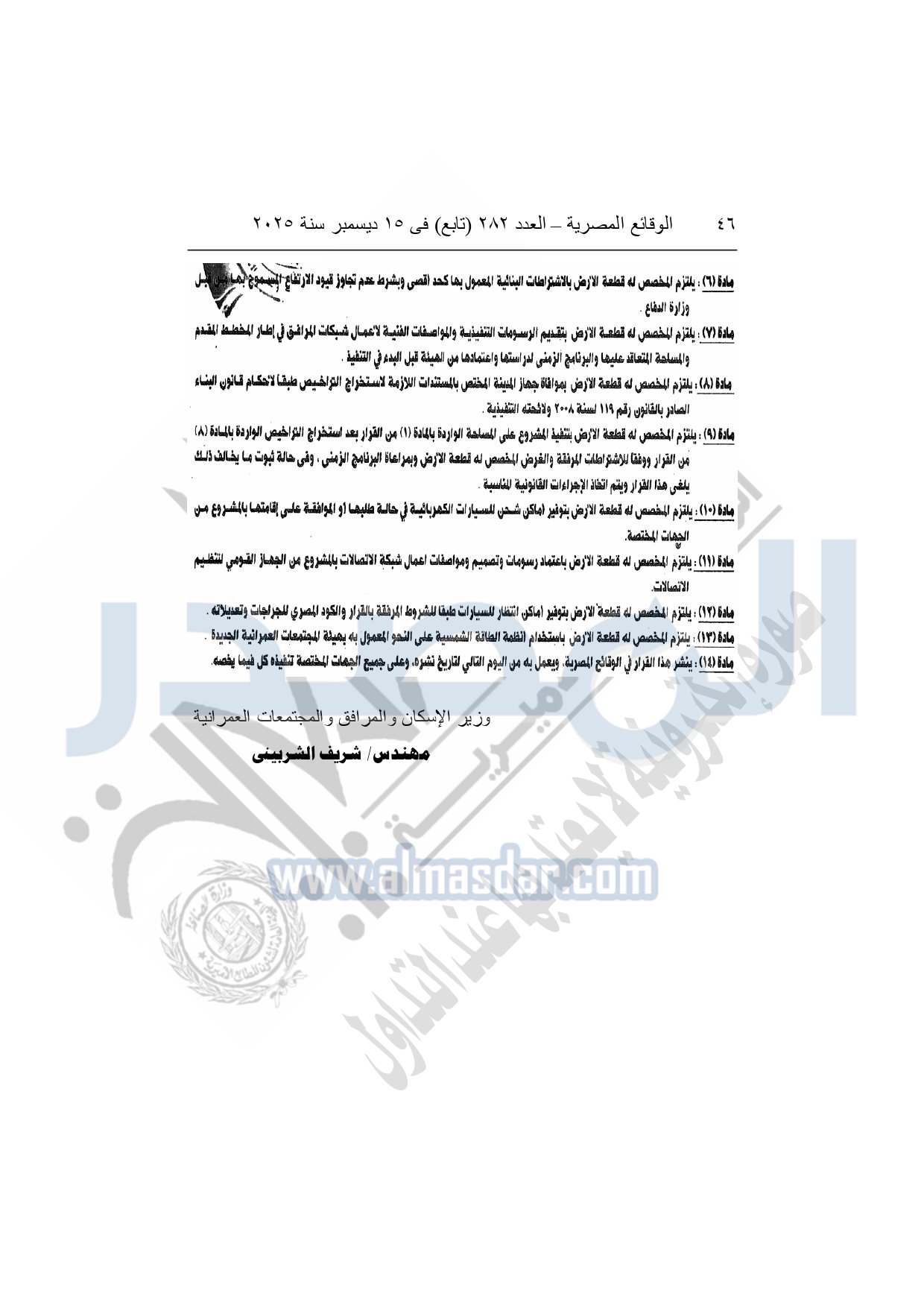 كما نشرت الوقائع المصرية في العدد 282 "تابع"، الصادر بتاريخ 15 ديسمبر 2025، قرار وزارة الإسكان والمرافق والمجتمعات العمرانية، رقم 245 لسنة 2025، بتاريخ 18-2-2025، بشأن اعتماد تخطيط وتقسيم قطعة الأرض رقم "7 أ" بمساحة "4.99" فدان بما يعادل "20998.6م2" الواقعة بالحوض رقم "11" بالحزام الأخضر بمدينة 6 أكتوبر المخصصة لمنى عبد الفتاح محمد السيد لإقامة مشروع سكنى بمقابل عينى "تنازل عن 50%".