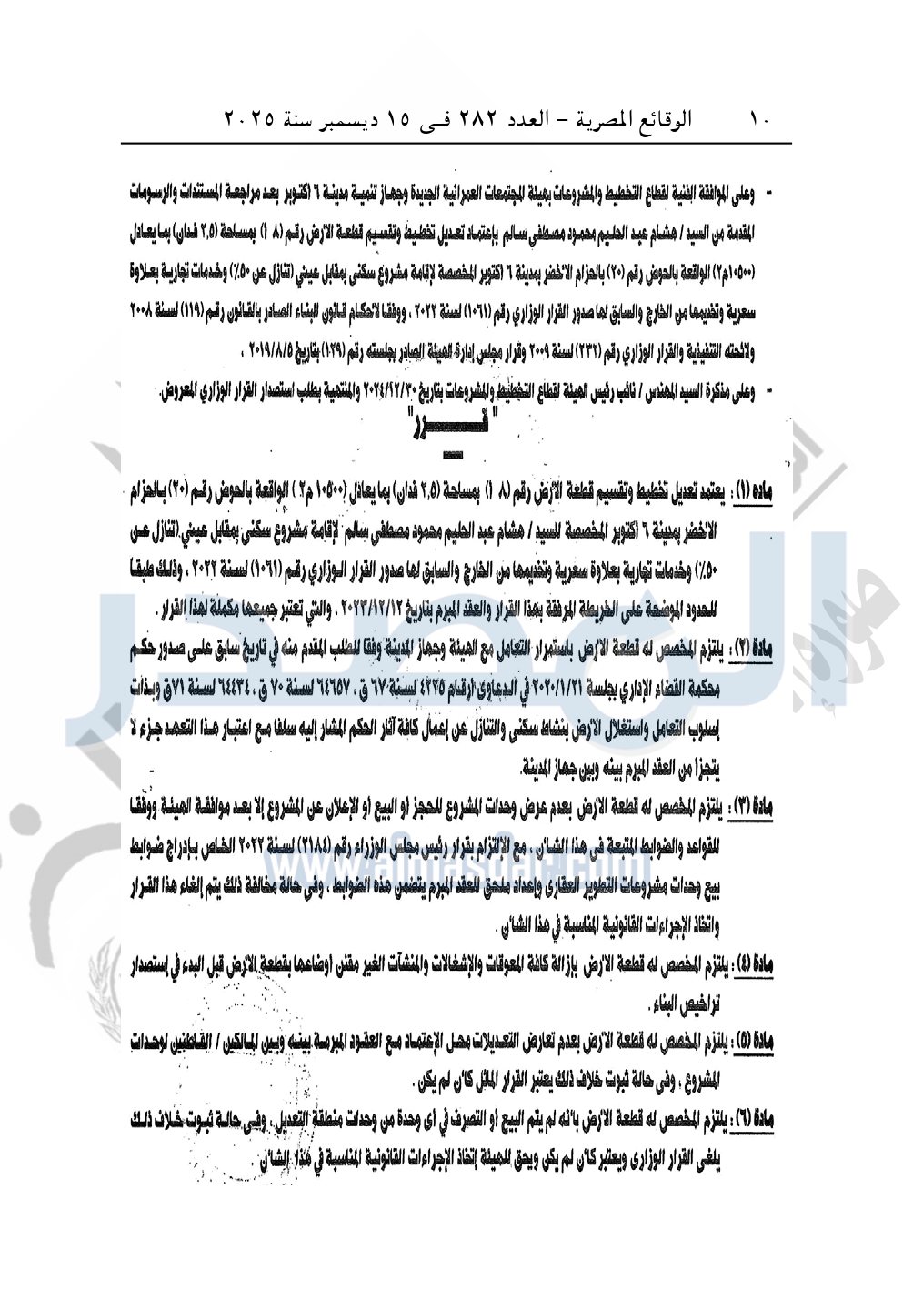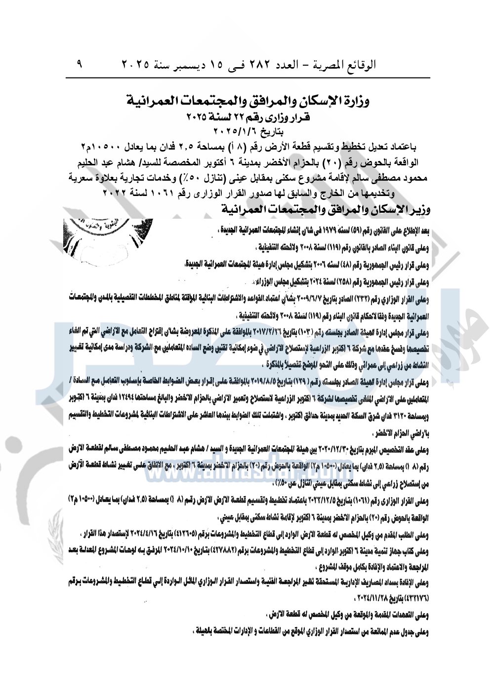 وأيضا نشرت الوقائع المصرية في العدد 282، الصادر بتاريخ 15 ديسمبر 2025، قرار وزارة الإسكان والمرافق والمجتمعات العمرانية، رقم 22 لسنة 2025، بتاريخ 6-1-2025، بشأن اعتماد تعديل تخطيط وتقسيم قطعة الأرض رقم "8 أ" بمساحة 2.5 فدان بما يعادل 10500م2 الواقعة بالحوض رقم "20" بالحزام الأخضر بمدينة 6 أكتوبر المخصصة لهشام عبد الحليم محمود مصطفى سالم لإقامة مشروع سكنى بمقابل عينى طتنازل "5%" وخدمات تجارية بعلاوة سعرية وتخديمها من الخارج والسابق لها صدور القرار الوزارى رقم 1061 لسنة 2022.