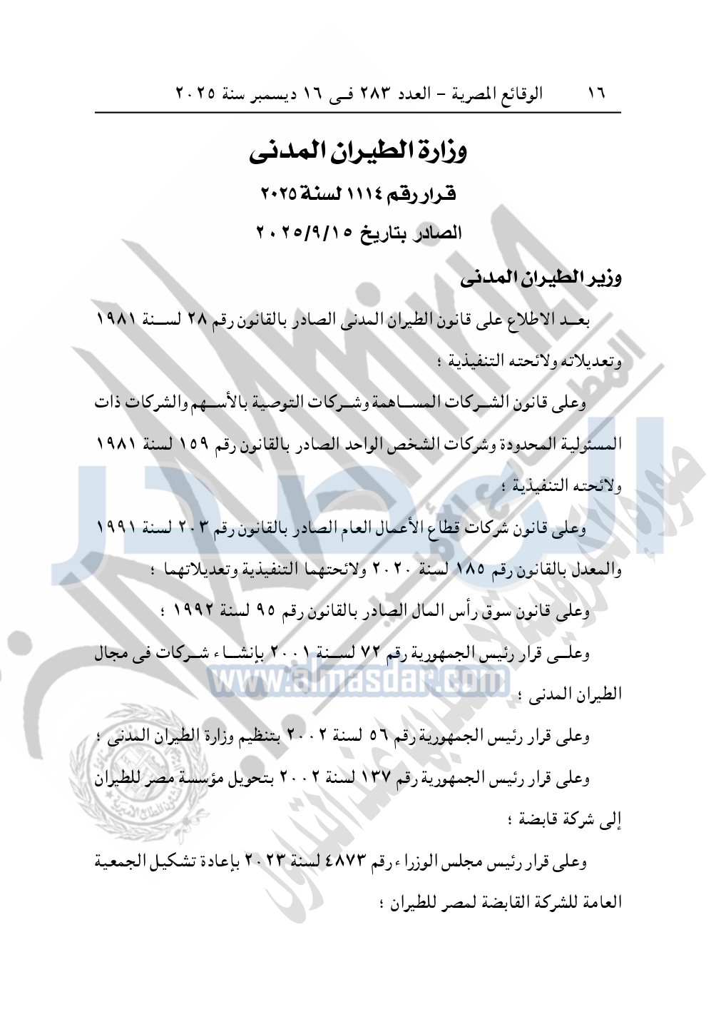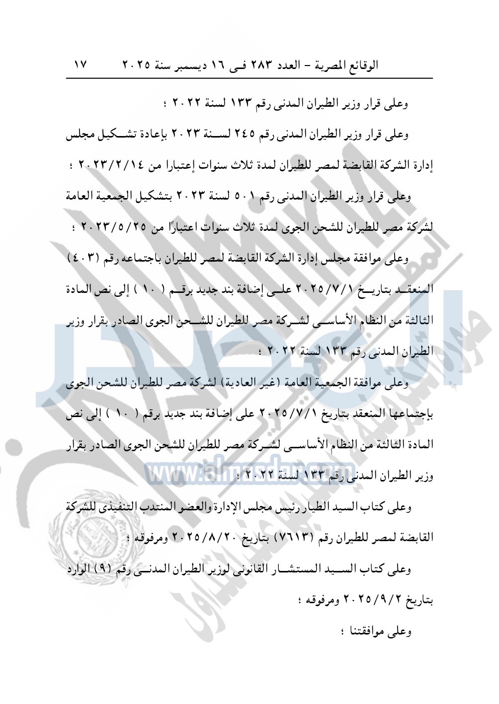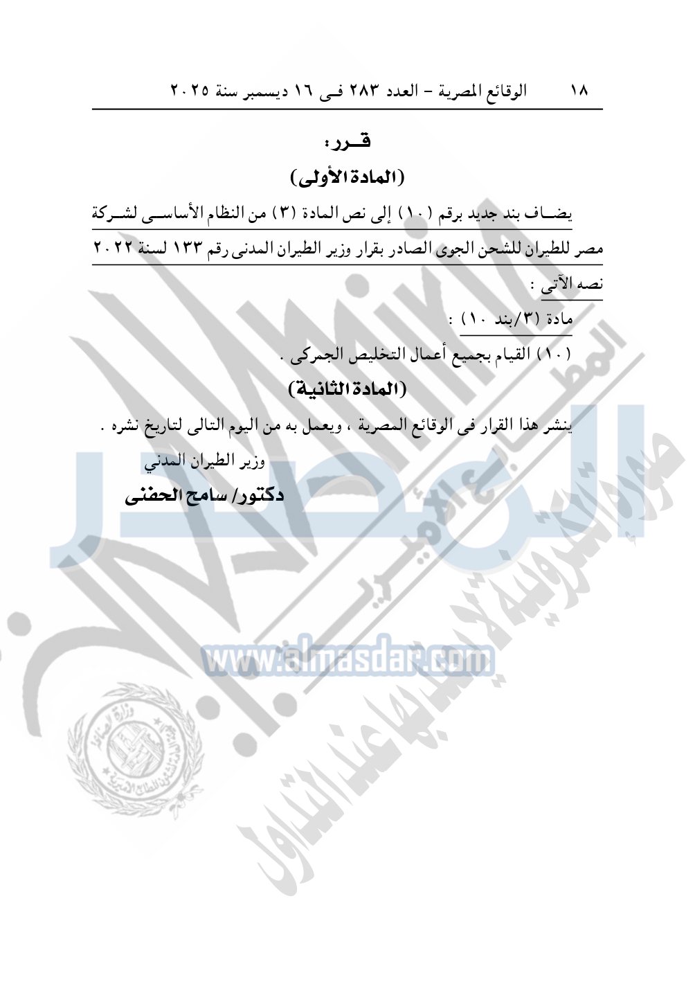 نشرت الوقائع المصرية، في العدد 283، الصادر في 16 ديسمبر سنة 2025، قرار وزارة الطيران المدنى، رقم 1114 لسنة 2025، بتاريخ 15-9-2025، بشأن إضافة بند جديد من النظام الأساسي لشركة مصر للطيران للشحن الجوى.