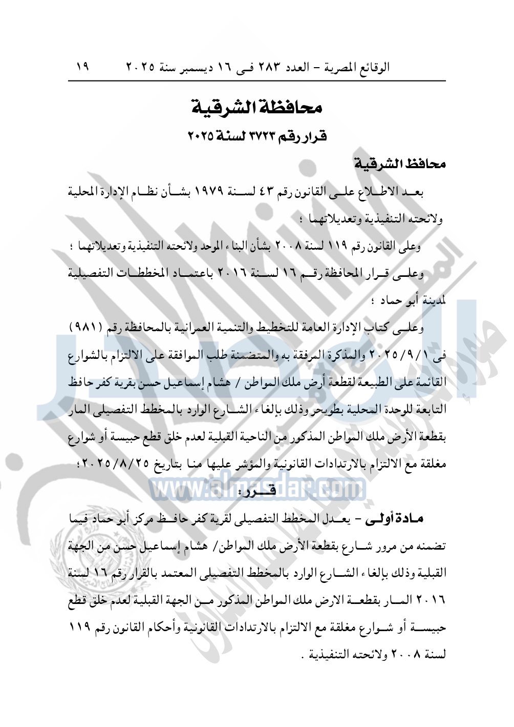 نشرت الوقائع المصرية، في العدد 283، الصادر في 16 ديسمبر سنة 2025، قرار محافظة الشرقية، رقم 3723 لسنة 2025، بشأن تعديل المخطط التفصیلی لقرية كفر حافظ.