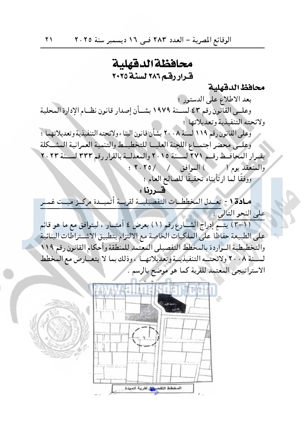 كما نشرت الوقائع المصرية، في العدد 283، الصادر في 16 ديسمبر سنة 2025، قرار محافظة الدقهلية، رقم 286 لسنة 2025، بشأن تعديل المخططات التفصيلية لقرية أتميدة.