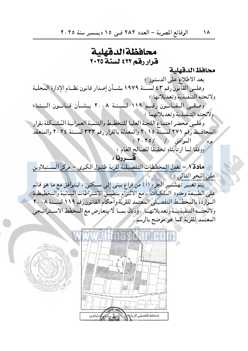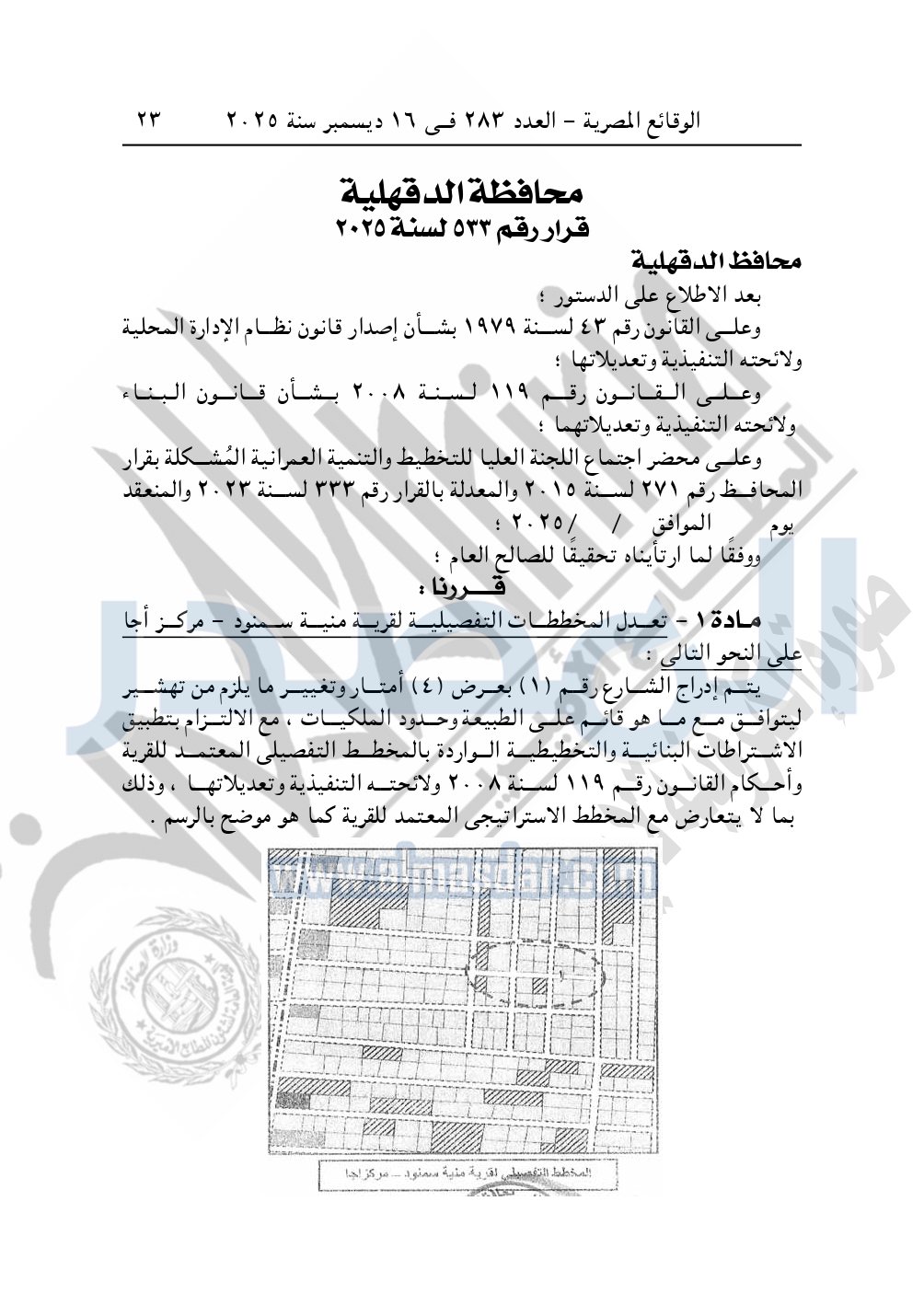 وأيضا نشرت الوقائع المصرية، في العدد 283، الصادر في 16 ديسمبر سنة 2025، قرار محافظة الدقهلية، رقم 533 لسنة 2025، بشأن تعديل المخططات التفصيلية لقرية منية سمنود.