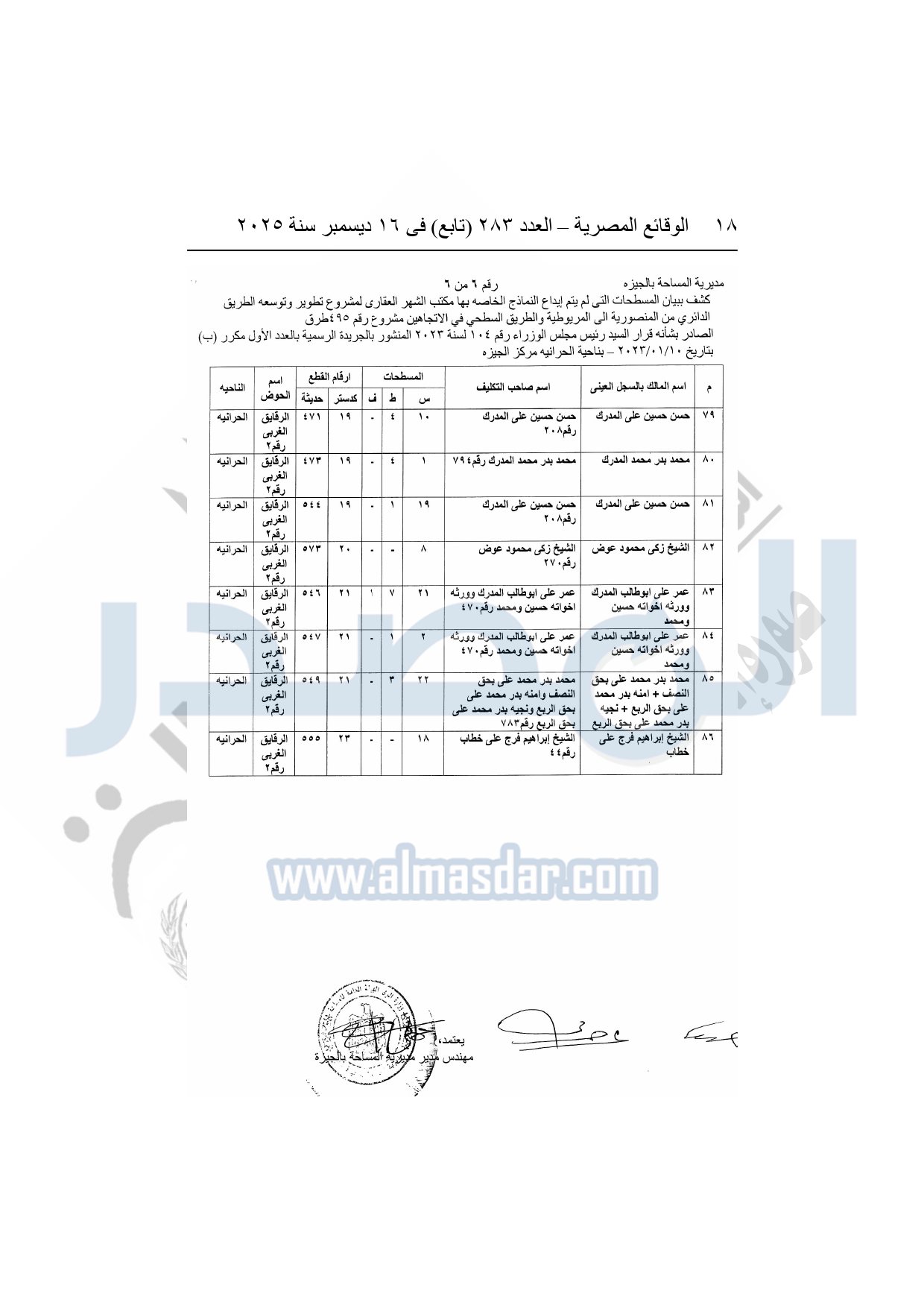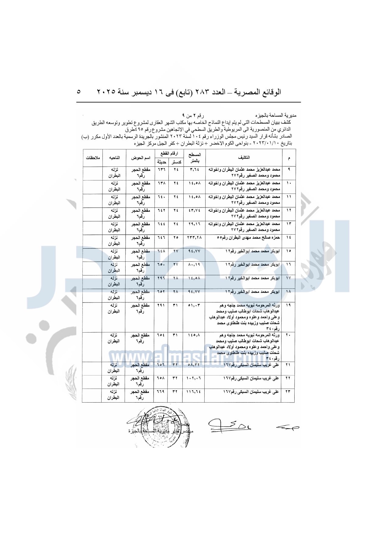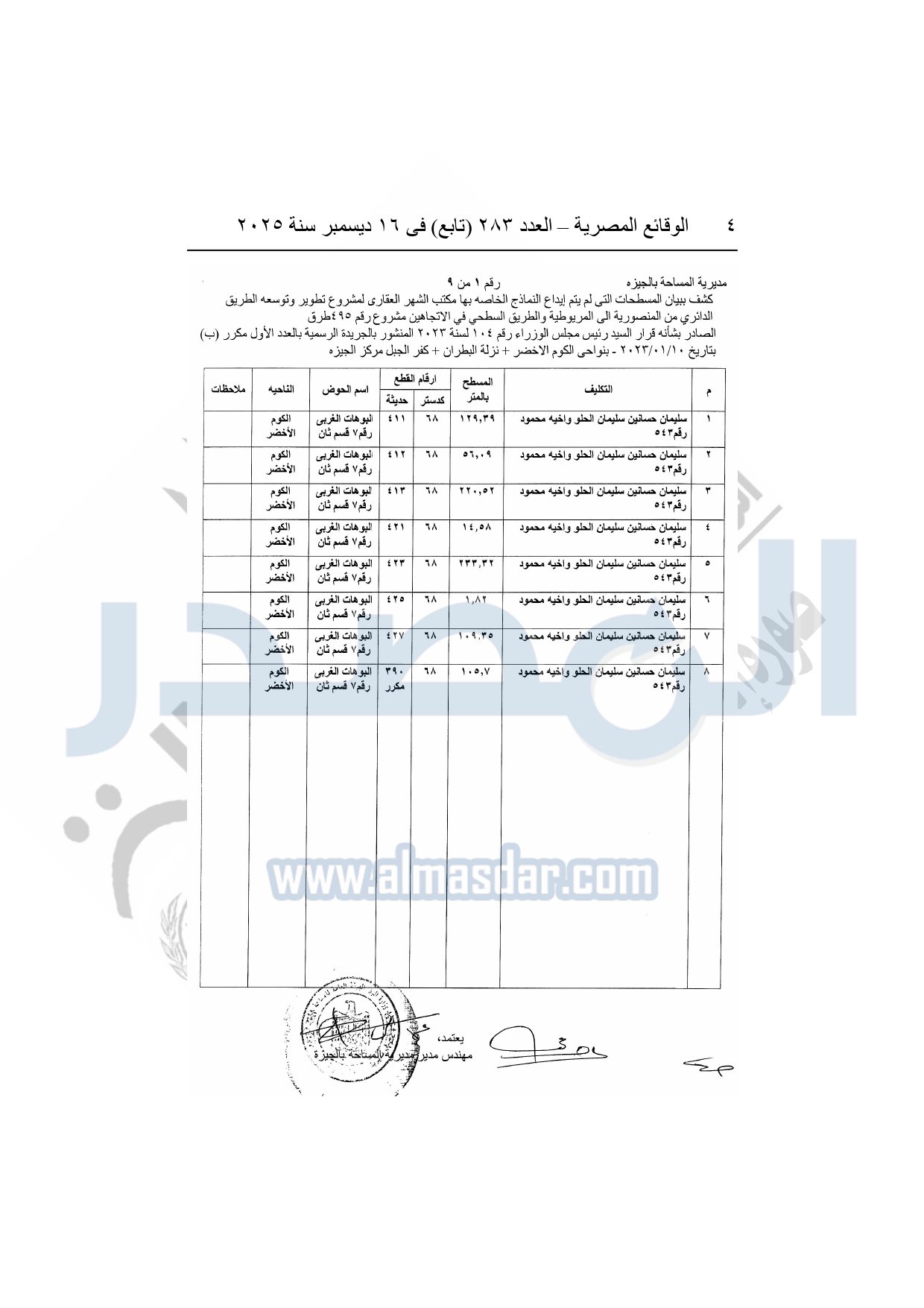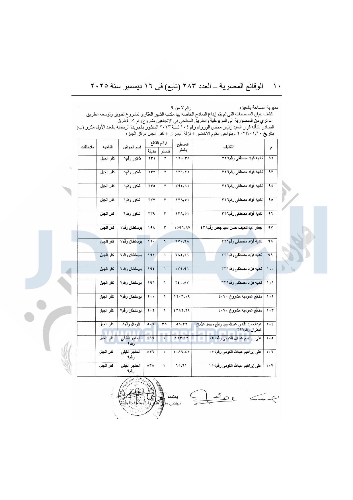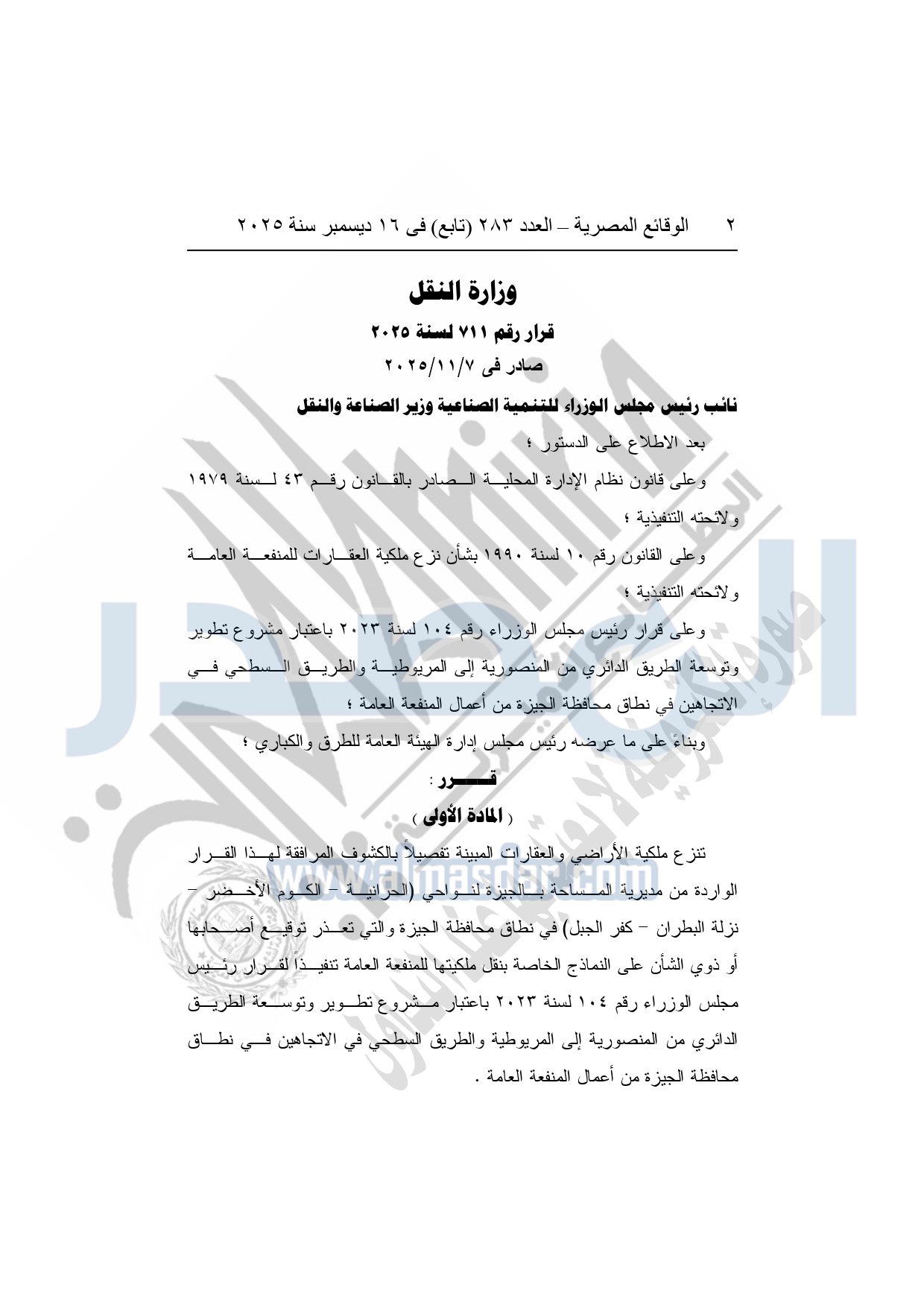 نشرت الوقائع المصرية، في العدد 283 "تابع"، الصادر في 16 ديسمبر سنة 2025، قرار وزارة النقل، رقم 7811 لسنة 2025، صادر في 7-11-2025، بشأن نزع ملكية أراضي وعقارات لتنفيذ مشروع تطوير وتوسعة الطريق الدائري بمحافظة الجيزة.