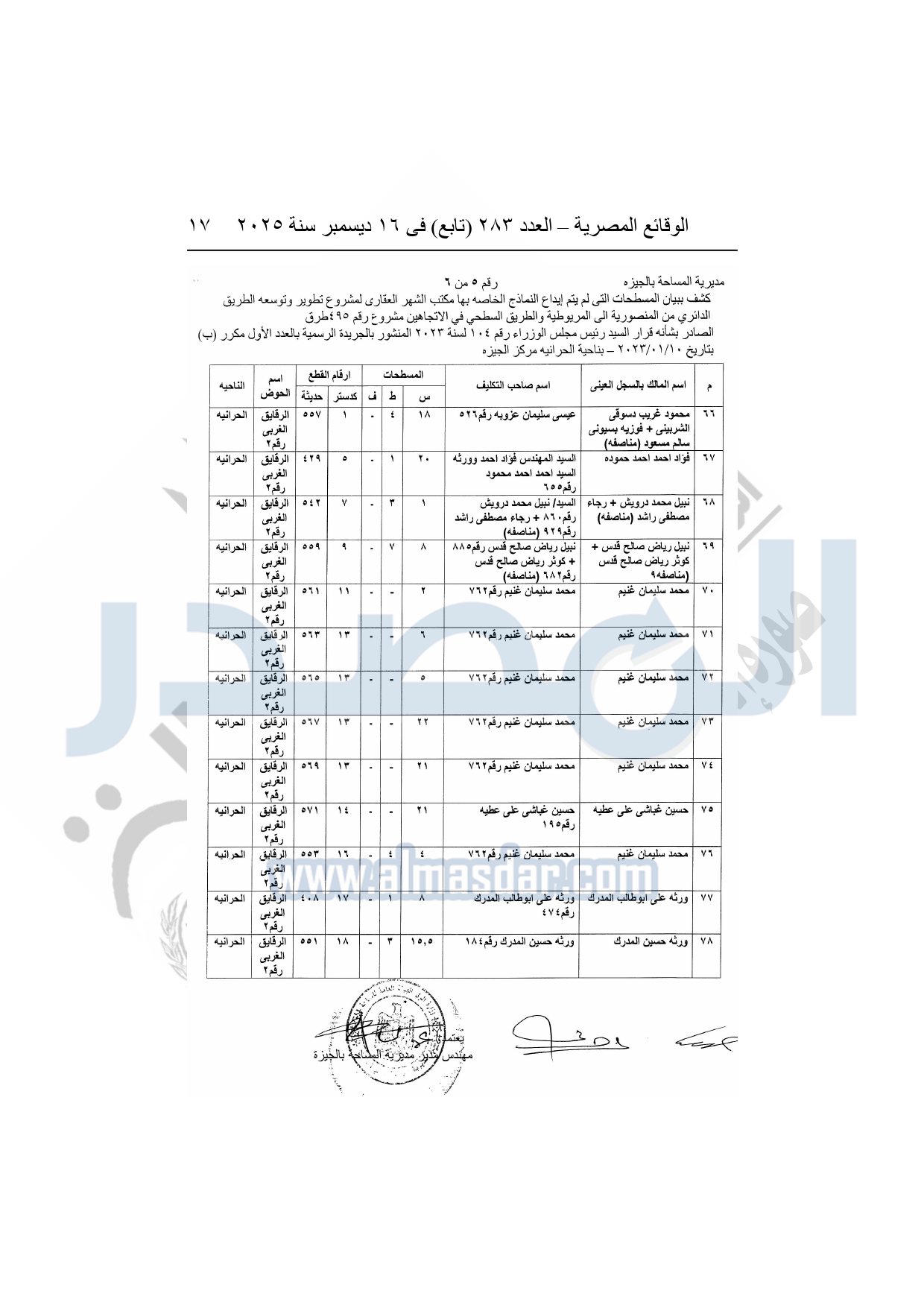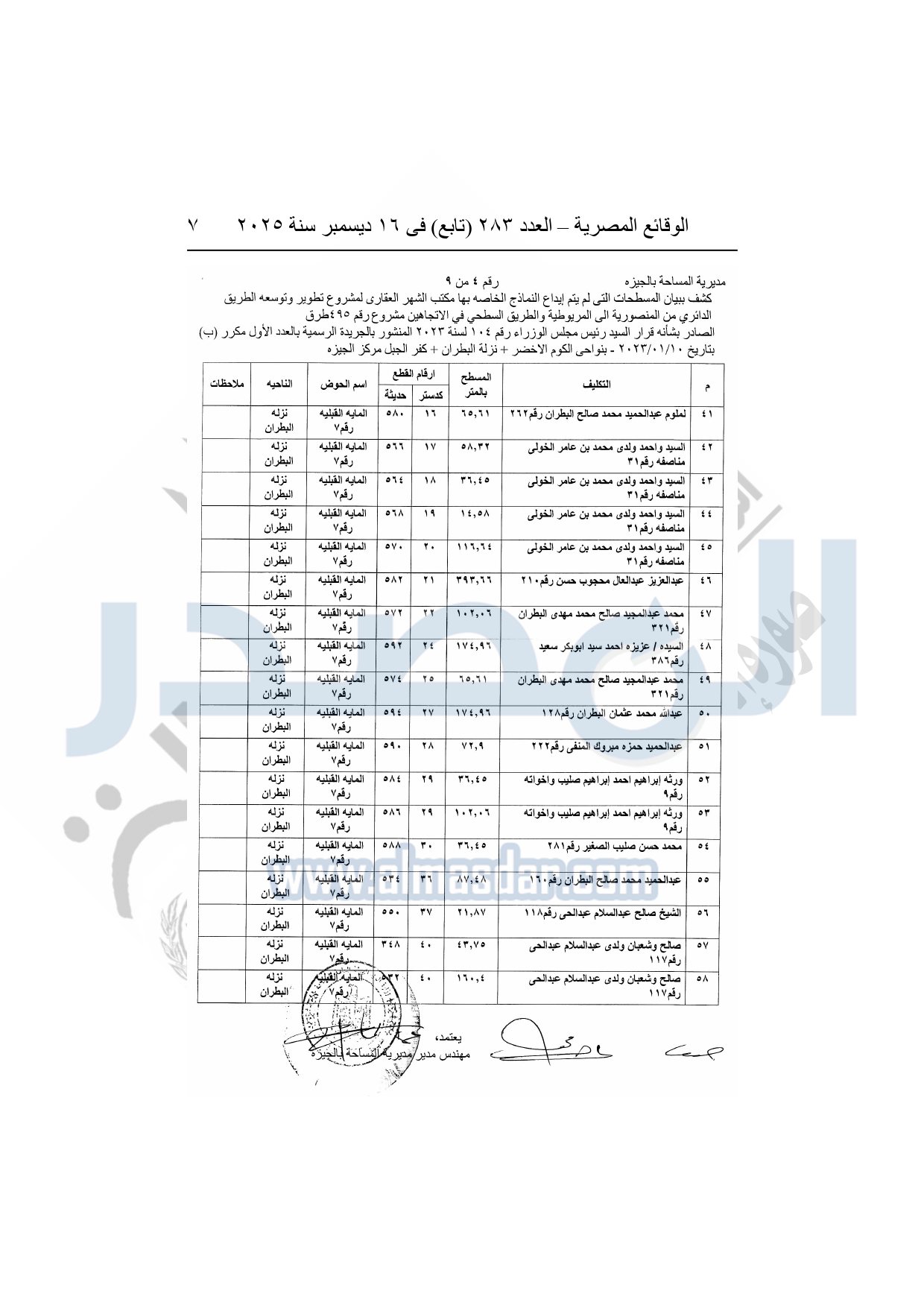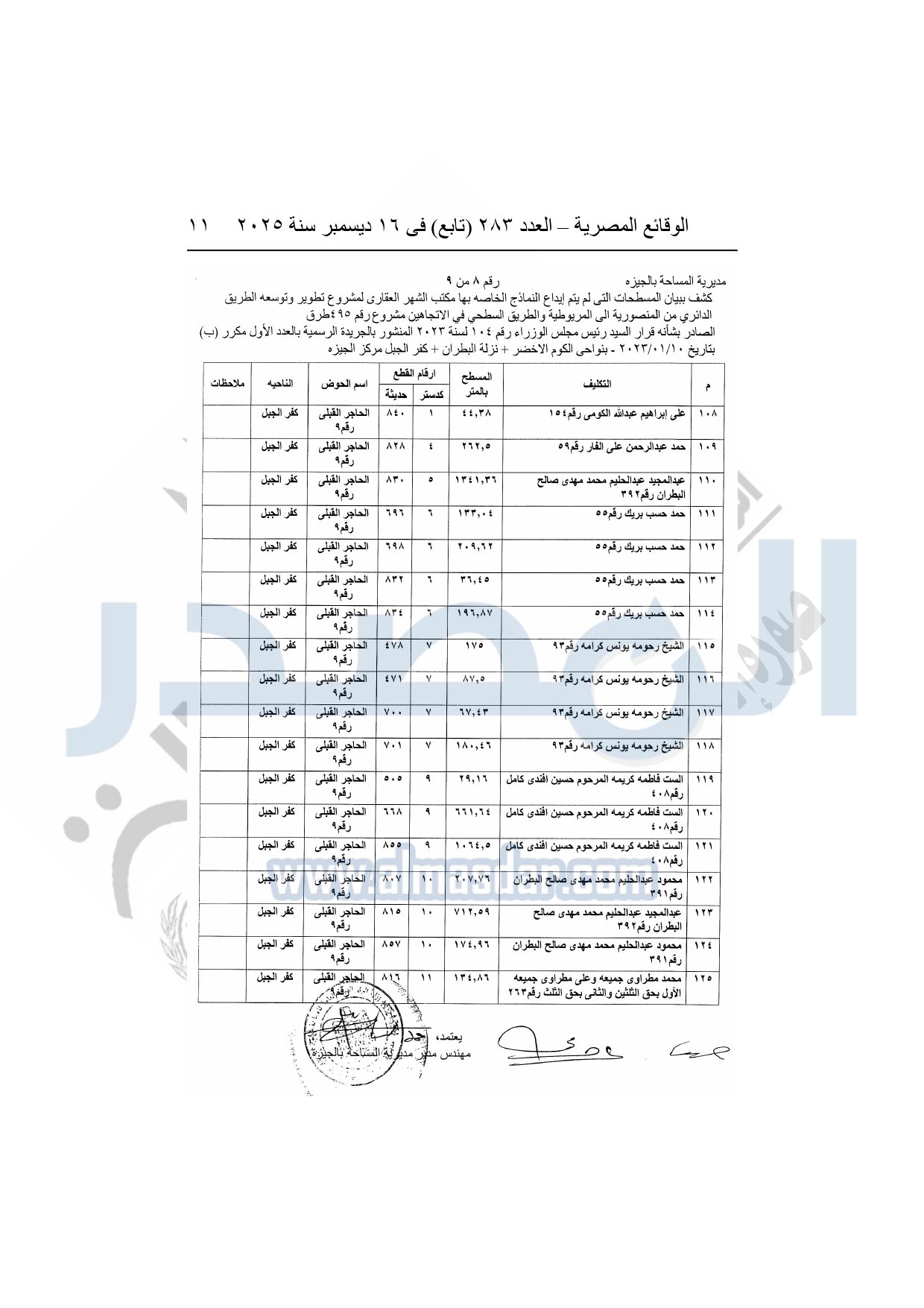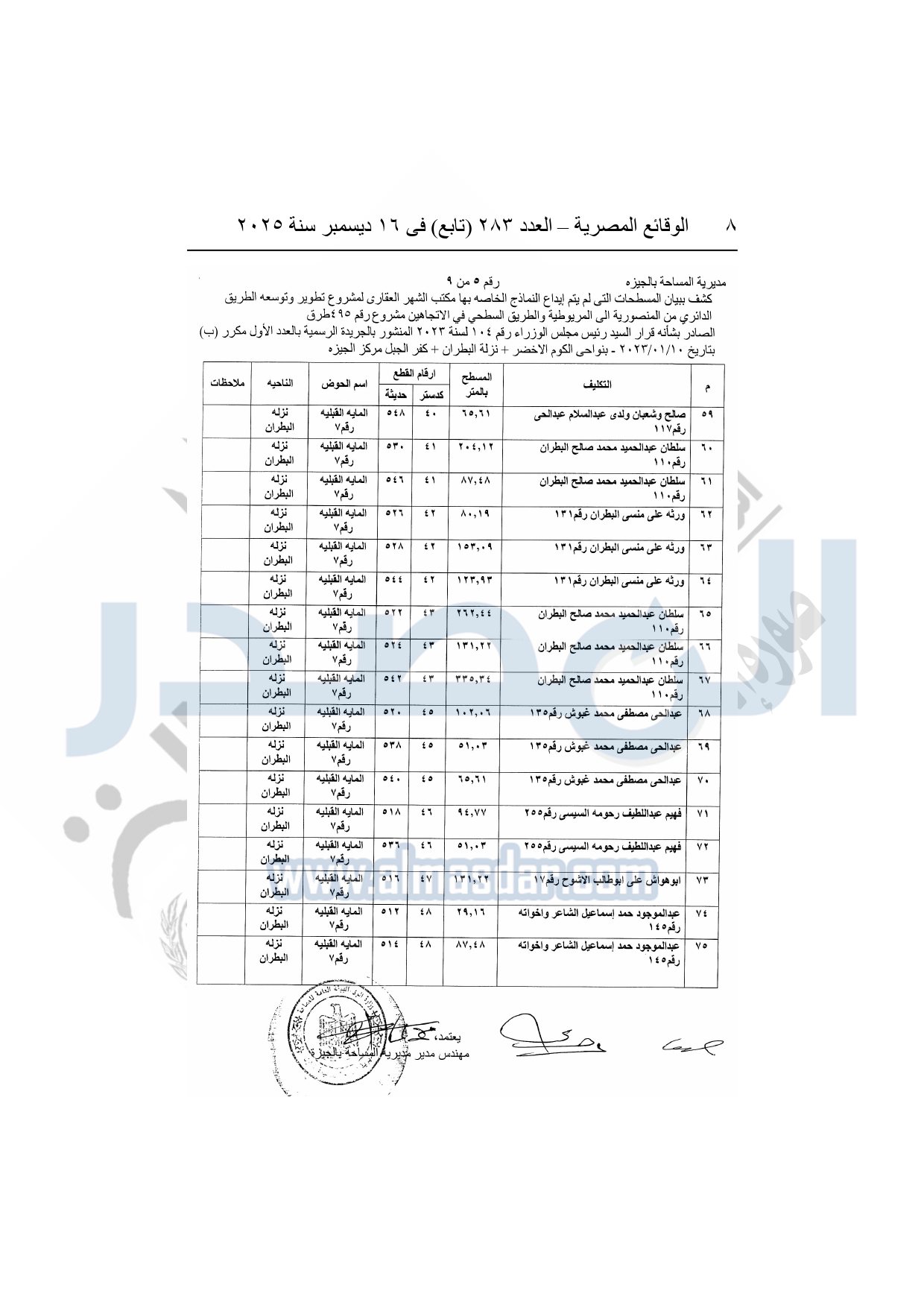 نشرت الوقائع المصرية، في العدد 283 "تابع"، الصادر في 16 ديسمبر سنة 2025، قرار وزارة النقل، رقم 7811 لسنة 2025، صادر في 7-11-2025، بشأن نزع ملكية أراضي وعقارات لتنفيذ مشروع تطوير وتوسعة الطريق الدائري بمحافظة الجيزة.