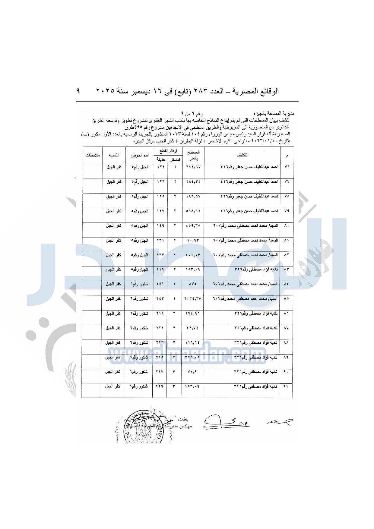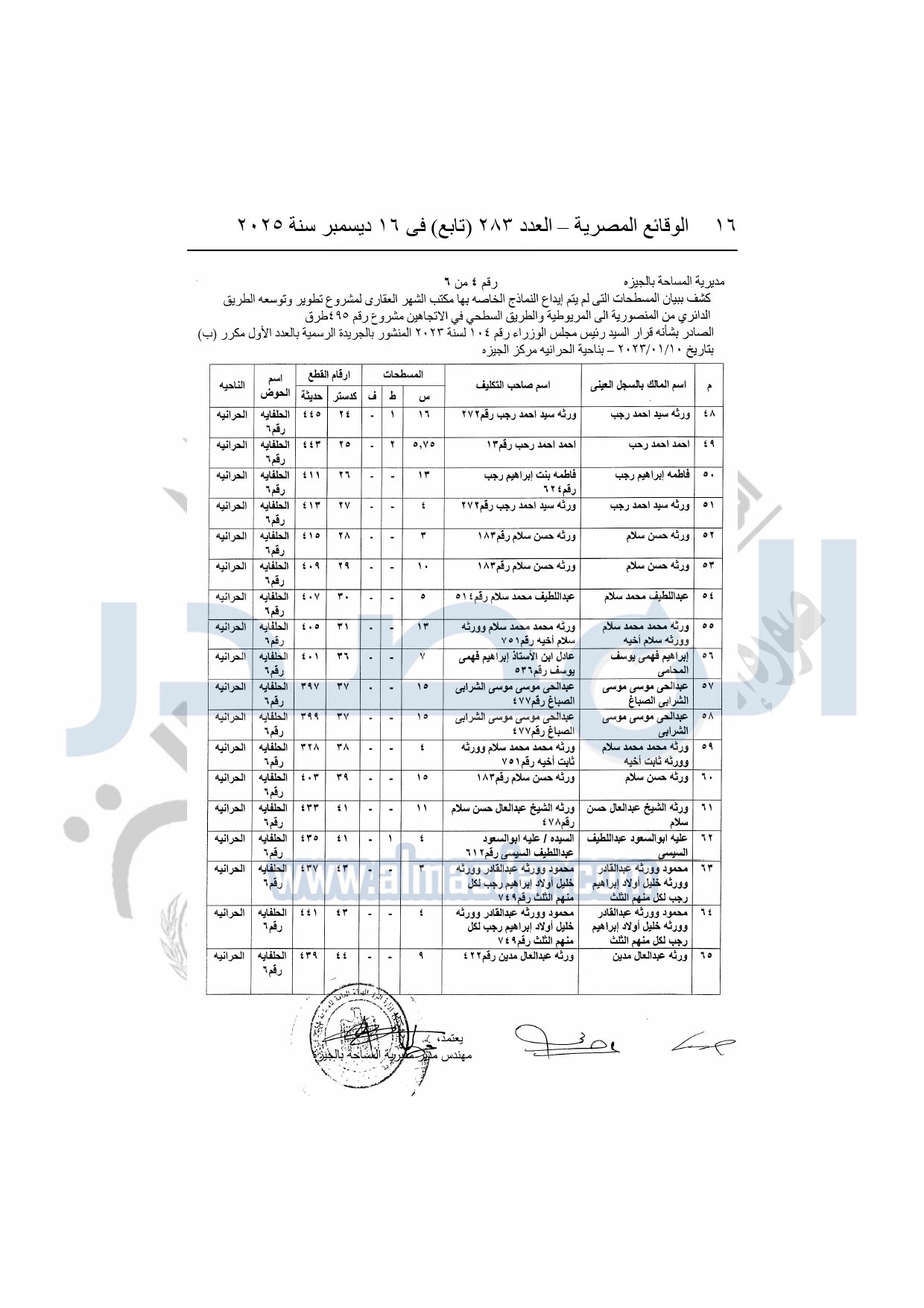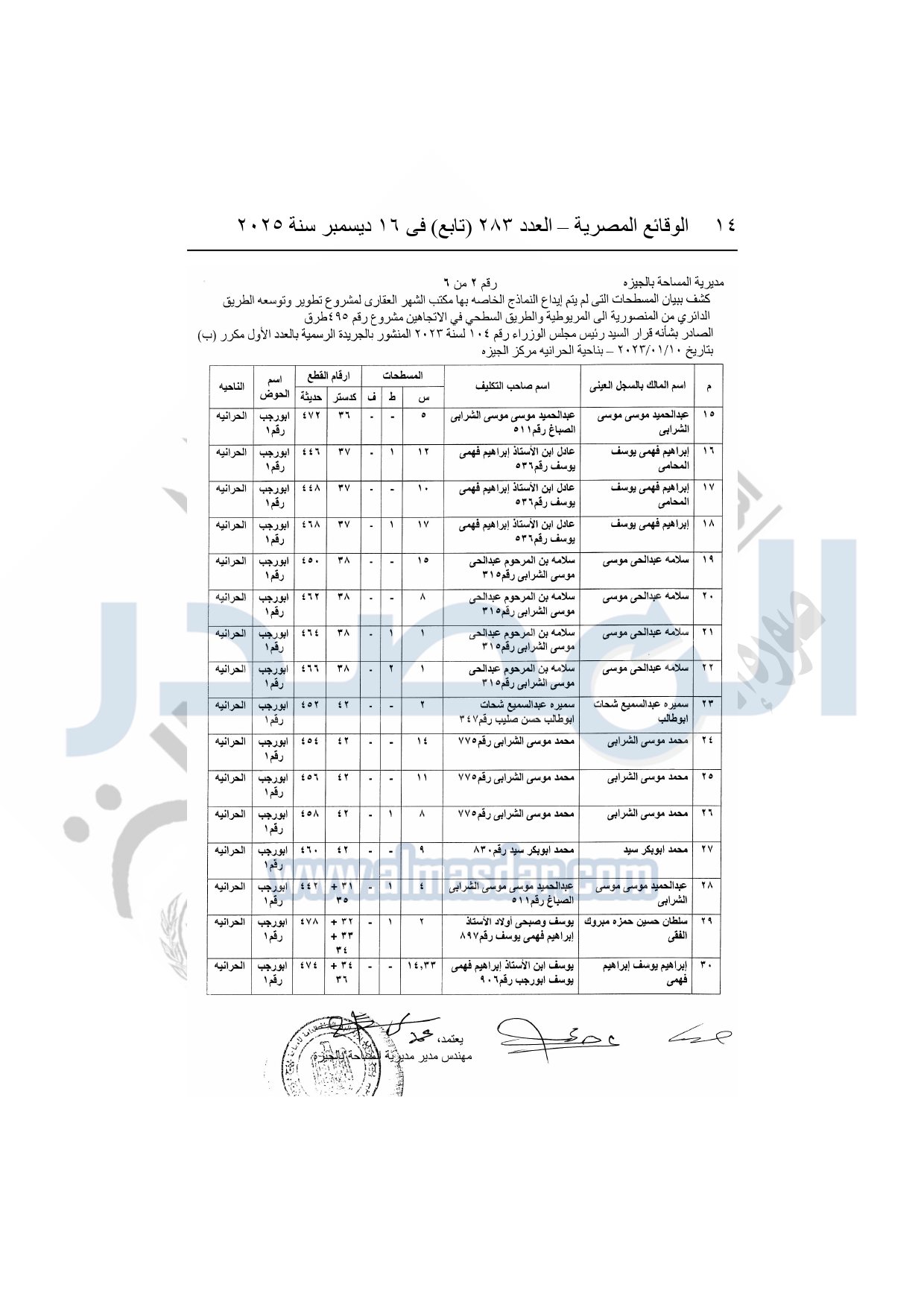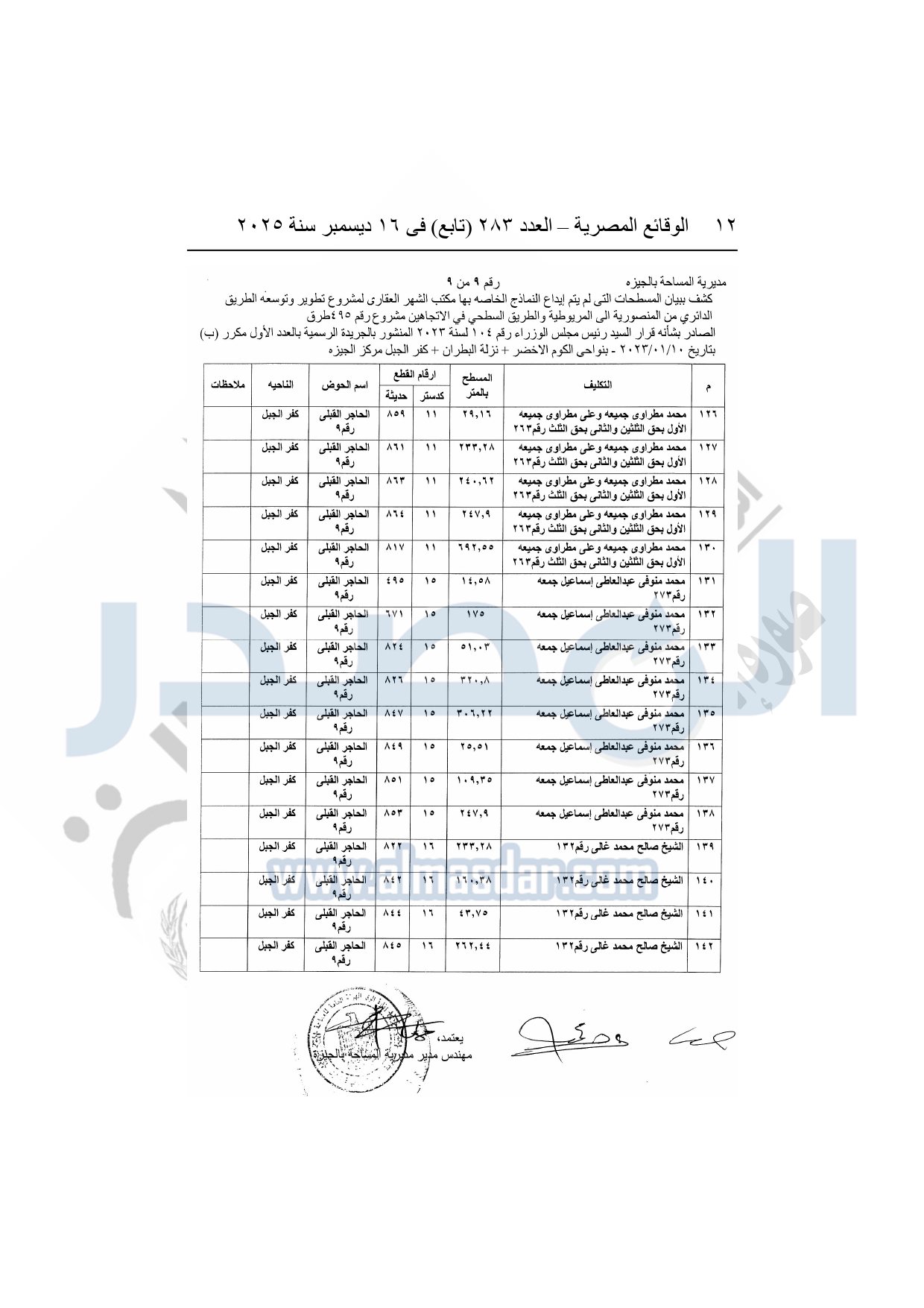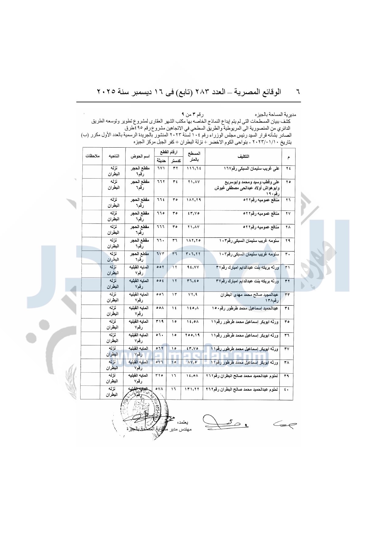 نشرت الوقائع المصرية، في العدد 283 "تابع"، الصادر في 16 ديسمبر سنة 2025، قرار وزارة النقل، رقم 7811 لسنة 2025، صادر في 7-11-2025، بشأن نزع ملكية أراضي وعقارات لتنفيذ مشروع تطوير وتوسعة الطريق الدائري بمحافظة الجيزة.