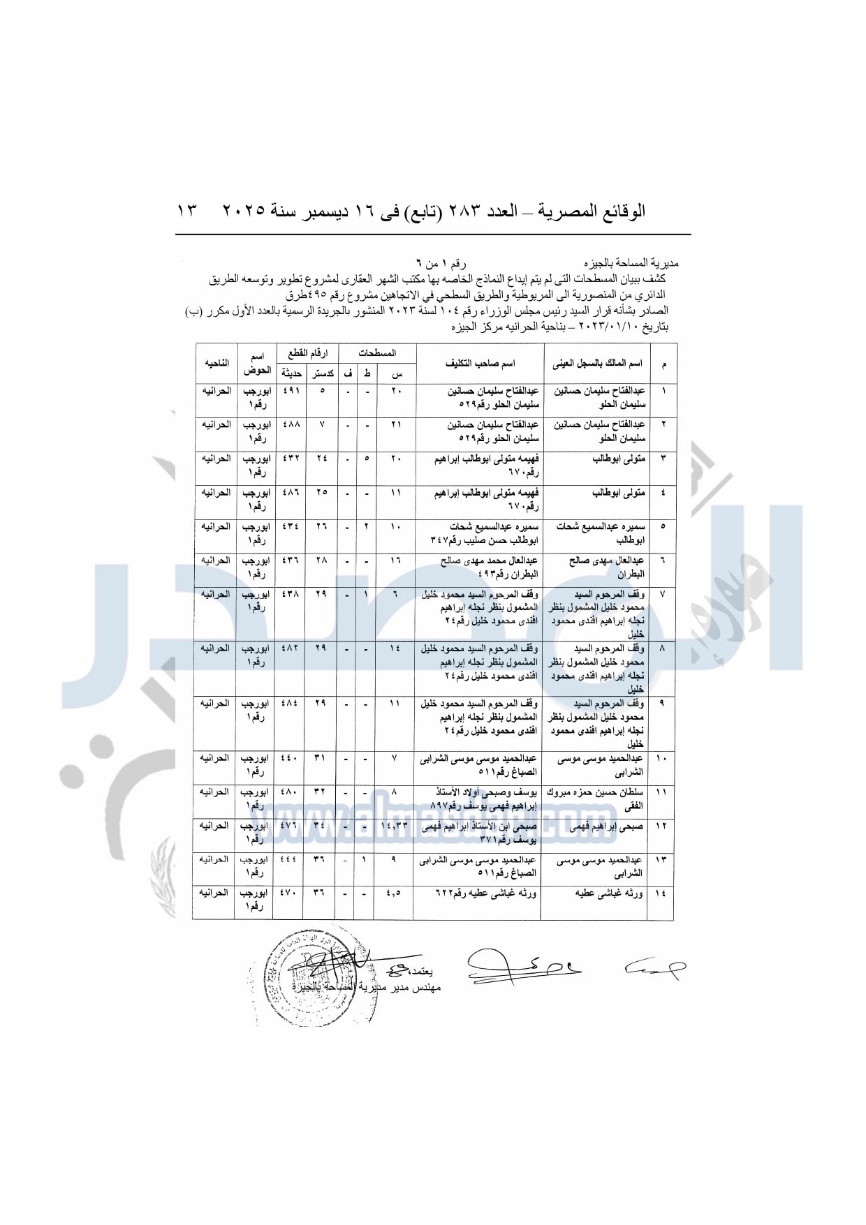 تنزع ملكية الأراضي والعقارات المبينة تفصيلا بالكشوف المرافقة لهذا القرار الواردة من مديرية المساحة بالجيزة لنواحي "الحرانية – الكوم الأخضر نزلة البطران - كفر الجبل" في نطاق محافظة الجيزة والتي تعذر توقيع أصحابها أو ذوي الشأن على النماذج الخاصة بنقل ملكيتها للمنفعة العامة تنفيذا لقرار رئيس مجلس الوزراء رقم 104 لسنة 2023 باعتبار مشروع تطوير وتوسعة الطريق الدائري من المنصورية إلى المريوطية والطريق السطحي في الاتجاهين في نطاق محافظة الجيزة من أعمال المنفعة العامة .