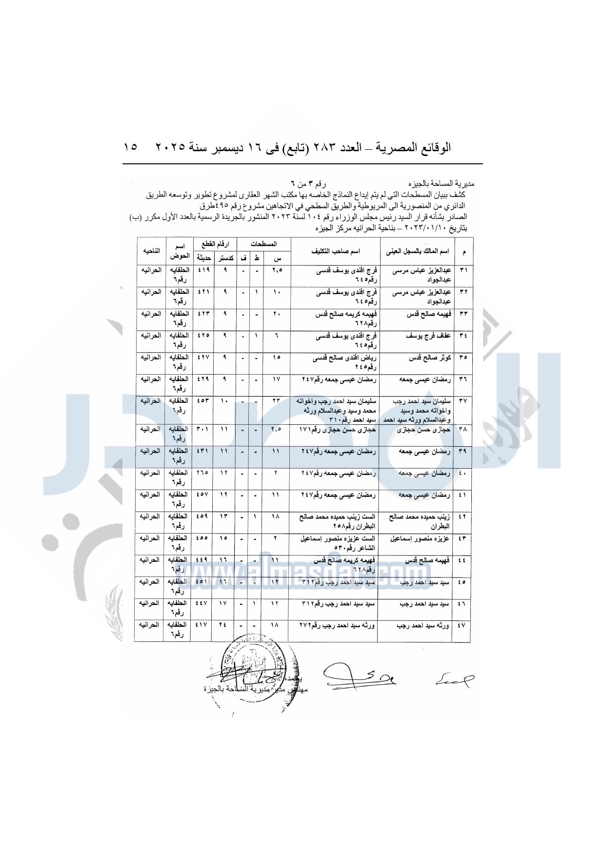 نزع ملكية أراضي وعقارات لتنفيذ مشروع تطوير وتوسعة الطريق الدائري بمحافظة الجيزة