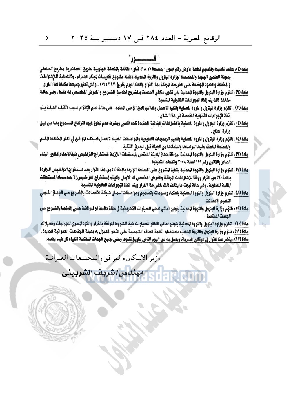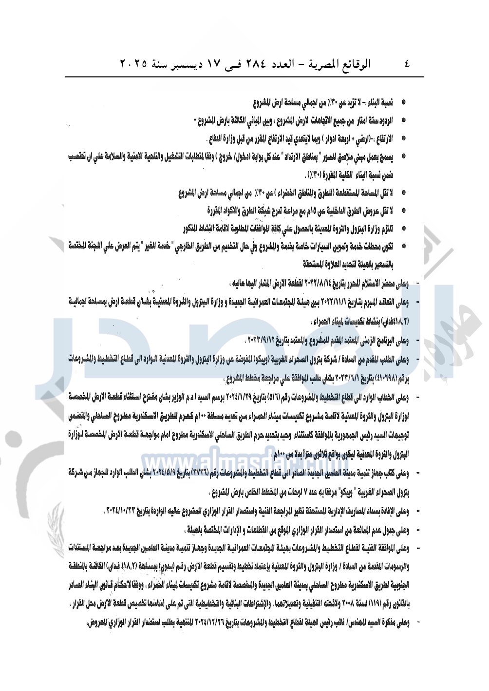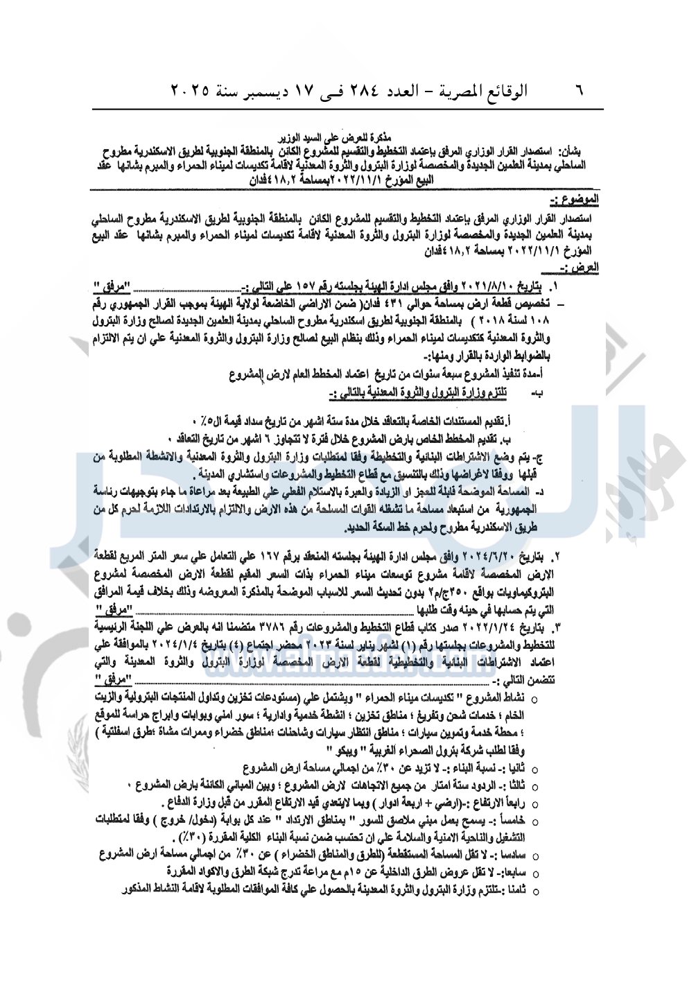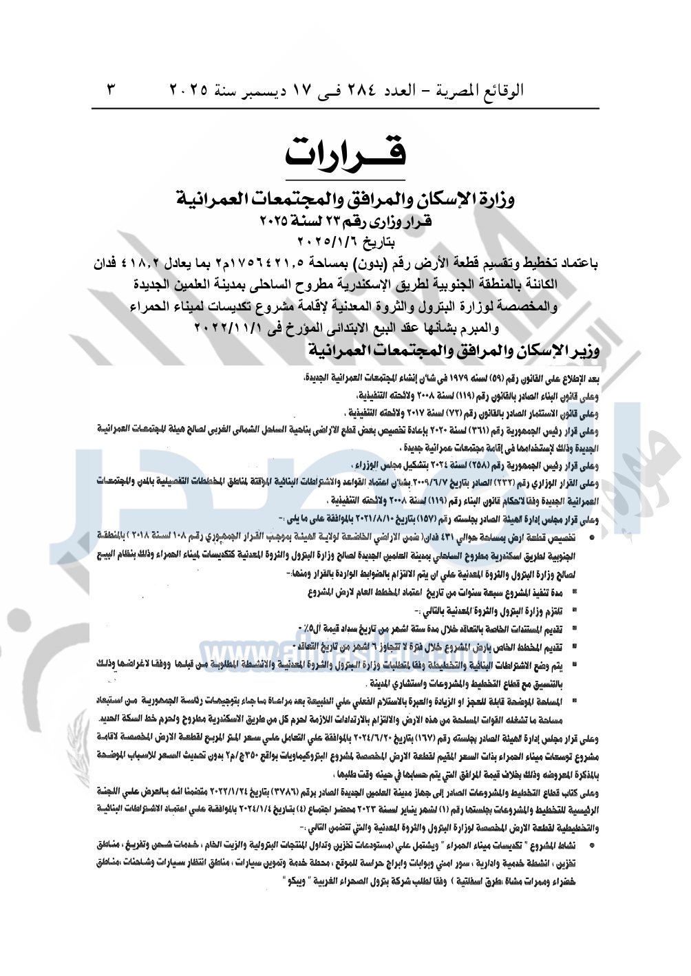 نشرت الوقائع المصرية، في العدد 284، الصادر في 17 ديسمبر سنة 2025، قرار وزارة الإسكان والمرافق والمجتمعات العمرانية، رقم 23 لسنة 2025، بتاريخ 6-1-2025، بشأن اعتماد تخطيط وتقسيم قطعة الأرض رقم "بدون" بمساحة 1756421.5م2 بما يعادل 418.2 فدان الكائنة بالمنطقة الجنوبية لطريق الإسكندرية مطروح الساحلى بمدينة العلمين الجديدة والمخصصة لوزارة البترول والثروة المعدنية لإقامة مشروع تكديسات لميناء الحمراء والمبرم بشأنها عقد البيع الابتدائى المؤرخ في 1-11-2022.